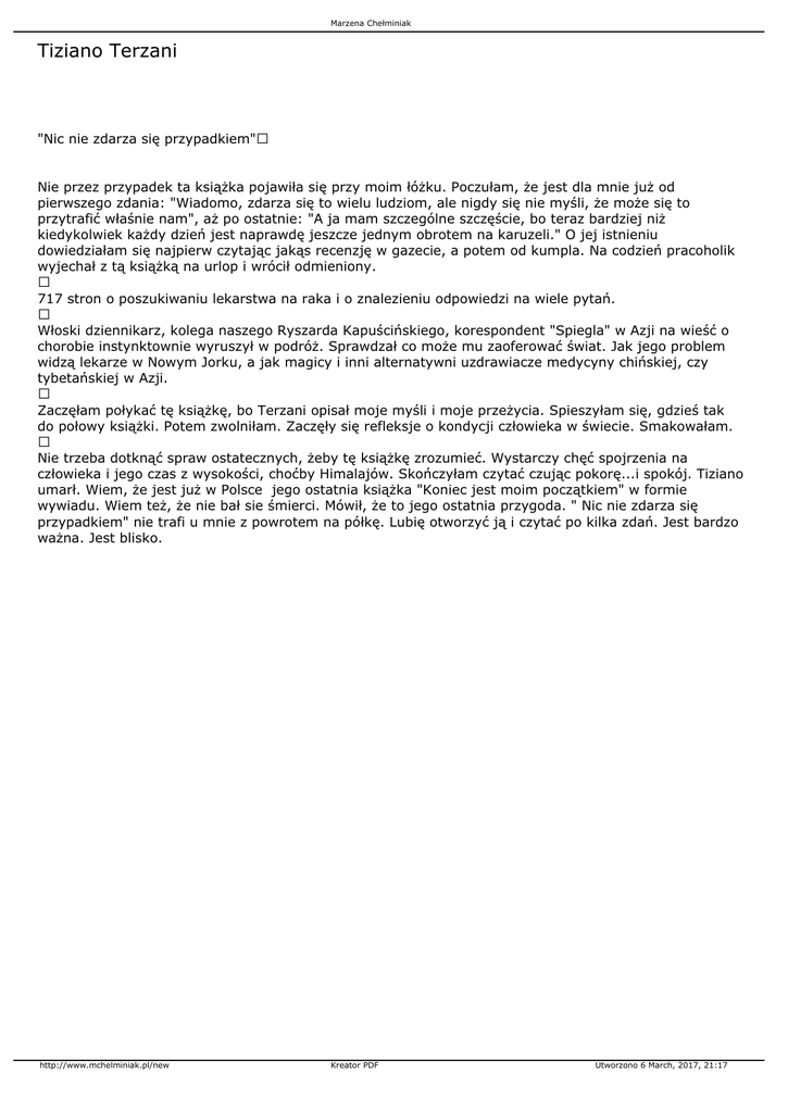 Marzena Chełminiak Tiziano Terzani "Nic nie zdarza się przypadkiem" Nie przez przypadek ta książka pojawiła się przy moim łóżku. Poczułam, że jest dla mnie już od pierwszego zdania: "Wiadomo, zdarza się to wielu ludziom, ale nigdy się nie myśli, że może się to przytrafić właśnie nam", aż po ostatnie: "A ja mam szczególne szczęście, bo teraz bardziej niż kiedykolwiek każdy dzień jest naprawdę jeszcze jednym obrotem na karuzeli." O jej istnieniu dowiedziałam się najpierw czytając jakąs recenzję w gazecie, a potem od kumpla. Na codzień pracoholik wyjechał z tą książką na urlop i wrócił odmieniony. 717 stron o poszukiwaniu lekarstwa na raka i o znalezieniu odpowiedzi na wiele pytań. Włoski dziennikarz, kolega naszego Ryszarda Kapuścińskiego, korespondent "Spiegla" w Azji na wieść o chorobie instynktownie wyruszył w podróż. Sprawdzał co może mu zaoferować świat. Jak jego problem widzą lekarze w Nowym Jorku, a jak magicy i inni alternatywni uzdrawiacze medycyny chińskiej, czy tybetańskiej w Azji. Zaczęłam połykać tę książkę, bo Terzani opisał moje myśli i moje przeżycia. Spieszyłam się, gdzieś tak do połowy książki. Potem zwolniłam. Zaczęły się refleksje o kondycji człowieka w świecie. Smakowałam. Nie trzeba dotknąć spraw ostatecznych, żeby tę książkę zrozumieć. Wystarczy chęć spojrzenia na człowieka i jego czas z wysokości, choćby Himalajów. Skończyłam czytać czując pokorę...i spokój. Tiziano umarł. Wiem, że jest już w Polsce jego ostatnia książka "Koniec jest moim początkiem" w formie wywiadu. Wiem też, że nie bał sie śmierci. Mówił, że to jego ostatnia przygoda. " Nic nie zdarza się przypadkiem" nie trafi u mnie z powrotem na półkę. Lubię otworzyć ją i czytać po kilka zdań. Jest bardzo ważna. Jest blisko. http://www.mchelminiak.pl/new Kreator PDF Utworzono 6 March, 2017, 21:17