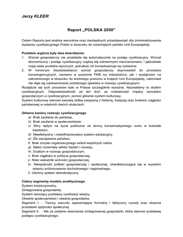 Jerzy KLEER Raport „POLSKA 2050” Celem Raportu jest analiza warunków oraz niezbędnych przedsięwzięć dla zminimalizowania dystansu cywilizacyjnego Polski w stosunku do rozwiniętych państw Unii Europejskiej. Punktem wyjścia były dwa twierdzenia: 1. Wzrost gospodarczy nie przekłada się automatycznie na postęp cywilizacyjny. Wzrost ekonomiczny i postęp cywilizacyjny rządzą się odmiennymi mechanizmami, i jakkolwiek mają wiele punktów stycznych, jednakże ich konsekwencje są rozbieżne. 2. W minionym dwudziestoleciu wzrost gospodarczy doprowadził do procesów konwergencyjnych, zarówno w poziomie PKB na mieszkańca, jak i wydajności na zatrudnionego w stosunku do średniego poziomu w krajach Unii Europejskiej, natomiast nie daje się zaobserwować podobnego zjawiska w rozwoju cywilizacyjnym. Rozejście się tych procesów było w Polsce szczególnie wyraźne. Nazwaliśmy to dryfem cywilizacyjnym. Odpowiedzialność za ten dryf, za rozbieżność między wzrostem gospodarczym a cywilizacyjnym, ponosi głównie system kulturowy. System kulturowy stanowi swoistą zbitkę związaną z historią, tradycją oraz brakiem ciągłości państwowej w ostatnich dwóch stuleciach. Główne bariery rozwoju cywilizacyjnego a/. Brak zaufania do państwa, b/. Brak zaufania w społeczeństwie: c/ Silny wpływ na życie publiczne ze strony konserwatywnego nurtu w kościele katolickim, d/. Nieefektywny i niedofinansowany system edukacyjny, e/. Źle zarządzane państwo, f/. Brak zmysłu organizacyjnego wokół wspólnych celów, g/. Słabo rozwinięty sektor badań i rozwoju, h/. Dualizm w rozwoju gospodarczym, i/. Brak ciągłości w polityce gospodarczej, j/. Niski wskaźnik wolności gospodarczej, k/. Niespójność polityki gospodarczej i społecznej, charakteryzująca się w wysokim stopniu zróżnicowania dochodowego i regionalnego, l/. Ułomny system demokratyczny Cztery segmenty modelu analitycznego System instytucjonalny, Zintegrowana gospodarka, System tworzący podstawy cywilizacji wiedzy, Otwarte społeczeństwo i otwarta gospodarka, Segment I. - Tworzy warunki zapewniające formalny i faktyczny rozwój oraz stwarza przesłanki spójności społecznej, Segment II. - Ma za zadanie stworzenie zintegrowanej gospodarki, która stanowi podstawę postępu cywilizacyjnego. Segment III. - Obejmuje główne ścieżki mające zapewnić minimalizowanie dystansu cywilizacyjnego, przez stworzenie podstaw cywilizacji wiedzy. Segment IV. - Ma odpowiedzieć na pytanie, jakie ma być społeczeństwo polskie około drugiej połowy XXI wieku. Trzy podstawowe kanony tworzące społeczeństwo oparte na nowoczesnej cywilizacji związanej z cywilizacją europejską czy szerzej euro-atlantycką to: Instytucje Edukacja w szerokim tego słowa rozumieniu System kulturowy INSTYTUCJE Powinny być w miarę stabilne, dostatecznie przejrzyste, wewnętrznie spójne, i przyjazne z punktu widzenia całego społeczeństwa. Dobre funkcjonowanie będzie miało miejsce wówczas, kiedy będą zarządzane przez kwalifikowany aparat administracyjny, na poziomie centralnym i lokalnym, w dużym stopniu niezależny od partii będących aktualnie u władzy. Dobre instytucje i sprawna, przyjazna administracja rodzą zaufanie do państwa, Poszanowanie prawa przez społeczeństwo jest jednym z kluczowych warunków postępu cywilizacyjnego. Zaufanie państwa do społeczeństwa jest efektem zaufania społeczeństwa do państwa i poszanowania prawa. Realizacja tych warunków stworzy dobry klimat dla legitymizowania zmian i reform, jakim będzie podlegać państwo i społeczeństwo w przyszłości EDUKACJA 1. Dobry, nowoczesny, powszechny system edukacyjny. Stworzenie takiego systemu wymaga czasu, środków, a także długofalowej wizji, uwzględniającej zmiany, jakim poddane będzie społeczeństwo i gospodarka. Nowoczesny system edukacyjny polega również na wyławianiu elit, których funkcją jest sterowanie nowoczesnym państwem i jego podmiotami. 2. . Sprawnie funkcjonujący i dobrze finansowany system badań i rozwoju. Nie chodzi tu tylko o zastosowanie wyników badań w gospodarce, czy innowacyjność rynkową tego systemu. Równie ważne, nawet decydujące, jest znaczenie kulturotwórcze tego systemu; SYSTEM KULTUROWY Stworzenie w ramach społeczeństwa konsensusu w zakresie dóbr i celów wspólnych (ogólnych), wykraczających poza interesy poszczególnych grup społecznych, politycznych i zawodowych. Akceptacja wspólnych, długookresowych celów czy zadań wymagająca zdolności wspólnego (grupowego) działania społecznego. Kreatywność grupowa musi zostać wzbogacona kreatywnością indywidualną. Zdolność do kompromisów Tolerancja ideologiczno-obyczajowa jako warunek funkcjonowania społeczeństwa w globalizującym się świecie, w którym ma miejsce przepływ towarów, usług, kapitału a także idei, oraz ludzi z różnych kręgów kulturowych. Scenariusze rozwoju Scenariusz realistyczny Scenariusz pozytywny Scenariusz zagrożeń Scenariusz realistyczny Oparty jest na założeniu, że świat toczy się bez istotnych zmian. W Polsce nadal dominuje polityka priorytetu dla wzrostu gospodarczego. Trwa w latach 2011-2020 walka głównych partii politycznych. W okresie późniejszym, pod wpływem wyborców, polityka może ulec zmianie. W scenariuszu tym analizowane są pojawiające się bariery, zarówno o charakterze ekonomiczno-społecznym dotyczące różnych aspektów rynku pracy, specyfiki systemu kulturowego w warunkach rewolucji informacyjnej itp. W scenariuszu tym pojawia się dosyć zasadnicze twierdzenie, ze bez istotnych zmian, głównie o charakterze instytucjonalnym i kulturowym, Polska pozostanie krajem drugiej kategorii i nie będzie jej stać na przezwyciężenie kompleksu peryferii. Scenariusz pozytywny Przyjmuje podobne przesłanki dotyczące uwarunkowań zewnętrznych, natomiast w stosunku do uwarunkowań wewnętrznych przyjmujemy założenia optymistyczne. Klasa polityczna w Polsce dokona z