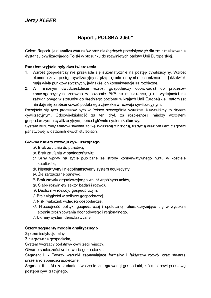 Prof. dr hab. Jerzy Kleer "raport Polska 2050"