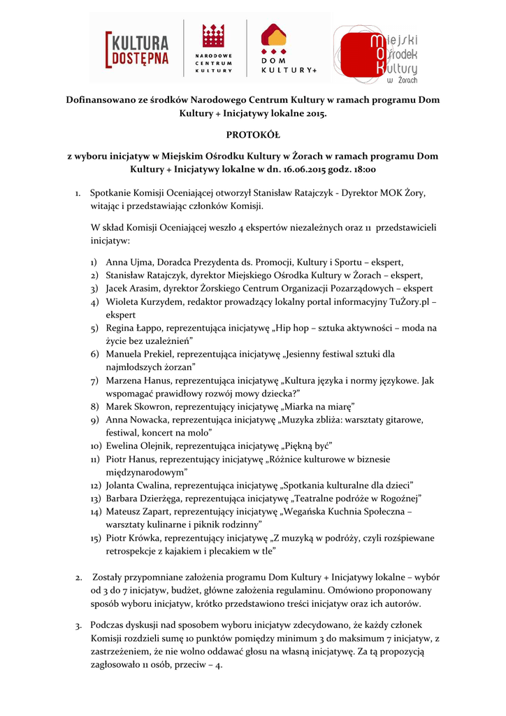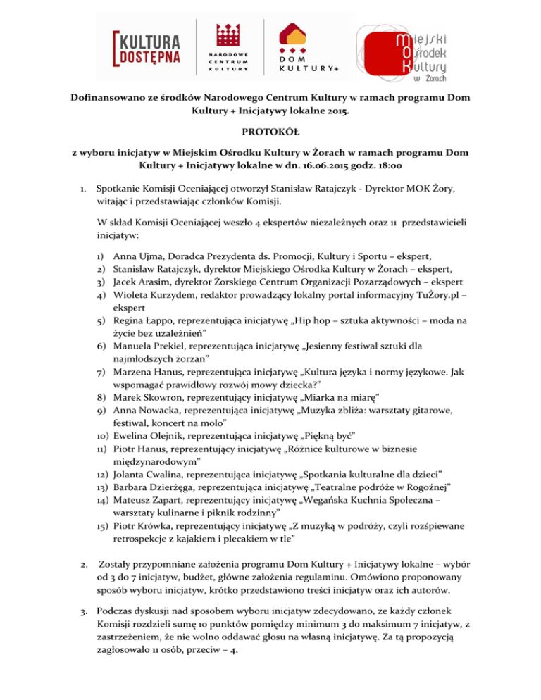Dofinansowano ze środków Narodowego Centrum Kultury w ramach programu Dom Kultury + Inicjatywy lokalne 2015. PROTOKÓŁ z wyboru inicjatyw w Miejskim Ośrodku Kultury w Żorach w ramach programu Dom Kultury + Inicjatywy lokalne w dn. 16.06.2015 godz. 18:00 1. Spotkanie Komisji Oceniającej otworzył Stanisław Ratajczyk - Dyrektor MOK Żory, witając i przedstawiając członków Komisji. W skład Komisji Oceniającej weszło 4 ekspertów niezależnych oraz 11 przedstawicieli inicjatyw: 1) 2) 3) 4) 5) 6) 7) 8) 9) 10) 11) 12) 13) 14) 15) 2. Anna Ujma, Doradca Prezydenta ds. Promocji, Kultury i Sportu – ekspert, Stanisław Ratajczyk, dyrektor Miejskiego Ośrodka Kultury w Żorach – ekspert, Jacek Arasim, dyrektor Żorskiego Centrum Organizacji Pozarządowych – ekspert Wioleta Kurzydem, redaktor prowadzący lokalny portal informacyjny TuŻory.pl – ekspert Regina Łappo, reprezentująca inicjatywę „Hip hop – sztuka aktywności – moda na życie bez uzależnień” Manuela Prekiel, reprezentująca inicjatywę „Jesienny festiwal sztuki dla najmłodszych żorzan” Marzena Hanus, reprezentująca inicjatywę „Kultura języka i normy językowe. Jak wspomagać prawidłowy rozwój mowy dziecka?” Marek Skowron, reprezentujący inicjatywę „Miarka na miarę” Anna Nowacka, reprezentująca inicjatywę „Muzyka zbliża: warsztaty gitarowe, festiwal, koncert na molo” Ewelina Olejnik, reprezentująca inicjatywę „Piękną być” Piotr Hanus, reprezentujący inicjatywę „Różnice kulturowe w biznesie międzynarodowym” Jolanta Cwalina, reprezentująca inicjatywę „Spotkania kulturalne dla dzieci” Barbara Dzierżęga, reprezentująca inicjatywę „Teatralne podróże w Rogoźnej” Mateusz Zapart, reprezentujący inicjatywę „Wegańska Kuchnia Społeczna – warsztaty kulinarne i piknik rodzinny” Piotr Krówka, reprezentujący inicjatywę „Z muzyką w podróży, czyli rozśpiewane retrospekcje z kajakiem i plecakiem w tle” Zostały przypomniane założenia programu Dom Kultury + Inicjatywy lokalne – wybór od 3 do 7 inicjatyw, budżet, główne założenia regulaminu. Omówiono proponowany sposób wyboru inicjatyw, krótko przedstawiono treści inicjatyw oraz ich autorów. 3. Podczas dyskusji nad sposobem wyboru inicjatyw zdecydowano, że każdy członek Komisji rozdzieli sumę 10 punktów pomiędzy minimum 3 do maksimum 7 inicjatyw, z zastrzeżeniem, że nie wolno oddawać głosu na własną inicjatywę. Za tą propozycją zagłosowało 11 osób, przeciw – 4. Dofinansowano ze środków Narodowego Centrum Kultury w ramach programu Dom Kultury + Inicjatywy lokalne 2015. 4. Postanowiono, że każdy z autorów dokona krótkiej prezentacji swojej inicjatywy i odpowie na pytania Komisji. 5. Po prezentacjach odbyło się głosowanie na kartach do głosowania. Przyznane przez poszczególnych członków Komicji punkty przeniesiono na tablicę zbiorczą, co dało następujące wyniki: „Muzyka zbliża: warsztaty gitarowe, festiwal, koncert na molo” – 28 pkt. „Hip hop – sztuka aktywności – moda na życie bez uzależnień” – 21 pkt. „Wegańska Kuchnia Społeczna – warsztaty kulinarne i piknik rodzinny” – 21 pkt. „Teatralne podróże w Rogoźnej” – 20 pkt. „Z muzyką w podróży, czyli rozśpiewane retrospekcje z kajakiem i plecakiem w tle”- 20 pkt. „Spotkania kulturalne dla dzieci” – 12 pkt. „Jesienny festiwal sztuki dla najmłodszych żorzan” – 9 pkt. „Różnice kulturowe w biznesie międzynarodowym” – 9 pkt. „Kultura języka i normy językowe. Jak wspomagać prawidłowy rozwój mowy dziecka?” – 7 pkt. „Miarka na miarę” – 2 pkt. „Piękną być” – 1 pkt. 6. Przeprowadzono negocjacje dotyczące budżetu inicjatyw. 7. Do realizacji ostatecznie wybrano 6 najwyżej punktowanych inicjatyw: Tytuł inicjatywy Autor Hip hop – sztuka aktywności – moda na życie bez uzależnień Remigiusz Łappo Muzyka zbliża: warsztaty gitarowe, festiwal, koncert na molo Anna Nowacka Spotkania kulturalne dla dzieci Jolanta Cwalina Teatralne podróże w Rogoźnej Barbara Dzierżęga Wegańska Kuchnia Społeczna – warsztaty kulinarne i piknik rodzinny Mateusz Zapart Z muzyką w podróży, czyli rozśpiewane retrospekcje z kajakiem i plecakiem w tle Piotr Krówka