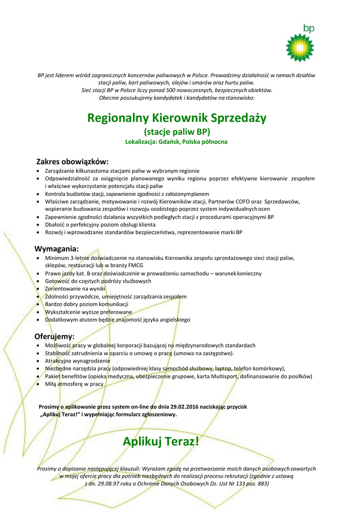 BP jest liderem wśród zagranicznych koncernów paliwowych w Polsce. Prowadzimy działalność w ramach działów stacji paliw, kart paliwowych, olejów i smarów oraz hurtu paliw. Sieć stacji BP w Polsce liczy ponad 500 nowoczesnych, bezpiecznych obiektów. Obecnie poszukujemy kandydatek i kandydatów na stanowisko: Regionalny Kierownik Sprzedaży (stacje paliw BP) Lokalizacja: Gdańsk, Polska północna Zakres obowiązków: Zarządzanie kilkunastoma stacjami paliw w wybranym regionie Odpowiedzialność za osiągnięcie planowanego wyniku regionu poprzez efektywne kierowanie zespołem i właściwe wykorzystanie potencjału stacji paliw Kontrola budżetów stacji, zapewnienie zgodności z założonym planem Właściwe zarządzanie, motywowanie i rozwój Kierowników stacji, Partnerów COFO oraz Sprzedawców, wspieranie budowania zespołów i rozwoju osobistego poprzez system indywidualnych ocen Zapewnienie zgodności działania wszystkich podległych stacji z procedurami operacyjnymi BP Dbałość o perfekcyjny poziom obsługi klienta Rozwój i wprowadzanie standardów bezpieczeństwa, reprezentowanie marki BP Wymagania: Minimum 3-letnie doświadczenie na stanowisku Kierownika zespołu sprzedażowego sieci stacji paliw, sklepów, restauracji lub w branży FMCG Prawo jazdy kat. B oraz doświadczenie w prowadzeniu samochodu – warunek konieczny Gotowość do częstych podróży służbowych Zorientowanie na wyniki Zdolności przywódcze, umiejętność zarządzania zespołem Bardzo dobry poziom komunikacji Wykształcenie wyższe preferowane Dodatkowym atutem będzie znajomość języka angielskiego Oferujemy: Możliwość pracy w globalnej korporacji bazującej na międzynarodowych standardach Stabilność zatrudnienia w oparciu o umowę o pracę (umowa na zastępstwo). Atrakcyjne wynagrodzenie Niezbędne narzędzia pracy (odpowiedniej klasy samochód służbowy, laptop, telefon komórkowy), Pakiet benefitów (opieka medyczna, ubezpieczenie grupowe, karta Multisport, dofinansowanie do posiłków) Miłą atmosferę w pracy Prosimy o aplikowanie przez system on-line do dnia 29.02.2016 naciskając przycisk „Aplikuj Teraz!” i wypełniając formularz zgłoszeniowy. Aplikuj Teraz! Prosimy o dopisanie następującej klauzuli: Wyrażam zgodę na przetwarzanie moich danych osobowych zawartych w mojej ofercie pracy dla potrzeb niezbędnych do realizacji procesu rekrutacji (zgodnie z ustawą z dn. 29.08.97 roku o Ochronie Danych Osobowych Dz. Ust Nr 133 poz. 883)