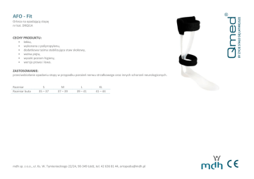 AFO - Fit Orteza na opadającą stopę nr kat. DRQI1A CECHY PRODUKTU: • • • • • • lekka, wykonana z polipropylenu, dodatkowa taśma stabilizująca staw skokowy, wolna pięta, wysoki poziom higieny, wersja prawa i lewa. ZASTOSOWANIE: przeciwdziałanie opadaniu stopy w przypadku porażeń nerwu strzałkowego oraz innych schorzeń neurologicznych. Rozmiar Rozmiar buta S 35 – 37 M 37 – 39 L 39 – 41 XL 41 – 44 mdh sp. z o.o., ul. Ks. W. Tymienieckiego 22/24, 90-349 Łódź, tel. 42 636 81 44, [email protected]