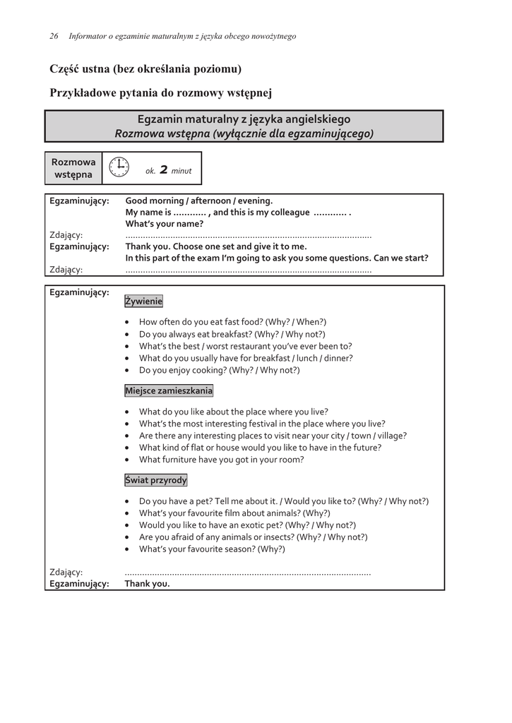 26 Informator o egzaminie maturalnym z jĊzyka obcego nowoĪytnego CzĊĞü ustna (bez okreĞlania poziomu) Przykładowe pytania do rozmowy wstĊpnej ¸ ¸ȋϦ ¦ Ȍ ¸ Ǥ ͚ ¦ ǣ ¦ ǣ ¦ ǣ ¦ ǣ ȀȀǤ ǥǥǥǥǡ ǥǥǥǥǤ ǯǫ ǥǥǥǥǥǥǥǥǥǥǥǥǥǥǥǥǥǥǥǥǥǥǥǥǥǥǥǥǥǥǥǥǥ ǤǤ ǯǤǫ ǥǥǥǥǥǥǥǥǥǥǥǥǥǥǥǥǥǥǥǥǥǥǥǥǥǥǥǥǥǥǥǥǥ ¦ ǣ • • • • • ǫȋǫȀǫȌ ǫȋǫȀǫȌ ǯȀǯǫ Ȁ Ȁǫ ǫȋǫȀǫȌ • • • • • ǫ ǯ ǫ ȀȀǫ ǫ ǫ c ¦ ǣ ¦ ǣ • ǫǤȀǫȋǫȀǫȌ • ǯǫȋǫȌ • ǫȋǫȀǫȌ • ǫȋǫȀǫȌ • ǯǫȋǫȌ ǥǥǥǥǥǥǥǥǥǥǥǥǥǥǥǥǥǥǥǥǥǥǥǥǥǥǥǥǥǥǥǥǥ Ǥ JĊzyk angielski Przykładowe zestawy egzaminacyjne ͙ ¸ ¦ • • Ï • ͙ ͛ Przebywając za granicą doznałeĞ/łaĞ kontuzji w czasie zajĊü sportowych. JesteĞ u lekarza. PoniĪej podane są 4 kwestie, które musisz omówiü w rozmowie z egzaminującym. Objawy OkolicznoĞci zdarzenia Wpływ kontuzji na Twoje najbliĪsze plany RozmowĊ rozpoczyna egzaminujący. ͚ ͜ Zalecenia i nastĊpna wizyta 27 28 Informator o egzaminie maturalnym z jĊzyka obcego nowoĪytnego ͙ ͛ ¸ ¦ • • Ï • ͝ Popatrz na ZdjĊcie 1, ZdjĊcie 2 i ZdjĊcie 3. Twój chłopak / Twoja dziewczyna pochodzi z Wielkiej Brytanii. Odwiedzają CiĊ jego/jej rodzice, których chcesz zaprosiü do restauracji. Masz do wyboru trzy miejsca. • Wybierz tĊ restauracjĊ, która bĊdzie, Twoim zdaniem, najbardziej odpowiednia, i uzasadnij swój wybór. • WyjaĞnij, dlaczego odrzucasz pozostałe propozycje. ZdjĊcie 1 ZdjĊcie 2 ZdjĊcie 3 JĊzyk angielski ͙ 29 ¸ ¦ • • Ï • ͙ ͛ ¦ ǣ ȏ¸©¦ ǤȐǯ͙ǤǤ ǤǤ ¦ ǣ ε͛͘ ¦ ǣ ȏÏǤ͛͘ǡ¸Ȃä Ȃ©ǣǫȐ Wersja dla zdającego Przebywając za granicą doznałeĞ/łaĞ kontuzji w czasie zajĊü sportowych. JesteĞ u lekarza. PoniĪej podane są 4 kwestie, które musisz omówiü w rozmowie z egzaminującym. OkolicznoĞci zdarzenia Objawy Zalecenia i nastĊpna wizyta Wpływ kontuzji na Twoje najbliĪsze plany RozmowĊ rozpoczyna egzaminujący. Dodatkowe uwagi dla egzaminującego Jest Pan/Pani lekarzem. Zgłasza siĊ do Pana/Pani zdający, który doznał kontuzji. ProszĊ porozmawiaü ze zdającym. Rozpoczyna Pan/Pani rozmowĊ. W zaleĪnoĞci od tego, jak potoczy siĊ rozmowa, proszĊ włączyü do rozmowy wszystkie/wybrane punkty. Æ ProszĊ poprosiü zdającego o dokładniejsze objaĞnienie jakiejĞ kwestii. Æ ProszĊ grzecznie nie zgodziü siĊ ze zdającym, tak aby musiał podaü kolejne argumenty lub zaproponowaü inne rozwiązanie. Æ Zdający nie moĪe wychodziü z domu / długo chodziü. Æ ProszĊ dowiedzieü siĊ, czy zdającym ma siĊ kto opiekowaü. Æ W nastĊpnym tygodniu wyjeĪdĪa Pan /Pani na urlop. ¦ ¦ ǣ ε͚Ǥ ǥǥǥǥǥǥǥǥǥǥǥǥǥǥǥǥǥǥǥǥǥǥǥǥǤǤǤǤǤǤǤǤǤǤǤǤǤǤǤǤǤǤǤǤǤǤǤǤǤǥǥǥǥǥǥǥǥǥǥ ¦ ǣ Ǥ ǯ͚Ǥ ȏæ ǡ¸¸© ¦ ǡĂĂä ǤȐ ǯ͛Ǥ ȏæ ǣǤǤȐ 30 Informator o egzaminie maturalnym z jĊzyka obcego nowoĪytnego ͙ ¸ ¦ • • Ï • ͚ ¦ ǣ ͜ Ǥ ȏÏǤ͙͘ǡ¸Ȃä Ȃ©ǣ ǫȐ Wersja dla zdającego ¦ ǣ ε͙Ǥ ǥǥǥǥǥǥǥǥǥǥǥǥǥǥǥǥǥǥǥǥǥǥǥǥǥǥǥǥǥǥǥǥǤ ¦ ǣ ǤǤ Pytania dla egzaminującego 1. ǫȋǫȀ ǫȌ 2. ǫȋǫǫȌ 3. ǫ ¦ ǣ ε͛Ǥ ǥǥǥǥǥǥǥǥǥǥǥǥǥǥǥǥǥǥǥǥǥǥǥǥǥǥǥǥǥǥǥǥǥ ¦ ǣ Ǥ ǯ͛Ǥ ȏæ ǣǤ ǤȐ JĊzyk angielski 31 ͙ ¸ ¦ • • Ï • ͛ ͝ ¦ ǣ ǯǤ Ǥ ¦ ǣ ͙Ǥ ¦ ǣ ȏÏǤǡ¸Ȃä Ȃ©ǣǫȐ Wersja dla zdającego Popatrz na ZdjĊcie 1, ZdjĊcie 2 i ZdjĊcie 3. Twój chłopak / Twoja dziewczyna pochodzi z Wielkiej Brytanii. Odwiedzają CiĊ jego/jej rodzice, których chcesz zaprosiü do restauracji. Masz do wyboru trzy miejsca. • Wybierz tĊ restauracjĊ, która bĊdzie, Twoim zdaniem, najbardziej odpowiednia i uzasadnij swój wybór. • WyjaĞnij, dlaczego odrzucasz pozostałe propozycje. ZdjĊcie 1 ZdjĊcie 2 ZdjĊcie 3 ¦ ǣ ε͚Ǥ ǥǥǥǥǥǥǥǥǥǥǥǥǥǥǥǥǥǥǥǥǥǥǥǥǥǥǥǥǥǥǥǥǥǥǥǥǥǥ ¦ ǣ ǤǤ Pytania dla egzaminującego ¸©¦ Ă Ñǣ ͙Ǥ ͚Ǥ ͛Ǥ ͜Ǥ ǫȋǫȀǫȌ ǫ ǫȋǫȀǫȌ ǫ ¦ ǣ ε͚Ǥ ǥǥǥǥǥǥǥǥǥǥǥǥǥǥǥǥǥǥǥǥǥǥǥǥǥǥǥǥǥǥǥǥǥǥǤǤǤǤǤǤǤǤǤǤǤǤǤǤ ¦ ǣ ǤǤ 32 Informator o egzaminie maturalnym z jĊzyka obcego nowoĪytnego ͚ ¸ ¦ • ×Ă • • ͙ ͛ JesteĞ na wakacjach u znajomego/znajomej za granicą. Wspólnie ustalacie plan wycieczki po mieĞcie. PoniĪej podane są 4 kwestie, które musisz omówiü w rozmowie z egzaminującym. Posiłki Zakupy Zwiedzanie Transport RozmowĊ rozpoczyna egzaminujący. ͚ ͜ JĊzyk angielski ͚ ¸ ¦ • ×Ă • • ͛ ͝ Popatrz na Plakat 1 i Plakat 2. Wspólnie z grupą kolegów z klasy postanowiliĞcie przygotowaü kampaniĊ mającą na celu ratowanie lasów. WyraĨ swoje zdanie na temat poniĪszych projektów plakatów do kampanii. • Wybierz ten plakat, który bĊdzie, Twoim zdaniem, bardziej odpowiedni, i uzasadnij swój wybór. • WyjaĞnij, dlaczego odrzucasz drugą propozycjĊ. Plakat 2 Plakat 1 33 34 Informator o egzaminie maturalnym z jĊzyka obcego nowoĪytnego ͚ ¸ ¦ • ×Ă • • ͙ ͛ ¦ ǣ ȏ¸©¦ ǤȐǯ͙ǤǤ ǤǤ ¦ ǣ ε͛͘Ǥ ¦ ǣ ȏÏǤ͛͘ǡ¸Ȃä Ȃ©ǣǫȐ Wersja dla zdającego JesteĞ na wakacjach u znajomego/znajomej za granicą. Wspólnie ustalacie plan wycieczki po mieĞcie. PoniĪej podane są 4 kwestie, które musisz omówiü w rozmowie z egzaminującym. Posiłki Zwiedzanie Zakupy Transport RozmowĊ rozpoczyna egzaminujący. Dodatkowe uwagi dla egzaminującego Jest Pan kolegą / Pani koleĪanką zdającego, który przyjechał do Pana/Pani na wakacje. Wspólnie ustalacie plan wycieczki po mieĞcie. Pan/Pani rozpoczyna rozmowĊ. W zaleĪnoĞci od tego, jak potoczy siĊ rozmowa, proszĊ włączyü do rozmowy wszystkie/wybrane punkty. Æ ProszĊ poprosiü zdającego o dokładniejsze objaĞnienie jakiejĞ kwestii. Æ ProszĊ grzecznie nie zgodziü siĊ ze zdającym, tak aby musiał podaü kolejn