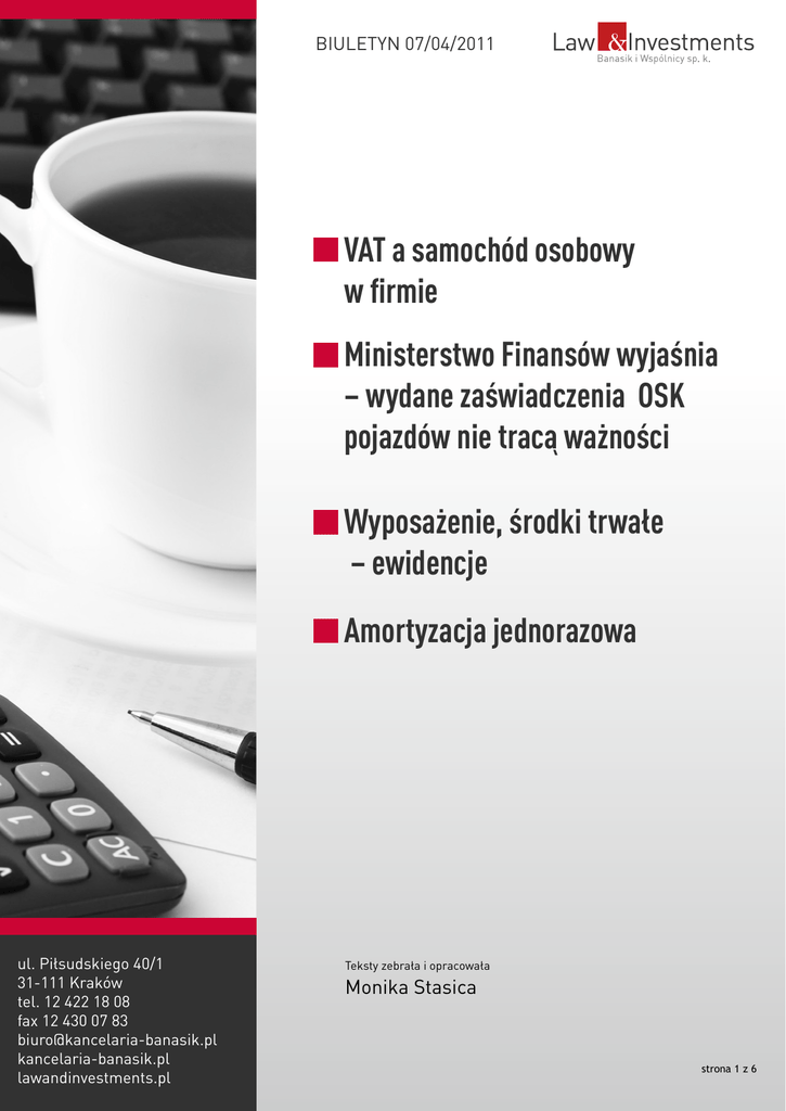 BIULETYN 07/04/2011 VAT a samochód osobowy w firmie Ministerstwo Finansów wyjaśnia – wydane zaświadczenia OSK pojazdów nie tracą ważności Wyposażenie, środki trwałe – ewidencje Amortyzacja jednorazowa ul. Piłsudskiego 40/1 31-111 Kraków tel. 12 422 18 08 fax 12 430 07 83 [email protected] kancelaria-banasik.pl lawandinvestments.pl Teksty zebrała i opracowała Monika Stasica strona 1 z 6 BIULETYN 07/04/2011 VAT a samochód osobowy w firmie ul. Piłsudskiego 40/1 31-111 Kraków tel. 12 422 18 08 fax 12 430 07 83 [email protected] kancelaria-banasik.pl lawandinvestments.pl W przypadku zakupu samochodów osobowych oraz innych pojazdów samochodowych o dopuszczalnej masie całkowitej nieprzekraczającej 3,5 tony, w okresie od 1 stycznia 2011 roku do 31 grudnia 2012 roku, kwotę podatku naliczonego, o którą można obniżyć kwotę podatku należnego, stanowi 60 % kwoty podatku określonej w fakturze lub kwoty podatku należnego z tytułu wewnątrzwspólnotowego nabycia towarów lub kwoty podatku należnego od dostawy towarów, dla której podatnikiem jest ich nabywca – nie więcej jednak niż 6.000,00 zł. Takie ograniczenie przy odliczaniu VAT NIE dotyczy jednak pojazdów określonych w art. 3 ust.2 ustawy, to jest: - pojazdów samochodowych mających jeden rząd siedzeń, który oddzielony jest od części przeznaczonej do przewozu ładunków ścianą lub trwałą przegrodą, klasyfikowanych na podstawie przepisów prawa o ruchu drogowym do podrodzaju: wielozadaniowy, van; - pojazdów samochodowych mających więcej niż jeden rząd siedzeń, które oddzielone są od części przeznaczonej do przewozu ładunków ścianą lub trwałą przegrodą i u których długość części przeznaczonej do przewozu ładunków, mierzona po podłodze, od najdalej wysuniętego punktu podłogi pozwalającego postawić pionową ścianę lub trwałą przeszkodę pomiędzy podłogą, a sufitem do tylnej krawędzi podłogi, przekracza 50% długości pojazdu; dla obliczenia proporcji, o której mowa w zdaniu poprzednim, długość pojazdu stanowi odległość pomiędzy dolną krawędzią przedniej szyby pojazdu, a tylną krawędzią podłogi części pojazdu przeznaczonej do przewozu ładunków, mierzona w linii poziomej wzdłuż pojazdu pomiędzy dolną krawędzią przedniej szyby pojazdu, a punktem wprowadzonym w pionie od tylnej krawędzi podłogi części pojazdu przeznaczonej do przewozu ładunków; - pojazdów specjalnych w rozumieniu przepisów prawa o ruchu drogowym o przeznaczeniach wymienionych w załączniku do ustawy nowelizującej; - pojazdów samochodowych konstrukcyjnie przeznaczonych do przewozu co najmniej 10 osób łącznie z kierowcą – jeżeli z dokumentów wydanych na podstawie przepisów prawa o ruchu drogowym wynika takie przeznaczenie; - pojazdów samochodowych. Które posiadają kabinę kierowcy i nadwozie przeznaczone do przewozu ładunków, jako konstrukcyjne oddzielne elementy pojazdu; - pojazdów samochodowych, które mają otwarta część przeznaczoną do przewozu ładunków; - pojazdów specjalnych w rozumieniu przepisów prawa o ruchu drogowym o przeznaczeniach wymienionych w załączniku do ustawy nowelizującej; strona 2 z 6 BIULETYN 07/04/2011 - przypadków, gdy przedmiotem działalności podatnika jest: * odsprzedaż tych samochodów/pojazdów; LUB * oddanie w odpłatne używanie tych samochodów/pojazdów na podstawie umowy najmu, dzierżawy, leasingu lub innych umów o podobnym charakterze i te samochody/pojazdy są przez podatnika przeznaczone wyłącznie do wykorzystania na te cele przez okres nie krótszy niż sześć miesięcy; Do importu samochodów osobowych oraz innych pojazdów samochodowych również stosuje się odpowiednio ograniczenia w obniżeniu kwoty podatku należnego, jednakże w tym wypadku, kwotę podatku naliczonego stanowi 60% kwoty wynikającej z dokumentu celnego – nie więcej jednak niż 6.000,00 zł. Natomiast usługobiorcy użytkujący samochody osobowe oraz inne pojazdy samochodowe, na podstawie umowy najmu, dzierżawy, leasingu lub innej umowy o podobnym charakterze, kwotę podatku stanowi wówczas 60% kwoty podatku naliczonego od czynszu (raty) lub innych płatności wynikających z zawartej umowy, udokumentowanych fakturą. Przez cały okres użytkowania samochodów i pojazdów, o których mowa w zdaniu pierwszym, suma kwot, dotycząca jednego samochodu lub pojazdu, nie może jednak przekroczyć sumy 6.000,00 zł. Natomiast ograniczenie nie znajduje zastosowania do pojazdów samochodowych będących przedmiotem umowy najmu, dzierżawy, leasingu lub innej umowy o podobnym charakterze, w stosunku do których podatnikowi przysługiwało, na dzień 31 grudnia 2010 roku, prawo do obniżenia kwoty podatku należnego o kwotę podatku naliczonego od czynszu (raty) lub innych płatności wynikających z takiej umowy i do których nie miał zastosowania art. 86 ust. 7 ustawy o podatku od towarów i usług w brzmieniu obowiązującym do dnia 31 grudnia 2010 roku. Odnosi się to do umów zawartych najpóźniej do 31 grudnia 2010 roku, bez uwzględniania zmian dokonanych po tym dniu oraz istnieje warunek, że dana umowa została zarejestrowana we właściwym urzędzie skarbowym do dnia 31 stycznia 2011 roku. Od 01 stycznia 2011 roku do 31 grudnia 2012 roku wyłączono również prawo do odliczenia VAT od zakupu paliw silnikowych, oleju napędowego oraz gazu, wykorzystywanych do napędu samochodów osobowych, a także niektórych pojazdów samochodowych o dopuszczalnej masie całkowitej nieprzekraczającej 3,5 tony (również tak zwanych samochodów z „kratką”), w tym użytkowanych na podstawie umów najmu, dzierżawy, leasingu lub innych umów o podobnym charakterze za wyjątkiem pojazdów określonych w art. 3 ust. 2 ustawy nowelizującej (tj. wymienionych wyżej) ul. Piłsudskiego 40/1 31-111 Kraków tel. 12 422 18 08 fax 12 430 07 83 [email protected] kancelaria-banasik.pl lawandinvestments.pl strona 3 z 6 BIULETYN 07/04/201