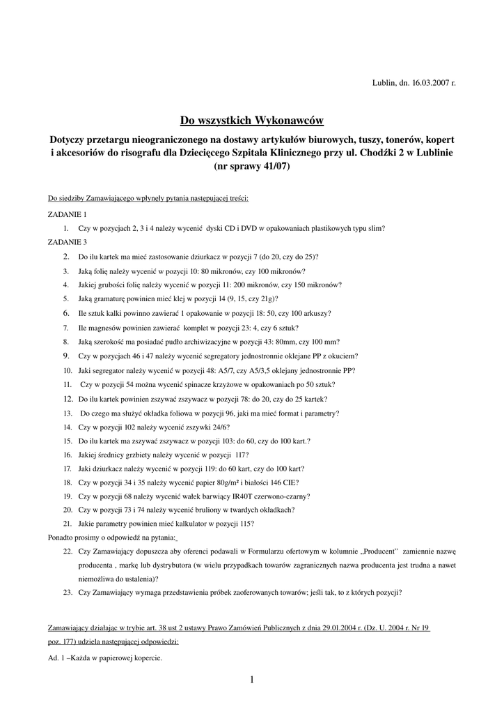 Lublin, dn. 16.03.2007 r. Do wszystkich Wykonawców Dotyczy przetargu nieograniczonego na dostawy artykułów biurowych, tuszy, tonerów, kopert i akcesoriów do risografu dla Dziecięcego Szpitala Klinicznego przy ul. Chodźki 2 w Lublinie (nr sprawy 41/07) Do siedziby Zamawiającego wpłynęły pytania następującej treści: ZADANIE 1 1. Czy w pozycjach 2, 3 i 4 należy wycenić dyski CD i DVD w opakowaniach plastikowych typu slim? ZADANIE 3 2. Do ilu kartek ma mieć zastosowanie dziurkacz w pozycji 7 (do 20, czy do 25)? 3. Jaką folię należy wycenić w pozycji 10: 80 mikronów, czy 100 mikronów? 4. Jakiej grubości folię należy wycenić w pozycji 11: 200 mikronów, czy 150 mikronów? 5. Jaką gramaturę powinien mieć klej w pozycji 14 (9, 15, czy 21g)? 6. Ile sztuk kalki powinno zawierać 1 opakowanie w pozycji 18: 50, czy 100 arkuszy? 7. Ile magnesów powinien zawierać komplet w pozycji 23: 4, czy 6 sztuk? 8. Jaką szerokość ma posiadać pudło archiwizacyjne w pozycji 43: 80mm, czy 100 mm? 9. Czy w pozycjach 46 i 47 należy wycenić segregatory jednostronnie oklejane PP z okuciem? 10. Jaki segregator należy wycenić w pozycji 48: A5/7, czy A5/3,5 oklejany jednostronnie PP? 11. Czy w pozycji 54 można wycenić spinacze krzyżowe w opakowaniach po 50 sztuk? 12. Do ilu kartek powinien zszywać zszywacz w pozycji 78: do 20, czy do 25 kartek? 13. Do czego ma służyć okładka foliowa w pozycji 96, jaki ma mieć format i parametry? 14. Czy w pozycji 102 należy wycenić zszywki 24/6? 15. Do ilu kartek ma zszywać zszywacz w pozycji 103: do 60, czy do 100 kart.? 16. Jakiej średnicy grzbiety należy wycenić w pozycji 117? 17. Jaki dziurkacz należy wycenić w pozycji 119: do 60 kart, czy do 100 kart? 18. Czy w pozycji 34 i 35 należy wycenić papier 80g/m² i białości 146 CIE? 19. Czy w pozycji 68 należy wycenić wałek barwiący IR40T czerwonoczarny? 20. Czy w pozycji 73 i 74 należy wycenić bruliony w twardych okładkach? 21. Jakie parametry powinien mieć kalkulator w pozycji 115? Ponadto prosimy o odpowiedź na pytania: 22. Czy Zamawiający dopuszcza aby oferenci podawali w Formularzu ofertowym w kolumnie „Producent” zamiennie nazwę producenta , markę lub dystrybutora (w wielu przypadkach towarów zagranicznych nazwa producenta jest trudna a nawet niemożliwa do ustalenia)? 23. Czy Zamawiający wymaga przedstawienia próbek zaoferowanych towarów; jeśli tak, to z których pozycji? Zamawiający działając w trybie art. 38 ust 2 ustawy Prawo Zamówień Publicznych z dnia 29.01.2004 r. (Dz. U. 2004 r. Nr 19 177) udziela następującej odpowiedzi: poz. Ad. 1 –Każda w papierowej kopercie. 1 Ad. 2 – Do 25 kartek. Ad. 3 –100 mikronów. Ad. 4 – Grubości 150 mikronów. Ad. 5 –Gramatura kleju powinna wynosić 15 g. Ad. 6 – 1 opakowanie powinno wynosić 50 arkuszy. Ad. 7 – 1 komplet powinien zawierać 4 magnesy. Ad. 8 – Pudło archiwizacyjne powinno mieć szerokość 100 mm. Ad. 9 – Tak. Ad. 10 – Segregator A5/7. Ad. 11 – Nie, Zamawiający nie wyraża zgody. Ad. 12 – Do 20 kartek. Ad. 13 – Okładka foliowa powinna służyć do bindowania i mieć następujące format i parametry: 150 mikronów, opakowania a`100, format A4. Ad. 14 – Tak. Ad. 15 –Do 60 kartek. Ad. 16 – Należy wycenić grzbiety szerokości 10 mm. Ad. 17 –Należy wycenić dziurkacz do 60 kartek. Ad. 18 – Tak. Ad. 19 – Tak. Ad. 20 – Tak. Ad. 21 – Powinien być to kalkulator elektroniczny z zasilaniem na baterie i słonecznym z 12pozycyjnym wyświetlaczem, klawisz podwójnego zera, z podstawowymi funkcjami jak dodawanie, odejmowanie, dzielenie, mnożenie, pierwiastkowanie, procenty. Ad. 22 – Zamawiający wyraża zgodę. Ad. 23 – Zamawiający odsyła do SIWZ; próbki są wymagane jedynie w zadaniu 4 – koperty. Zamawiający działając w trybie art. 38 ust. 4 ustawy Prawo Zamówień Publicznych z dnia 29.01.2004 r. (Dz. U. 2004r. Nr 19 177 z późn.zm.) modyfikuje treść Specyfikacji Istotnych Warunków Zamówienia: poz. • W zad. 3 poz. 88 Zamawiający zmienia dotychczasowy opis „Dysk MO 5,25 1,2 GB 512 SONY” na „Dysk MO 5,25 2,6 GB 512 SONY” W związku z powyższą modyfikacją Zamawiający działając zgodnie z art. 38 ust. 6 ustawy Prawo zamówień publicznych przesuwa terminy: • Termin składania ofert 20.03.2007 r., godz. 13.30 • Termin otwarcia ofert 20.03.2007 r., godz. 14:00 Pozostałe zapisy SIWZ pozostają bez zmian i są wiążące dla wszystkich uczestników postępowania. Z poważaniem mgr Jarosław Piotr Dąbrowski inspektor ds. zamówień publicznych 2