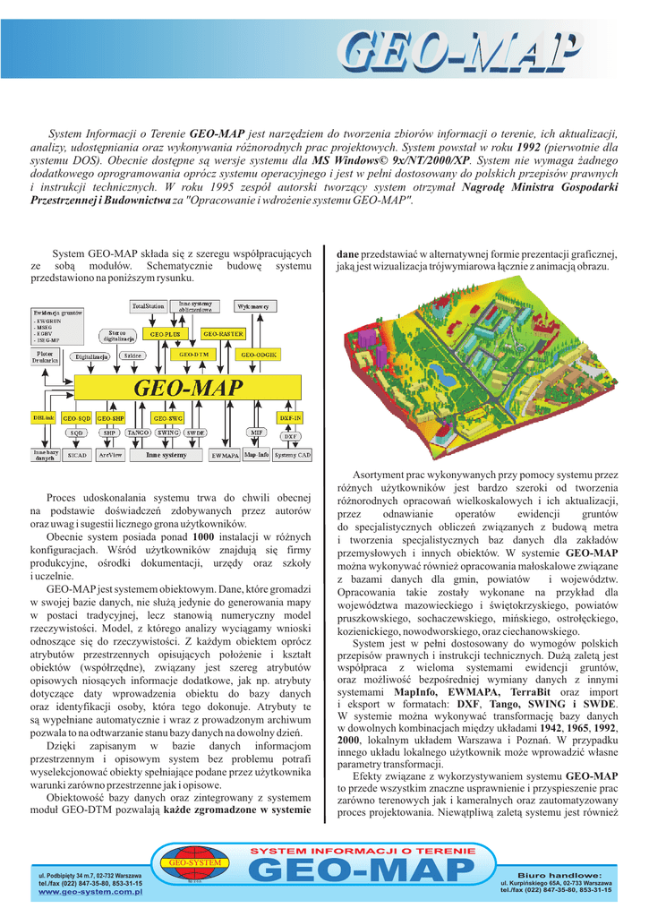 System Informacji o Terenie GEO-MAP jest narzêdziem do tworzenia zbiorów informacji o terenie, ich aktualizacji, analizy, udostêpniania oraz wykonywania ró¿norodnych prac projektowych. System powsta³ w roku 1992 (pierwotnie dla systemu DOS). Obecnie dostêpne s¹ wersje systemu dla MS Windows© 9x/NT/2000/XP. System nie wymaga ¿adnego dodatkowego oprogramowania oprócz systemu operacyjnego i jest w pe³ni dostosowany do polskich przepisów prawnych i instrukcji technicznych. W roku 1995 zespó³ autorski tworz¹cy system otrzyma³ Nagrodê Ministra Gospodarki Przestrzennej i Budownictwa za "Opracowanie i wdro¿enie systemu GEO-MAP". System GEO-MAP sk³ada siê z szeregu wspó³pracuj¹cych ze sob¹ modu³ów. Schematycznie budowê systemu przedstawiono na poni¿szym rysunku. Proces udoskonalania systemu trwa do chwili obecnej na podstawie doœwiadczeñ zdobywanych przez autorów oraz uwag i sugestii licznego grona u¿ytkowników. Obecnie system posiada ponad 1000 instalacji w ró¿nych konfiguracjach. Wœród u¿ytkowników znajduj¹ siê firmy produkcyjne, oœrodki dokumentacji, urzêdy oraz szko³y i uczelnie. GEO-MAP jest systemem obiektowym. Dane, które gromadzi w swojej bazie danych, nie s³u¿¹ jedynie do generowania mapy w postaci tradycyjnej, lecz stanowi¹ numeryczny model rzeczywistoœci. Model, z którego analizy wyci¹gamy wnioski odnosz¹ce siê do rzeczywistoœci. Z ka¿dym obiektem oprócz atrybutów przestrzennych opisuj¹cych po³o¿enie i kszta³t obiektów (wspó³rzêdne), zwi¹zany jest szereg atrybutów opisowych nios¹cych informacje dodatkowe, jak np. atrybuty dotycz¹ce daty wprowadzenia obiektu do bazy danych oraz identyfikacji osoby, która tego dokonuje. Atrybuty te s¹ wype³niane automatycznie i wraz z prowadzonym archiwum pozwala to na odtwarzanie stanu bazy danych na dowolny dzieñ. Dziêki zapisanym w bazie danych informacjom przestrzennym i opisowym system bez problemu potrafi wyselekcjonowaæ obiekty spe³niaj¹ce podane przez u¿ytkownika warunki zarówno przestrzenne jak i opisowe. Obiektowoœæ bazy danych oraz zintegrowany z systemem modu³ GEO-DTM pozwalaj¹ ka¿de zgromadzone w systemie dane przedstawiaæ w alternatywnej formie prezentacji graficznej, jak¹ jest wizualizacja trójwymiarowa ³¹cznie z animacj¹ obrazu. Asortyment prac wykonywanych przy pomocy systemu przez ró¿nych u¿ytkowników jest bardzo szeroki od tworzenia ró¿norodnych opracowañ wielkoskalowych i ich aktualizacji, przez odnawianie operatów ewidencji gruntów do specjalistycznych obliczeñ zwi¹zanych z budow¹ metra i tworzenia specjalistycznych baz danych dla zak³adów przemys³owych i innych obiektów. W systemie GEO-MAP mo¿na wykonywaæ równie¿ opracowania ma³oskalowe zwi¹zane z bazami danych dla gmin, powiatów i województw. Opracowania takie zosta³y wykonane na przyk³ad dla województwa mazowieckiego i œwiêtokrzyskiego, powiatów pruszkowskiego, sochaczewskiego, miñskiego, ostro³êckiego, kozienickiego, nowodworskiego, oraz ciechanowskiego. System jest w pe³ni dostosowany do wymogów polskich przepisów prawnych i instrukcji technicznych. Du¿¹ zalet¹ jest wspó³praca z wieloma systemami ewidencji gruntów, oraz mo¿liwoœæ bezpoœredniej wymiany danych z innymi systemami MapInfo, EWMAPA, TerraBit oraz import i eksport w formatach: DXF, Tango, SWING i SWDE. W systemie mo¿na wykonywaæ transformacjê bazy danych w dowolnych kombinacjach miêdzy uk³adami 1942, 1965, 1992, 2000, lokalnym uk³adem Warszawa i Poznañ. W przypadku innego uk³adu lokalnego u¿ytkownik mo¿e wprowadziæ w³asne parametry transformacji. Efekty zwi¹zane z wykorzystywaniem systemu GEO-MAP to przede wszystkim znaczne usprawnienie i przyspieszenie prac zarówno terenowych jak i kameralnych oraz zautomatyzowany proces projektowania. Niew¹tpliw¹ zalet¹ systemu jest równie¿ GEO-SYSTEM ul. Podbipiêty 34 m.7, 02-732 Warszawa tel./fax (022) 847-35-80, 853-31-15 Biuro handlowe: ul. Kurpiñskiego 65A, 02-733 Warszawa tel./fax (022) 847-35-80, 853-31-15 fakt, ¿e jest on kompleksowym narzêdziem pozwalaj¹cym na wykonywanie ró¿norodnych prac geodezyjnych (czasem bardzo specjalistycznych) bez koniecznoœci korzystania z dodatkowego oprogramowania. programy komunikacyjne umo¿liwiaj¹ systemowi GEO-MAP dostêp do baz danych wymienionych systemów. Baza opisowa ewidencji gruntów w systemie: EWGRUN System GEO-MAP posiada wszystkie funkcje niezbêdne w procesie prezentacji, edycji oraz udostêpniania i przyjmowania fragmentów bazy danych. MSEG EGBV Funkcje edycyjne Baza geometryczna SITGMIN EWOPIS GEO-MAP Kontrola spójnoœci bazy opisowej z geometryczn¹ oraz aktualizacja bazy geometrycznej GEO-MAP Funkcje prezentacji danych Automatyczny proces generalizacji, selekcja obiektów do prezentacji wg: kodu obiektu, warstw informacyjnych, kombinacji warunków przestrzennych i nieprzestrzennych nak³adanych na atrybuty obiektów, wizualizacje trójwymiarowe, wymiennoœæ bibliotek znaków umownych. ISEG-MP Wydawanie dokumentów - wypis - wyrys Wykonanie analiz w oparciu o dane zapisane w czêœci opisowej Dziêki takiemu rozwi¹zaniu system mo¿e udostêpniæ u¿ytkownikowi informacji z ewidencji gruntów o dzia³ce lub grupie dzia³ek. Tworzenie obiektów przy pomocy myszy na podstawie istniej¹cych punktów, lub na podstawie relacji geometrycznych miêdzy istniej¹cymi obiektami np.: domiary prostok¹tne, przeciêcia obiektów itp.. Digitalizacja map oraz stereodigitalizacja zdjêæ lotniczych na autografie. Automatyczne tworzenie sekcji map (dla uk³adów wspó³rzêdnych 1965, 1942, 1992, 2000, Warszawa, Poznañ) w dowolnych skalach na podstawie god³a lub wskazanego obszaru. Selekcja i modyfikacja istniej¹cych obiektów, np.: kopiowanie, przenoszenie, podzia³, ³¹czenie, zmiana miejsca opisu. Funkcje udostêpniania danych Udostêpnianie fragmentów bazy danych w dowolnie zdefiniowanym wielok¹cie, kreœlenie na ploterze, generowanie plików SQD, DXF, MIF, SWING, TANG