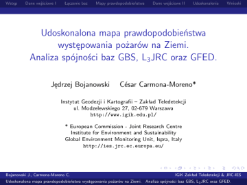 Wstęp Dane wejściowe I Łączenie baz Mapy prawdopodobieństwa Dane wejściowe II Udoskonalenia Wnioski Udoskonalona mapa prawdopodobieństwa występowania pożarów na Ziemi. Analiza spójności baz GBS, L3 JRC oraz GFED. Jędrzej Bojanowski César Carmona-Moreno* Instytut Geodezji i Kartografii – Zakład Teledetekcji ul. Modzelewskiego 27, 02-679 Warszawa http://www.igik.edu.pl/ * European Commission - Joint Research Centre Institute for Environment and Sustainability Global Environment Monitoring Unit, Ispra, Italy http://ies.jrc.ec.europa.eu/ Bojanowski J., Carmona-Moreno C. IGiK Zakład Teledetekcji & JRC-IES Udoskonalona mapa prawdopodobieństwa występowania pożarów na Ziemi. Analiza spójności baz GBS, L3 JRC oraz GFED. Wstęp Dane wejściowe I Łączenie baz Mapy prawdopodobieństwa Dane wejściowe II Udoskonalenia Wnioski Pożary I Jeden z ważniejszych czynników wpływających na działanie ekosystemu Ziemi I Wpływają na klimat, obieg węgla, zanieczyszczenie powietrza, itp. Bojanowski J., Carmona-Moreno C. IGiK Zakład Teledetekcji & JRC-IES Udoskonalona mapa prawdopodobieństwa występowania pożarów na Ziemi. Analiza spójności baz GBS, L3 JRC oraz GFED. Wstęp Dane wejściowe I Łączenie baz Mapy prawdopodobieństwa Dane wejściowe II Udoskonalenia Wnioski Pożary I Jeden z ważniejszych czynników wpływających na działanie ekosystemu Ziemi I Wpływają na klimat, obieg węgla, zanieczyszczenie powietrza, itp. I Dopiero w ciągu ostatnich kilku lat opracowano metody rozpoznawania obszarów pożarzysk w oparciu o zdjęcia satelitarne, czego skutkiem było powstanie kilku baz danych pożarzysk na całym świecie. Bojanowski J., Carmona-Moreno C. IGiK Zakład Teledetekcji & JRC-IES Udoskonalona mapa prawdopodobieństwa występowania pożarów na Ziemi. Analiza spójności baz GBS, L3 JRC oraz GFED. Wstęp Dane wejściowe I Łączenie baz Mapy prawdopodobieństwa Dane wejściowe II Udoskonalenia Wnioski Pożary I Jeden z ważniejszych czynników wpływających na działanie ekosystemu Ziemi I Wpływają na klimat, obieg węgla, zanieczyszczenie powietrza, itp. I Dopiero w ciągu ostatnich kilku lat opracowano metody rozpoznawania obszarów pożarzysk w oparciu o zdjęcia satelitarne, czego skutkiem było powstanie kilku baz danych pożarzysk na całym świecie. I Celem niniejszej pracy było stworzenie najdłuższej bazy zawierającej rozkład występowania pożarów na Ziemi w ciągu ostanich dwudziestu kilku lat. Bojanowski J., Carmona-Moreno C. IGiK Zakład Teledetekcji & JRC-IES Udoskonalona mapa prawdopodobieństwa występowania pożarów na Ziemi. Analiza spójności baz GBS, L3 JRC oraz GFED. Wstęp Dane wejściowe I Łączenie baz Bojanowski J., Carmona-Moreno C. Mapy prawdopodobieństwa Dane wejściowe II Udoskonalenia Wnioski IGiK Zakład Teledetekcji & JRC-IES Udoskonalona mapa prawdopodobieństwa występowania pożarów na Ziemi. Analiza spójności baz GBS, L3 JRC oraz GFED. Wstęp Dane wejściowe I Łączenie baz Bojanowski J., Carmona-Moreno C. Mapy prawdopodobieństwa Dane wejściowe II Udoskonalenia Wnioski IGiK Zakład Teledetekcji & JRC-IES Udoskonalona mapa prawdopodobieństwa występowania pożarów na Ziemi. Analiza spójności baz GBS, L3 JRC oraz GFED. Wstęp Dane wejściowe I Łączenie baz Bojanowski J., Carmona-Moreno C. Mapy prawdopodobieństwa Dane wejściowe II Udoskonalenia Wnioski IGiK Zakład Teledetekcji & JRC-IES Udoskonalona mapa prawdopodobieństwa występowania pożarów na Ziemi. Analiza spójności baz GBS, L3 JRC oraz GFED. Wstęp Dane wejściowe I Łączenie baz Bojanowski J., Carmona-Moreno C. Mapy prawdopodobieństwa Dane wejściowe II Udoskonalenia Wnioski IGiK Zakład Teledetekcji & JRC-IES Udoskonalona mapa prawdopodobieństwa występowania pożarów na Ziemi. Analiza spójności baz GBS, L3 JRC oraz GFED. Wstęp Dane wejściowe I Łączenie baz Mapy prawdopodobieństwa Dane wejściowe II Udoskonalenia Wnioski Wstęp Dane wejściowe I (GBS, L3JRC) Łączenie baz (GBS + L3JRC) Mapy prawdopodobieństwa (wg GBS) Dane wejściowe II (GFED) Udoskonalenia mapy prawdopodobieństw (GBS + GFED) Wnioski Bojanowski J., Carmona-Moreno C. IGiK Zakład Teledetekcji & JRC-IES Udoskonalona mapa prawdopodobieństwa występowania pożarów na Ziemi. Analiza spójności baz GBS, L3 JRC oraz GFED. Wstęp Dane wejściowe I Łączenie baz Mapy prawdopodobieństwa Dane wejściowe II Udoskonalenia Wnioski Global Burnt Surfaces (GBS) I Utworzona na podstawie dziennych obrazów NOAA-AVHRR GAC o rozdzielczości 8km×8km Bojanowski J., Carmona-Moreno C. IGiK Zakład Teledetekcji & JRC-IES Udoskonalona mapa prawdopodobieństwa występowania pożarów na Ziemi. Analiza spójności baz GBS, L3 JRC oraz GFED. Wstęp Dane wejściowe I Łączenie baz Mapy prawdopodobieństwa Dane wejściowe II Udoskonalenia Wnioski Global Burnt Surfaces (GBS) I I Utworzona na podstawie dziennych obrazów NOAA-AVHRR GAC o rozdzielczości 8km×8km Klasyfikacja pożarzysk głównie na podstawie: kompozycji tygodniowych minimalnego albedo w kanałach 1 i 2 GEMI = f (kanał 1, kanał 2) Vi3t = f (kanał 2, kanał 3) Bojanowski J., Carmona-Moreno C. IGiK Zakład Teledetekcji & JRC-IES Udoskonalona mapa prawdopodobieństwa występowania pożarów na Ziemi. Analiza spójności baz GBS, L3 JRC oraz GFED. Wstęp Dane wejściowe I Łączenie baz Mapy prawdopodobieństwa Dane wejściowe II Udoskonalenia Wnioski Global Burnt Surfaces (GBS) I I Utworzona na podstawie dziennych obrazów NOAA-AVHRR GAC o rozdzielczości 8km×8km Klasyfikacja pożarzysk głównie na podstawie: kompozycji tygodniowych minimalnego albedo w kanałach 1 i 2 GEMI = f (kanał 1, kanał 2) Vi3t = f (kanał 2, kanał 3) I Produktem końcowym jest baza obrazów tygodniowych (1982-1999) o rozdzielczości geometrycznej 0.5o × 0.5o . Wartość piksela 0.5o × 0.5o oznacza liczbę pikseli 8km×8km oznaczonych jako pożarzysko. Bojanowski J., Carmona-Moreno C. IGiK Zakład Teledetekcji & JRC-IES Udoskonalona map