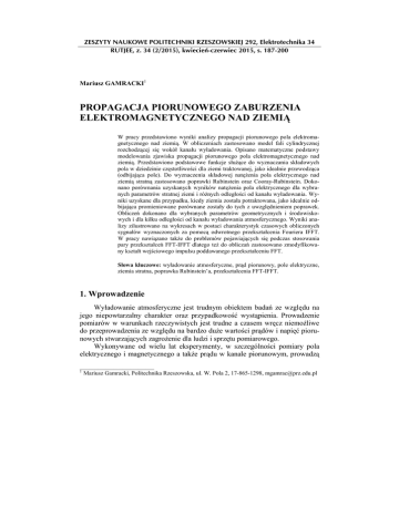 ZESZYTY NAUKOWE POLITECHNIKI RZESZOWSKIEJ 292, Elektrotechnika 34 RUTJEE, z. 34 (2/2015), kwiecień-czerwiec 2015, s. 187-200 Mariusz GAMRACKI1 PROPAGACJA PIORUNOWEGO ZABURZENIA ELEKTROMAGNETYCZNEGO NAD ZIEMIĄ W pracy przedstawiono wyniki analizy propagacji piorunowego pola elektromagnetycznego nad ziemią. W obliczeniach zastosowano model fali cylindrycznej rozchodzącej się wokół kanału wyładowania. Opisano matematyczne podstawy modelowania zjawiska propagacji piorunowego pola elektromagnetycznego nad ziemią. Przedstawiono podstawowe funkcje służące do wyznaczania składowych pola w dziedzinie częstotliwości dla ziemi traktowanej, jako idealnie przewodząca (odbijająca pole). Do wyznaczenia składowej natężenia pola elektrycznego nad ziemią stratną zastosowano poprawki Rubinstein oraz Cooray-Rubinstein. Dokonano porównania uzyskanych wyników natężenia pola elektrycznego dla wybranych parametrów stratnej ziemi i różnych odległości od kanału wyładowania. Wyniki uzyskane dla przypadku, kiedy ziemia została potraktowana, jako idealnie odbijająca promieniowane porównane zostały do tych z uwzględnieniem poprawek. Obliczeń dokonano dla wybranych parametrów geometrycznych i środowiskowych i dla kilku odległości od kanału wyładowania atmosferycznego. Wyniki analizy zilustrowano na wykresach w postaci charakterystyk czasowych obliczonych sygnałów wyznaczonych za pomocą odwrotnego przekształcenia Fouriera IFFT. W pracy nawiązano także do problemów pojawiających się podczas stosowania pary przekształceń FFT-IFFT dlatego też do obliczań zastosowano zmodyfikowany kształt wejściowego impulsu poddawanego przekształceniu FFT. Słowa kluczowe: wyładowanie atmosferyczne, prąd piorunowy, pole elektryczne, ziemia stratna, poprawka Rubinstein’a, przekształcenia FFT-IFFT. 1. Wprowadzenie Wyładowanie atmosferyczne jest trudnym obiektem badań ze względu na jego niepowtarzalny charakter oraz przypadkowość wystąpienia. Prowadzenie pomiarów w warunkach rzeczywistych jest trudne a czasem wręcz niemożliwe do przeprowadzenia ze względu na bardzo duże wartości prądów i napięć piorunowych stwarzających zagrożenie dla ludzi i sprzętu pomiarowego. Wykonywane od wielu lat eksperymenty, w szczególności pomiary pola elektrycznego i magnetycznego a także prądu w kanale piorunowym, prowadzą _____________________________________ 1 Mariusz Gamracki, Politechnika Rzeszowska, ul. W. Pola 2, 17-865-1298, [email protected] 188 M. Gamracki do powstawania coraz nowszych i ciągle udoskonalanych modeli. Rzeczywisty kształt prądu piorunowego jest na tyle skomplikowany i niepowtarzalny, że nie ma możliwości zastosowania go przy analizach numerycznych. Z tego względu na podstawie wykonanych pomiarów opracowano uśrednione modele matematyczne prądu u podstawy kanału wyładowania atmosferycznego, które są jedynie częściowym odzwierciedleniem jego skomplikowanego kształtu [1 - 3]. Pierwsze opracowania naukowe dotyczące wyznaczania wartości składowych piorunowych pól elektromagnetycznych przyjmowały ziemię, jako medium idealnie przewodzące, a więc całkowicie odbijające padające na nią pole elektromagnetyczne. Takie założenie jest jednak dość znacznym uproszczeniem, ponieważ w większości wypadków elektryczne i magnetyczne parametry ziemi znacznie odbiegają od idealnego przewodnika. Prowadzone prace symulacyjne w korelacji z danymi pomiarowymi doprowadziły do powstania pewnych poprawek korygujących składowe pól nad ziemią bezstratną poprzez wprowadzenie do obliczeń rzeczywistych parametrów elektrycznych i magnetycznych ziemi [4, 5]. 2. Powstawanie i propagacja piorunowego zaburzenia elektromagnetycznego Powstające wokół kanału wyładowania cylindryczne pole elektromagnetyczne jest skutkiem przepływu prądu w kanale wyładowania. Docierająca do badanego układu fala elektromagnetyczna jest w pewnym względzie odzwierciedleniem kształtu i parametrów prądu piorunowego, jednakże parametry propagującej fali zmieniają się znacznie wraz z odległością od kanału wyładowania ulegając stopniowemu osłabianiu i zmianie kształtu fali [1, 6]. Zmniejszanie się wartości natężenia pola wraz z odległością jest czymś oczywistym natomiast okazuje się, że znacznie zmienia się także kształt rozchodzącej się w przestrzeni fali. Wykonywane pomiary i symulacje pokazały, że wraz z odległością krzywa przebiegu czasowego reprezentująca pole elektryczne znacznie szybciej dąży do zera, a w odległości kilkudziesięciu kilometrów od miejsca wyładowania przechodzi na wartości ujemne [6]. Geometrię układu przestrzennego, w którym analizowane jest zjawisko przedstawiono na rysunku 1, na którym umieszczono także linię transmisyjną narażoną na działanie zewnętrznego pola elektromagnetycznego. Powstawanie piorunowych zaburzeń elektromagnetycznych indukowanych w układach elektrycznych można podzielić na trzy etapy. Pierwszy dotyczy przepływu prądu piorunowego w kanale wyładowania, drugi związany jest z rozprzestrzenianiem się fali elektromagnetycznej wokół kanału wyładowania natomiast trzeci to powstawanie przepięć w liniach transmisyjnych oraz układach elektrycznych i elektronicznych narażonych na działanie pola. Propagacja piorunowego zaburzenia … kanał piorunowy 189 z LEMP u2 i(t) i(z,t) y Linia transmisyjna x u1 Rys. 1. Układ przestrzenny przedstawiający trzy etapy powstawania piorunowych zaburzeń elektromagnetycznych w liniach transmisyjnych Fig. 1. The spatial arrangement showing the three stages of the formation of lightning electromagnetic disturbances in transmission lines 3. Kształt i parametry prądu piorunowego Na przełomie ostatnich wielu lat opracowywano modele matematyczne prądu u podstawy kanału wyładowania. Większość z nich bazowała na wynikach pomiarów i eksperymentów. Wyładowanie atmosferyczne jest zjawiskiem niepowtarzalnym, dlatego też nie 