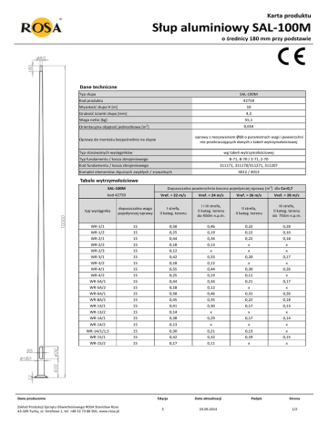 Karta produktu Słup aluminiowy SAL-100M o średnicy 180 mm przy podstawie Dane techniczne Typ słupa SAL-100M Kod produktu 42759 Wysokośd słupa H *m+ 10 Grubośd ścianki słupa *mm+ 4,3 Waga netto [kg] 55,1 Orientacyjna objętośd jednostkowa *m3] 0,654 oprawy z mocowaniem Ø60 o parametrach wagi i powierzchni nie przekraczających danych z tabeli wytrzymałościowej Oprawy do montażu bezpośrednio na słupie Typ stosowanych wysięgników wg tabeli wytrzymałościowej Typ fundamentu / kosza zbrojeniowego B-71, B-70 / Z-71, Z-70 Kod fundamentu / kosza zbrojeniowego 311171, 311170/311271, 311207 Komplet elementów złącznych zwykłych / zrywalnych 4012 / 4013 Tabele wytrzymałościowe Dopuszczalna powierzchnia boczna pojedynczej oprawy [m2] dla Cx=0,7 SAL-100M kod 42759 Vref. = 22 m/s Vref. = 24 m/s Vref. = 26 m/s Vref. = 28 m/s typ wysięgnika dopuszczalna waga pojedynczej oprawy I strefa, II kateg. terenu I i III strefa, II kateg. terenu do 450m n.p.m. II strefa, II kateg. terenu III strefa, II kateg. terenu do 755m n.p.m. WR-1/1 15 0,58 0,46 0,32 0,28 WR-1/2 15 0,25 0,19 0,12 0,10 WR-2/1 15 0,44 0,34 0,22 0,18 WR-2/2 15 0,18 0,13 x x WR-2/3 15 0,12 x x x WR-3/1 15 0,42 0,33 0,20 0,17 WR-3/2 15 0,18 0,12 x x WR-4/1 15 0,55 0,44 0,30 0,26 WR-4/2 15 0,25 0,19 0,11 x WR-5A/1 15 0,44 0,34 0,21 0,17 WR-5A/2 15 0,18 0,12 x x WR-6A/1 15 0,58 0,46 0,31 0,26 WR-8A/1 15 0,45 0,35 0,22 0,18 WR-13/1 15 0,41 0,30 0,17 0,13 WR-13/2 15 0,14 x x x WR-14/1 15 0,38 0,29 0,17 0,14 WR-14/2 15 0,13 x x x WR-14/1/1,5 15 0,30 0,21 0,13 x WR-15/1 15 0,42 0,32 0,19 0,15 WR-15/2 15 0,17 0,11 x x Dane producenta Zakład Produkcji Sprzętu Oświetleniowego ROSA Stanisław Rosa 43-109 Tychy, ul. Strefowa 1, tel. +48 32 73 88 901, www.rosa.pl Edycja Data aktualizacji 3 24.09.2014 Podpis Strona 1/2 Karta produktu Słup aluminiowy SAL-100M o średnicy 180 mm przy podstawie Tabele wytrzymałościowe Dopuszczalna powierzchnia boczna pojedynczej oprawy [m2] dla Cx=0,7 SAL-100M kod 42759 Vref. = 22 m/s Vref. = 24 m/s Vref. = 26 m/s Vref. = 28 m/s typ wysięgnika dopuszczalna waga pojedynczej oprawy I strefa, II kateg. terenu I i III strefa, II kateg. terenu do 450m n.p.m. II strefa, II kateg. terenu III strefa, II kateg. terenu do 755m n.p.m. WR-18 15 0,24 0,16 x x WR-61 15 0,22 0,14 x x WR –T1/1,5 15 0,30 0,21 x x WRP1/1,0/0,7/5 15 0,41 0,31 0,19 0,15 WRP1/1,0/1,2/5 15 0,32 0,23 0,11 x WRP1/1,5/0,7/5 15 0,32 0,24 0,12 x WRP1/1,5/1,2/5 15 0,24 0,16 x x WRP2/1,0/0,7/5 15 0,17 0,11 x x WRP2/1,0/1,2/5 15 0,11 x x x WRP2/1,5/0,7/5 15 0,12 x x x WRP3/1,0/0,7/5 15 0,13 x x x WRP3/1,5/0,7/5 15 0,10 x x x WN-1 15 0,49 (Cx=1) 0,4 (Cx=1) 0,28 (Cx=1) 0,25 (Cx=1) WN-2 15 0,22 (Cx=1) 0,17 (Cx=1) 0,12 (Cx=1) 0,1 (Cx=1) WN-21 15 0,2 (Cx=1) 0,15 (Cx=1) 0,1 (Cx=1) x WN-3 15 0,14 (Cx=1) 0,11 (Cx=1) x x WN-4 12 0,13 (Cx=1) 0,1 (Cx=1) x x WN-42 12 0,13 (Cx=1) 0,1 (Cx=1) x x Dopuszczalna powierzchnia boczna opraw i wysięgników *m2] dla Cx=1 SAL-100M kod 42759 Vref. = 22 m/s Vref. = 24 m/s Vref. = 26 m/s Vref. = 28 m/s Dopuszczalna masa opraw i wysięgników [kg] I strefa, II kateg. terenu I i III strefa, II kateg. terenu do 450m n.p.m. II strefa, II kateg. terenu III strefa, II kateg. terenu do 755m n.p.m. 30 0,49 0,40 0,29 0,26 50 0,44 0,36 0,25 0,22 powierzchnia: aluminium szlifowane anodowanie w 10 kolorach, każdy z możliwością wybłyszczania opcja malowania proszkowego wg RAL (inne farby na życzenie klienta) opcja zabezpieczenia elastomerem w kolorze słupa do wysokości 350 mm (inna wysokośd na życzenie klienta) wnęka standard ROSA pakowanie: włóknina polipropylenowa certyfikat bezpieczeostwa biernego 100NE2 Dane producenta Zakład Produkcji Sprzętu Oświetleniowego ROSA Stanisław Rosa 43-109 Tychy, ul. Strefowa 1, tel. +48 32 73 88 901, www.rosa.pl Edycja Data aktualizacji 3 24.09.2014 Podpis Strona 2/2