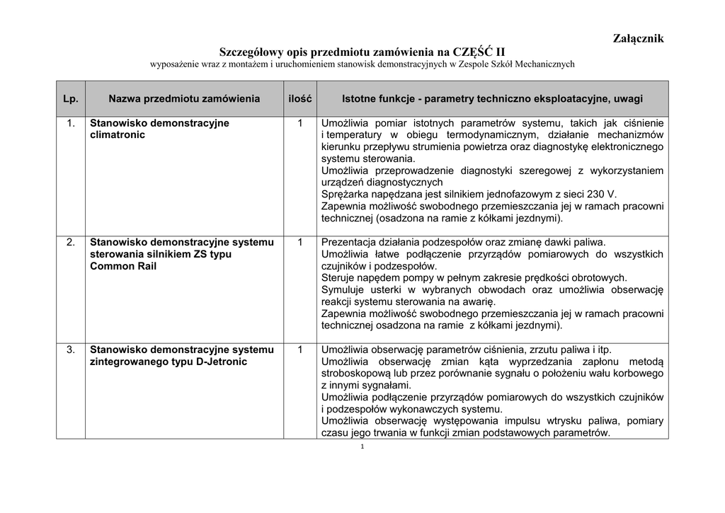 Załącznik Szczegółowy opis przedmiotu zamówienia na CZĘŚĆ II wyposażenie wraz z montażem i uruchomieniem stanowisk demonstracyjnych w Zespole Szkół Mechanicznych Lp. Nazwa przedmiotu zamówienia ilość Istotne funkcje - parametry techniczno eksploatacyjne, uwagi 1. Stanowisko demonstracyjne climatronic 1 Umożliwia pomiar istotnych parametrów systemu, takich jak ciśnienie i temperatury w obiegu termodynamicznym, działanie mechanizmów kierunku przepływu strumienia powietrza oraz diagnostykę elektronicznego systemu sterowania. Umożliwia przeprowadzenie diagnostyki szeregowej z wykorzystaniem urządzeń diagnostycznych Sprężarka napędzana jest silnikiem jednofazowym z sieci 230 V. Zapewnia możliwość swobodnego przemieszczania jej w ramach pracowni technicznej (osadzona na ramie z kółkami jezdnymi). 2. Stanowisko demonstracyjne systemu sterowania silnikiem ZS typu Common Rail 1 Prezentacja działania podzespołów oraz zmianę dawki paliwa. Umożliwia łatwe podłączenie przyrządów pomiarowych do wszystkich czujników i podzespołów. Steruje napędem pompy w pełnym zakresie prędkości obrotowych. Symuluje usterki w wybranych obwodach oraz umożliwia obserwację reakcji systemu sterowania na awarię. Zapewnia możliwość swobodnego przemieszczania jej w ramach pracowni technicznej osadzona na ramie z kółkami jezdnymi). 3. Stanowisko demonstracyjne systemu zintegrowanego typu D-Jetronic 1 Umożliwia obserwację parametrów ciśnienia, zrzutu paliwa i itp. Umożliwia obserwację zmian kąta wyprzedzania zapłonu metodą stroboskopową lub przez porównanie sygnału o położeniu wału korbowego z innymi sygnałami. Umożliwia podłączenie przyrządów pomiarowych do wszystkich czujników i podzespołów wykonawczych systemu. Umożliwia obserwację występowania impulsu wtrysku paliwa, pomiary czasu jego trwania w funkcji zmian podstawowych parametrów. 1 Symuluje usterki w wybranych obwodach oraz umożliwia obserwację reakcji systemu sterowania na awarię. Zapewnia możliwość swobodnego przemieszczania jej w ramach pracowni technicznej (osadzona na ramie z kółkami jezdnymi). 4. Stanowisko demonstracyjne ABS 1 Umożliwia obserwację normalnych stanów pracy stanowiska w warunkach symulowanej jazdy, zwykłego hamowania, oraz hamowania reakcją systemu ABS. Umożliwia obserwację systemu podczas symulacji różnych awarii. Umożliwia pomiary napięć czujników prędkości obrotowej kół, zmiany tych napięć w funkcji zmian szczeliny, zmian prędkości obrotowej oraz obserwację głębokości modulacji sygnału, będącej skutkiem „bicia” wieńca zębatego. Umożliwia przeprowadzenie diagnostyki z wykorzystaniem urządzeń diagnostycznych. Zapewnia możliwość swobodnego przemieszczania jej w ramach pracowni technicznej (osadzona na ramie z kółkami jezdnymi). 5. Model dwuobwodowego układu hamulcowego 1 Mobilne przemieszczanie się modelu (rama z kółkami). Pełna symulacja pracy hydraulicznego układu hamulcowego ze wspomaganiem. Obserwacja wpływu wspomagania na pracę układu hamulcowego. Możliwość pomiaru ciśnień płynu hydraulicznego w różnych punktach układu. Możliwość pomiaru ciśnienia pneumatycznego wytwarzanego przez Serwomechanizm wspomagania. Stanowisko demonstracyjne systemu sterowania elektronicznego silnikiem wysokoprężnym 1 6. Umożliwia prezentację działania podzespołów oraz zmianę dawki paliwa. Umożliwia łatwe podłączenie przyrządów pomiarowych do wszystkich czujników i podzespołów wykonawczych systemu. Umożliwia symulowanie pełnego zakresu prędkości obrotowych od fazy rozruchu do pełnych obrotów. Umożliwia symulację stanów awaryjnych w wybranych obwodach oraz obserwację reakcji systemu sterowania na powstałą awarię. 2 Umożliwia przeprowadzenie diagnostyki szeregowej z wykorzystaniem urządzeń diagnostycznych. Zapewnia możliwość swobodnego przemieszczania jej w ramach pracowni technicznej (osadzona na ramie z kółkami jezdnymi). 7. Tablica demonstracyjna systemu zintegrowanego typu Motronic 1 Umożliwia pomiary parametrów ciśnienia i wydajności pompy paliwowej oraz prezentację zjawisk towarzyszących pompowaniu paliwa. Umożliwia połączenie przyrządów pomiarowych do czujników systemu i podzespołów wykonawczych. Umożliwia obserwację zmian kąta wyprzedzania zapłonu metodą stroboskopową lub przez porównanie sygnałów czujników położenia wału korbowego i cewki zapłonowej. Umożliwia symulację stanów awaryjnych w wybranych obwodach oraz obserwację reakcji systemu sterowania na powstałą awarię. Umożliwia przeprowadzenie samodiagnozy systemu. Umożliwia przeprowadzenie diagnostyki szeregowej z wykorzystaniem urządzeń diagnostycznych. Zapewnia możliwość swobodnego przemieszczania jej w ramach pracowni technicznej (osadzona na ramie z kółkami jezdnymi). 8. Stanowisko demonstracyjna zestawu czujników systemów elektronicznych pojazdu 1 Umożliwia pomiary parametrów czujników ciśnienia bezwzględnego. Umożliwia pomiary parametrów czujników położenia wału korbowego silnika. Umożliwia pomiary czujników liniowych i kątowych przemieszczeń, czujnika spalania stukowego, czujników prędkości pojazdów. Umożliwia demonstrowanie momentu wystąpienia iskry zależnie od biegunowości sygnału wejściowego. Zapewnia możliwość swobodnego przemieszczania jej w ramach pracowni technicznej (osadzona na ramie z kółkami jezdnymi). 9 Stanowisko demonstracyjne układu zapłonowego pojazdu 1 Składa się układu zapłonowego rozdzielaczowego z czujnikiem Halla. Składa się układu zapłonowego rozdzielaczowego z czujnikiem indukcyjnym. Składa się układu zapłonowego bezrozdzielaczowego z czujnikiem 3 indukcyjnym i komputerem zapłonu. Umożliwia sprawdzanie czujników impulsów zapłonowych (Hall i indukcyjny). Umożliwia pomiar parametrów cewki zapłonowej, przewodów zapłonowych, świec zapłonowych. Umożliwia sporządzanie oscylogramów. Umożli