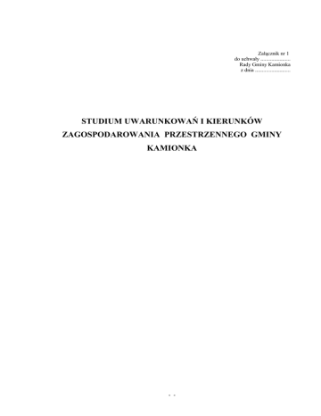 Załącznik nr 1 do uchwały ...................... Rady Gminy Kamionka z dnia .......................... STUDIUM UWARUNKOWAŃ I KIERUNKÓW ZAGOSPODAROWANIA PRZESTRZENNEGO GMINY KAMIONKA - - Uwarunkowania rozwoju - - SPIS TREŚCI I. Wprowadzenie 1. Ogólna charakterystyka studium uwarunkowań i kierunków zagospodarowania przestrzennego 2. Zmiany Studium 3. Zawartość opracowania II. Podstawowe dane o gminie Kamionka III. Wytyczne z planu zagospodarowania przestrzennego województwa lubelskiego IV. Cele i kierunki określone w dokumentach strategicznych V. Środowisko przyrodnicze 1. Budowa geologiczna 2. Gleby 3. Wody powierzchniowe i podziemne 4. Klimat 5. Powietrze atmosferyczne 6. Przyroda ożywiona 7. Obszary i obiekty prawnie chronione 8. Przyrodniczy system gminy VI. Wartości kulturowe 1. Analiza zasobu kulturowego 2. Wykaz obiektów zabytkowych VII. Infrastruktura 1. Infrastruktura techniczna 2. Komunikacja VIII. Sfera społeczna i gospodarcza 1. Potencjał społeczno-demograficzny 2. Baza oświatowa i kulturalna 3. Rolnictwo 4. Gospodarka 5. Turystyka 6. Bezpieczeństwo -1- 3 3 5 5 7 9 15 17 17 19 19 22 23 24 25 27 29 29 30 33 33 34 39 39 40 41 43 45 45 Podstawę niniejszego opracowania stanowi ujednolicony tekst studium uwarunkowań i kierunków zagospodarowania przestrzennego gminy Kamionka przyjęty uchwałą Nr IV/14/2011 Rady Gminy Kamionka z dnia 11 lutego 2011 r. w sprawie uchwalenia zmian "Studium uwarunkowań i kierunków zagospodarowania przestrzennego gminy Kamionka”, a opracowany przez Zakład Projektowo-Budowlany Pracownia Projektowo-Studialna EKO-PLAN. W skład zespołu autorskiego weszli: mgr inż. Marek Kozłowski OIU W-wa nr WA-093 – główny projektant mgr inż. Anita Nankiewicz – tok formalnoprawny mgr Gustaw Obel – infrastruktura techniczna inż. Maciej Kozłowski – opracowanie graficzne. Do opracowania zmiany studium uwarunkowań i kierunków zagospodarowania przestrzennego Gminy Kamionka przystąpiono w związku z uchwałą Rady Gminy Nr V/33/2011 z dnia 28.03.2011 r. Zmiany te zostały opracowane przez zespół autorski w składzie: mgr inż. arch. Stanisław Korpanty nr rej. Izby Urbanistów WA 086 - główny projektant mgr inż. Konrad Janowski - projektant mgr inż. Aleksandra Gałązka - uwarunkowania kulturowe mgr inż. Ewa Więckowska - komunikacja mgr inż. Stefan Parys - infrastruktura techniczna mgr inż. Izabela Gendek - opracowanie wstępne mgr inż. arch. Krzysztof Grzebyk - konsultacje, Wprowadzane zmiany w tekście Studium uwarunkowań i kierunków zagospodarowania przestrzennego gminy Kamionka polegające na dodaniu lub modyfikacji tekstu zostały oznaczone pogrubioną kursywą w kolorze niebieskim, według następującego wzoru: „1) dotychczasowego przeznaczenia, zagospodarowania i uzbrojenia terenu;” Usuwane fragmenty tekstu nie zostały oznaczone. -2- I. WPROWADZENIE 1. Ogólna charakterystyka studium uwarunkowań i kierunków zagospodarowania przestrzennego. „Zmiany studium uwarunkowań i kierunków zagospodarowania przestrzennego gminy Kamionka” zostały opracowane z uwzględnieniem wszystkich elementów wynikających z ustawy z dnia 27 marca 2003 r. o planowaniu i zagospodarowaniu przestrzennym. Celem opracowania studium jest określenie polityki przestrzennej gminy, uwzględniającej uwarunkowania jej rozwoju wynikające w szczególności z: 1) dotychczasowego przeznaczenia, zagospodarowania i uzbrojenia terenu; 2) stanu ładu przestrzennego i wymogów jego ochrony; 3) stanu środowiska, w tym stanu rolniczej i leśnej przestrzeni produkcyjnej, wielkości i jakości zasobów wodnych oraz wymogów ochrony środowiska, przyrody i krajobrazu kulturowego; 4) stanu dziedzictwa kulturowego i zabytków oraz dóbr kultury współczesnej; 5) warunków i jakości życia mieszkańców, w tym ochrony ich zdrowia; 6) zagrożenia bezpieczeństwa ludności i jej mienia; 7) potrzeb i możliwości rozwoju gminy; 8) stanu prawnego gruntów; 9) występowania obiektów i terenów chronionych na podstawie przepisów odrębnych; 10) występowania obszarów naturalnych zagrożeń geologicznych; 11) występowania udokumentowanych złóż kopalin oraz zasobów wód podziemnych; 12) występowania terenów górniczych wyznaczonych na podstawie przepisów odrębnych; 13) stanu systemów komunikacji i infrastruktury technicznej, w tym stopnia uporządkowania gospodarki wodno-ściekowej, energetycznej oraz gospodarki odpadami; 14) zadań służących realizacji ponadlokalnych celów publicznych; 15) wymagań dotyczących ochrony przeciwpowodziowej. Studium jest samodzielnym aktem planistycznym wytyczającym kierunki rozwoju przestrzennego, stanowiącym podstawę uchwalenia przyszłych miejscowych planów zagospodarowania przestrzennego gminy. Podstawową cechą odróżniającą studium od planów miejscowych jest brak mocy przepisu gminnego uprawniającego do wydawania decyzji o warunkach zabudowy i zagospodarowania terenu. Rada gminy w drodze uchwalenia studium tworzy podstawę do -3- uchwalania w przyszłości przepisów gminnych w formie miejscowych planów zagospodarowania przestrzennego. Z tego względu ustawodawca wymaga, aby w treści studium określone zostały w szczególności: 1) kierunki zmian w strukturze przestrzennej gminy oraz w przeznaczeniu terenów; 2) kierunki i wskaźniki dotyczące zagospodarowania oraz użytkowania terenów, w tym tereny wyłączone spod zabudowy; 3) obszary oraz zasady ochrony środowiska i jego zasobów, ochrony przyrody, krajobrazu kulturowego i uzdrowisk; 4) obszary i zasady ochrony dziedzictwa kulturowego i zabytków oraz dóbr kultury współczesnej; 5) kierunki rozwoju systemów komunikacji i infrastruktury technicznej; 6) obszary, na których rozmieszczone będą inwestycje celu publicznego o znaczeniu lokalnym; 7) obszary, na których rozmieszczone będą inwestycje celu publicznego o znaczeniu ponadlokalnym, zgodnie z ustaleniami planu zagospodarowania przestrzennego województwa i ustaleniami p