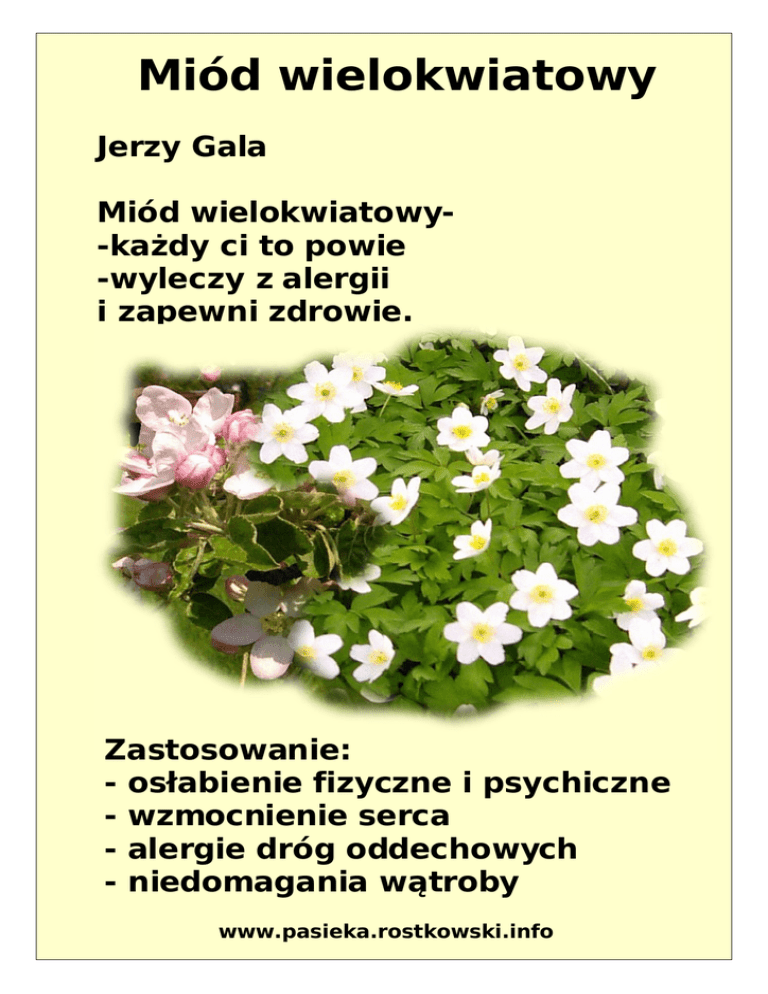 Miód wielokwiatowy Jerzy Gala Miód wielokwiatowy-każdy ci to powie -wyleczy z alergii i zapewni zdrowie. Zastosowanie: - osłabienie fizyczne i psychiczne - wzmocnienie serca - alergie dróg oddechowych - niedomagania wątroby www.pasieka.rostkowski.info