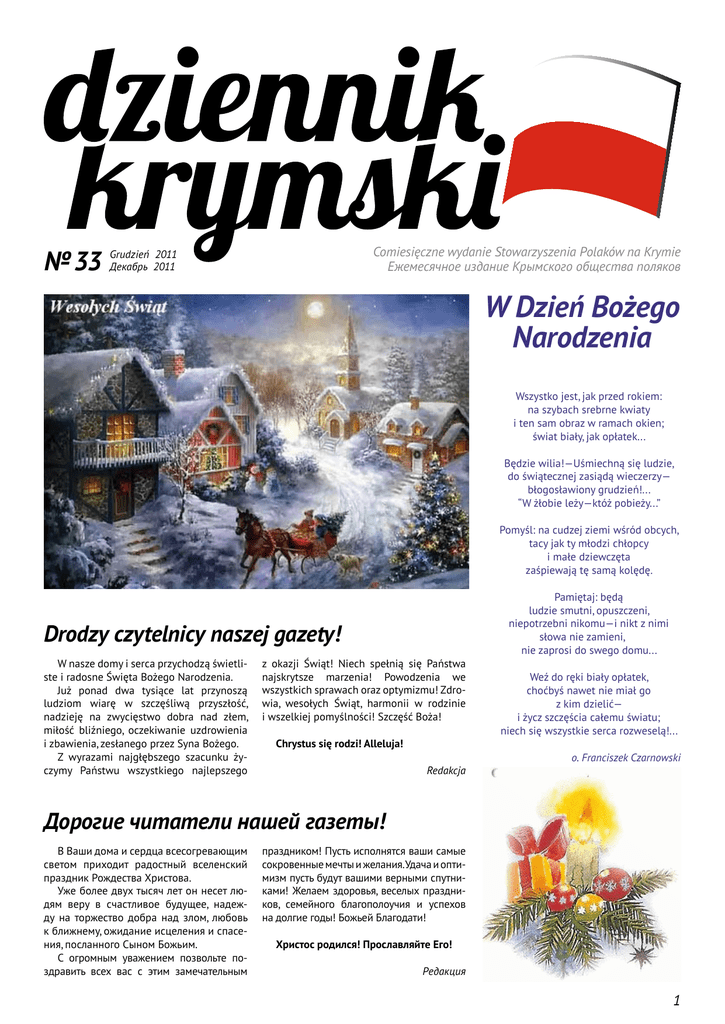 2011 № 33 Grudzień Декабрь 2011 Comiesięczne wydanie Stowarzyszenia Polaków na Krymie Ежемесячное издание Крымского общества поляков W Dzień Bożego Narodzenia Wszystko jest, jak przed rokiem: na szybach srebrne kwiaty i ten sam obraz w ramach okien; świat biały, jak opłatek... Będzie wilia!—Uśmiechną się ludzie, do świątecznej zasiądą wieczerzy— błogosławiony grudzień!... “W żłobie leży—któż pobieży...” Pomyśl: na cudzej ziemi wśród obcych, tacy jak ty młodzi chłopcy i małe dziewczęta zaśpiewają tę samą kolędę. Drodzy czytelnicy naszej gazety! W nasze domy i serca przychodzą świetliste i radosne Święta Bożego Narodzenia. Już ponad dwa tysiące lat przynoszą ludziom wiarę w szczęśliwą przyszłość, nadzieję na zwycięstwo dobra nad złem, miłość bliźniego, oczekiwanie uzdrowienia i zbawienia, zesłanego przez Syna Bożego. Z wyrazami najgłębszego szacunku życzymy Państwu wszystkiego najlepszego z okazji Świąt! Niech spełnią się Państwa najskrytsze marzenia! Powodzenia we wszystkich sprawach oraz optymizmu! Zdrowia, wesołych Świąt, harmonii w rodzinie i wszelkiej pomyślności! Szczęść Boża! Chrystus się rodzi! Alleluja! Redakcja Pamiętaj: będą ludzie smutni, opuszczeni, niepotrzebni nikomu—i nikt z nimi słowa nie zamieni, nie zaprosi do swego domu... Weź do ręki biały opłatek, choćbyś nawet nie miał go z kim dzielić— i życz szczęścia całemu światu; niech się wszystkie serca rozweselą!... o. Franciszek Czarnowski Дорогие читатели нашей газеты! В Ваши дома и сердца всесогревающим светом приходит радостный вселенский праздник Рождества Христова. Уже более двух тысяч лет он несет людям веру в счастливое будущее, надежду на торжество добра над злом, любовь к ближнему, ожидание исцеления и спасения, посланного Сыном Божьим. С огромным уважением позвольте поздравить всех вас с этим замечательным праздником! Пусть исполнятся ваши самые сокровенные мечты и желания.Удача и оптимизм пусть будут вашими верными спутниками! Желаем здоровья, веселых праздников, семейного благополоучия и успехов на долгие годы! Божьей Благодати! Христос родился! Прославляйте Его! Редакция 1 П Życzą Wszystkim radosnych Świąt Bożego Narodzenia! раздником, который в польской традиции занимает очень важное место, является Рождество. Особая атмосфера царит в канун Рождества—Сочельник (в Польше он называется Вигилия). С этим днем связано больше всего обрядов, обычаев и верований. Сочельник—самый семейный польский праздник. Практически в каждом польском доме в это уникальное время не могут пропустить елку, облатки, колядки и подарки. В канун Рождества почти все польские семьи ставят в своем доме елку и украшают ее. Это одна из самых молодых традиций Рождества. Ранее польские дома в празд- 2 ничные дни украшались только ветками или верхушками хвойных деревьев (сосны, пихты или ели), подвешенными к потолку. Они были предназначены для защиты дома и его обитателей от злых сил. А звезда, установленная обычно на верхушке, символизировала Вифлеемскую звезду. Новогодняя елка в ее нынешнем виде пришла в Польшу в восемнадцатом веке из Германии. В сельской местности элементом праздничной декорации были также вязанки злаков, снопы сена или соломы. По старинному поверью, они несли хороший урожай, достаток в доме, но также напоминали о яслях—месте рож- B oże Narodzenie zajmuje w polskiej tradycji miejsce szczególne. Wigilia jest najpiękniejszym i najbardziej rodzinnym świętem w roku, z którym wiąże się najwięcej obrzędów i wierzeń. Towarzyszą mu magiczna atmosfera, niezapomniane emocje, tradycja, kultywowana z pietyzmem od pokoleń. W prawie każdym polskim domu w tym wyjątkowym czasie nie może zabraknąć choinki, opłatka, kolęd, prezentów. Na Wigilię Bożego Narodzenia niemal każda polska rodzina umieszcza w swoim mieszkaniu i dekoruje choinkę. Jest to jedna z najmłodszych tradycji wigilijnych. Początkowo, w tym również na ziemiach polskich, popularna była „jodełka”, czyli wierzchołek sosny, jodły lub świerku zawieszony u pułapu. Drzewko to miało chronić dom i jego mieszkańców od złych mocy. A gwiazda, zawieszana często na jej szczycie, symbolizuje Gwiazdę Betlejemską. Choinka w obecnej formie przyjęła się w Polsce dopiero w XVIII w. i zwyczaj ten przeniósł sie z Niemiec. Na wsi stawiano kiedyś często niewymłócone snopy zboża w czerech kątach izby, w której odbywała sie wigilijna 