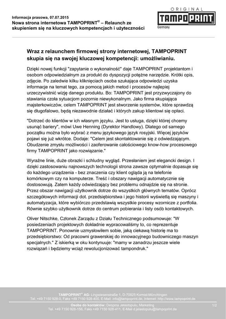 Informacja prasowa, 07.07.2015 Nowa strona internetowa TAMPOPRINT® – Relaunch ze skupieniem się na kluczowych kompetencjach i użyteczności Wraz z relaunchem firmowej strony internetowej, TAMPOPRINT skupia się na swojej kluczowej kompetencji: umożliwianiu. Dzięki nowej funkcji "zapytanie o wykonalność" daje TAMPOPRINT projektantom i osobom odpowiedzialnym za produkt do dyspozycji potężne narzędzie. Krótki opis, zdjęcie. Po zaledwie kilku kliknięciach osoba szukająca odpowiedzi uzyska informacje na temat tego, za pomocą jakich metod i procesów najlepiej urzeczywistnić wizję danego produktu. Bo: TAMPOPRINT jest przyzwyczajony do stawiania czoła sytuacjom pozornie niewykonalnym. Jako firma skupiająca majsterkowiczów, celem TAMPOPRINT jest stworzenie systemów, które sprawdzą się długofalowo, będą niezawodnie działać i których zakup klientowi się opłaci. "Dotrzeć do klientów w ich własnym języku. Jest to usługa, dzięki której chcemy usunąć bariery", mówi Uwe Henning (Dyrektor Handlowy). Dlatego od samego początku można było wybrać z menu językowego język rosyjski. Więcej języków pojawi się już wkrótce. Dodaje: "Celem jest skontaktowanie się z odwiedzającym. Obudzenie zmysłu możliwości i zaoferowanie całościowego know-how procesowego firmy TAMPOPRINT jako rozwiązanie." Wyraźne linie, duże obrazki i schludny wygląd. Przesłaniem jest elegancki design. I dzięki zastosowaniu najnowszych technologii strona zawsze optymalnie dopasuje się do każdego urządzenia - bez znaczenia czy klient ogląda ją na telefonie komórkowym czy na komputerze. Treść i obszary nawigacji automatycznie się dostosowują. Zatem każdy odwiedzający bez problemu odnajdzie się na stronie. Przez obszar nawigacji użytkownik dotrze do wszystkich głównych tematów. Oprócz szczegółowych informacji dot. przedsiębiorstwa i jego historii wyświetlą się maszyny i automatyzacja, które wybiórczo przedstawią wszystkie procesy wzornicze z portfolia. Równie szybko użytkownik dotrze do centrum pobierania i listy osób kontaktowych. Oliver Nitschke, Członek Zarządu z Działu Technicznego podsumowuje: "W posiedzeniach projektowych dokładnie wypracowaliśmy to, co reprezentuje TAMPOPRINT. Ponownie uzmysłowiłem sobie, jaką ciekawą historię ma to przedsiębiorstwo: Od pracowni grawerskiej do innowacyjnego budowniczego maszyn specjalnych." Z iskierką w oku kontynuuje: "mamy w zanadrzu jeszcze wiele rozwiązań i będziemy wciąż rewolucjonizować tampondruk." ® TAMPOPRINT AG: Lingwiesenstraße 1, D-70825 Korntal-Münchingen Tel. +49 7150 928-0, Faks +49 7150 928-400, E-Mail: [email protected], Internet: http://www.tampoprint.de Osoba do kontaktów: Despina Jelastopulu, Marketing Tel. +49 7150 928-156, Faks +49 7150 928-411, E-Mail [email protected] 1/2 Informacja prasowa, 07.07.2015 Informacja prasowa, 07.07.2015TAMPOPRINT® – Relaunch ze Nowa strona internetowa Informacja prasowa, 07.07.2015 skupieniem się na kluczowych kompetencjach i użyteczności Informacja prasowa, 07.07.2015 Strona główna nowej firmowej strony internetowej www.tampoprint.de Funkcja „zapytania o wykonalność” do pobudzenia zmysłu mozliwości Wyraźne linie i przejrzysty design. Na wszystkich urządzeniach w optymalnej rozdzielczości ® Marki TAMPOPRINT AG: ® ® ® ALFALAS , TAMPOPRINT , ClipLock Autor: Stephan Coder, Marketing Tel. +49 7150 928-194, Faks +49 7150 928-302, E-Mail [email protected] 2/2