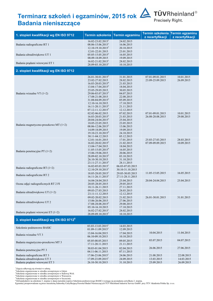 Terminarz szkoleń i egzaminów, 2015 rok Badania nieniszczące 1. stopień kwalifikacji wg EN ISO 9712 Termin szkolenia Termin egzaminu 16.02-23.02.20151 08.06-15.06.20151 12.10-19.10.20151 12.01-22.01.2015 05.05-15.05.20152 08.09-18.09.2015 16.02-21.02.20151 28.09-03.10.20151 Badania radiograficzne RT 1 Badania ultradźwiękowe UT 1 Badania prądami wirowymi ET 1 Termin szkolenia Termin egzaminu z recertyfikacji z recertyfikacji 24.02.2015 16.06.2015 20.10.2015 23.01.2015 16.05.2015 19.09.2015 28.02.2015 10.10.2015 2. stopień kwalifikacji wg EN ISO 9712 26.01-30.01.20152 23.02-27.02.2015 16.03-20.03.20154 13.04-17.04.20152 25.05-29.05.2015 29.06-03.07.20153 17.08-21.08.2015 31.08-04.09.20152 12.10-16.10.2015 16.11-20.11.20152 07.12-11.12.20155 02.02-06.02.2015 16.03-20.03.20152 20.04-24.04.20153 18.05-22.05.2015 08.06-12.06.20152 14.09-18.09.2015 19.10-23.10.20154 30.11-04.12.2015 12.01-16.01.2015 16.02-20.02.20152 13.04-17.04.2015 11.05-15.05.20154 15.06-19.06.2015 28.09-02.10.20152 26.10-30.10.2015 23.11-27.11.20153 16.02-05.03.20151 12.10-29.10.20151 18.05-28.05.20151 16.11-26.11.20151 16.04-24.04.2015 20.05-28.05.2015 18.11-26.11.2015 09.03-27.03.2015 23.11-11.12.2015 09.02-20.02.2015 15.06-26.06.2015 17.08-28.08.20152 05.10-16.10.2015 16.02-27.02.20151 28.09-09.10.20151 Badania wizualne VT (1+2) Badania magnetyczno-proszkowe MT (1+2) Badania penetracyjne PT (1+2) Badania radiograficzne RT (1+2) Badania radiograficzne RT 2 Ocena zdjęć radiograficznych RT 2 FI Badania ultradźwiękowe UT (1+2) Badania ultradźwiękowe UT 2 Badania prądami wirowymi ET (1+2) 3. stopień kwalifikacji wg EN ISO 9712 Szkolenie podstawowe BASIC Badania wizualne VT 3 Badania magnetyczno-proszkowe MT 3 Badania penetracyjne PT 3 Badania radiograficzne RT 3 Badania ultradźwiękowe UT 3 Badania prądami wirowymi ET 3 1 31.01.2015 28.02.2015 21.03.2015 18.04.2015 30.05.2015 04.07.2015 22.08.2015 05.09.2015 17.10.2015 21.11.2015 12.12.2015 07.02.2015 21.03.2015 25.04.2015 23.05.2015 13.06.2015 19.09.2015 24.10.2015 05.12.2015 17.01.2015 21.02.2015 18.04.2015 16.05.2015 20.06.2015 03.10.2015 31.10.2015 28.11.2015 06.03-07.03.2015 30.10-31.10.2015 29.05-30.05.2015 27.11-28.11.2015 25.04.2015 29.05.2015 27.11.2015 28.03.2015 12.12.2015 21.02.2015 27.06.2015 29.08.2015 17.10.2015 28.02.2015 10.10.2015 07.01-09.01.2015 23.09-25.09.2015 10.01.2015 26.09.2015 07.01-09.01.2015 26.08-28.08.2015 10.01.2015 29.08.2015 25.03-27.03.2015 07.09-09.09.2015 28.03.2015 10.09.2015 11.05-15.05.2015 16.05.2015 20.04-24.04.2015 25.04.2015 26.01-30.01.2015 31.01.2015 10.04.2015 11.04.2015 03.07.2015 04.07.2015 26.06.2015 27.06.2015 21.08.2015 13.03.2015 25.09.2015 22.08.2015 14.03.2015 26.09.2015 6 03.03-13.03.20151 01.09-11.09.20151 13.04-16.04.2015 06.10-09.10.2015 05.05-08.05.2015 17.11-20.11.2015 30.03-01.04.2015 04.11-06.11.2015 17.06-23.06.20151 17.09-23.09.20151 26.10-30.10.2015 14.03.2015 12.09.2015 17.04.2015 10.10.2015 09.05.2015 21.11.2015 02.04.2015 07.11.2015 24.06.2015 24.09.2015 31.10.2015 Zajęcia odbywają się również w sobotę. Szkolenie organizowane w ośrodku zewnętrznym w Gdyni. Szkolenie organizowane w ośrodku zewnętrznym w Stalowej Woli. 4 Szkolenie organizowane w ośrodku zewnętrznym w Warszawie. 5 Szkolenie organizowane w ośrodku zewnętrznym w Szczecinie. 6 Od kandydatów na szkolenie 3. stopnia w danej metodzie (oprócz Szkolenia podstawowego BASIC) wymaga się posiadania certyfikatu 2. stopnia. Egzaminy przeprowadzane są przez niezależną Jednostkę Certyfikującą Personel Badań Nieniszczących TÜV Rheinland Industrie Service GmbH przy TÜV Akademia Polska Sp. z o.o. 2 3 Cennik szkoleń i egzaminów, 2015 rok Badania nieniszczące 1. stopień kwalifikacji wg EN ISO 9712 Czas szkolenia Cena szkolenia netto* Cena egzaminu netto* Badania radiograficzne RT 1 56 godz. 3175 1750 Badania ultradźwiękowe UT 1 72 godz. 3575 1750 Badania prądami wirowymi ET 1 48 godz. 3850 1850 Badania wizualne VT (1+2) 40 godz. 2650 1550 Recertyfikacja VT 2 24 godz. 1350 1050 Badania magnetyczno-proszkowe MT (1+2) 40 godz. 2650 1550 Recertyfikacja MT 2 24 godz. 1350 1050 Badania penetracyjne PT (1+2) 40 godz. 2650 1550 Recertyfikacja PT 2 24 godz. 1350 1050 Badania radiograficzne RT (1+2) 120 godz. 6750 1750 Badania radiograficzne RT 2 80 godz. 3950 1750 Recertyfikacja RT 2 40 godz. 2350 1250 Ocena zdjęć radiograficznych RT 2 FI 56 godz. 2700 1650 Recertyfikacja RT 2 FI 40 godz. 1700 1050 Badania ultradźwiękowe UT (1+2) 120 godz. 6350 1750 Badania ultradźwiękowe UT 2 80 godz. 44001/48002 1750 Recertyfikacja UT 2 40 godz. 2350 1250 Badania prądami wirowymi ET (1+2) 88 godz. 4900 1850 2. stopień kwalifikacji wg EN ISO 9712 3. stopień kwalifikacji wg EN ISO 9712 Szkolenie podstawowe BASIC 80 godz. 58003 15004 Badania wizualne VT 3 32 godz. 44503 17504 Badania magnetyczno-proszkowe MT 3 32 godz. 44503 17504 Badania penetracyjne PT 3 24 godz. 43503 17504 Badania radiograficzne RT 3 50 godz. 65003 17504 Badania ultradźwiękowe UT 3 50 godz. 70003 17504 Badania prądami wirowymi ET 3 40 godz. 67503 17504 1 Cena szkolenia z wykorzystaniem własnego sprzętu. Cena szkolenia z wykorzystaniem sprzętu TÜV Akademia Polska Sp. z o.o. Cena obejmuje zakwaterowanie i pełne wyżywienie w czasie szkolenia. 4 Cena obejmuje wydanie certyfikatu, zakwaterowanie i pełne wyżywienie w czasie egzaminu. *Do ceny należy doliczyć 23% podatku VAT. 2 3 Szkolenia Personelu Badań Nieniszczących ul. Wolności 327 41-800 Zabrze tel. 32 271 64 87 fax 32 376 29 66 Certyfikacja Personelu Badań Nieniszczących ul. Wolności 327 41-800 Zabrze tel. 32 271 00 07 fax 32 271 00 07 TÜV Akademia Polska Sp. z o.o. ul. Wolności 327 41-800 Zabrze tel. 32 273 21 82 tel. 32 271 64 87 fax 32 376 29 65 [email protected] www.akademia.tuv.pl