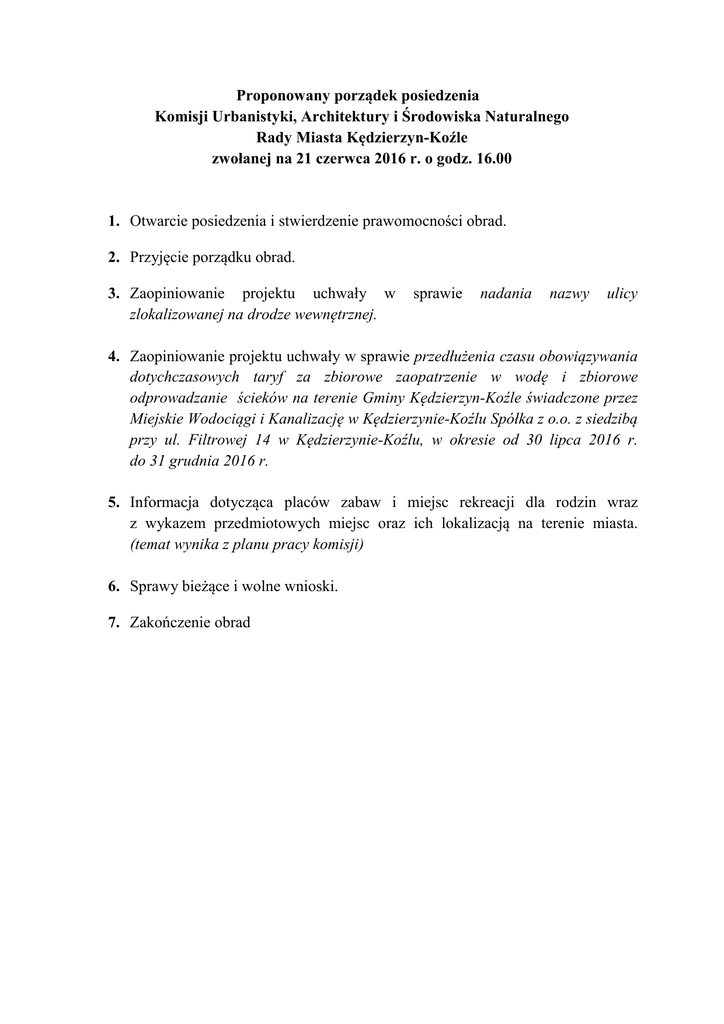 Proponowany porządek posiedzenia Komisji Urbanistyki, Architektury i Środowiska Naturalnego Rady Miasta Kędzierzyn-Koźle zwołanej na 21 czerwca 2016 r. o godz. 16.00 1. Otwarcie posiedzenia i stwierdzenie prawomocności obrad. 2. Przyjęcie porządku obrad. 3. Zaopiniowanie projektu uchwały w zlokalizowanej na drodze wewnętrznej. sprawie nadania nazwy ulicy 4. Zaopiniowanie projektu uchwały w sprawie przedłużenia czasu obowiązywania dotychczasowych taryf za zbiorowe zaopatrzenie w wodę i zbiorowe odprowadzanie ścieków na terenie Gminy Kędzierzyn-Koźle świadczone przez Miejskie Wodociągi i Kanalizację w Kędzierzynie-Koźlu Spółka z o.o. z siedzibą przy ul. Filtrowej 14 w Kędzierzynie-Koźlu, w okresie od 30 lipca 2016 r. do 31 grudnia 2016 r. 5. Informacja dotycząca placów zabaw i miejsc rekreacji dla rodzin wraz z wykazem przedmiotowych miejsc oraz ich lokalizacją na terenie miasta. (temat wynika z planu pracy komisji) 6. Sprawy bieżące i wolne wnioski. 7. Zakończenie obrad