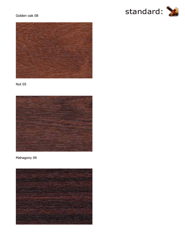 Golden oak 08 Nut 05 Mahagony 09 standard: Dark oak 04 standard: Water oak 06 Coal grey 032 (5003) Quartz grey 031 (5002) Natural oak 75 standard Plus: Winchester 076 Southen oak 65 Oregon 2053 Warm grey 066 Creme white 030 (5015) standard Plus: Quartz grey sand 061 Dark green 033 (5021) Coal grey sand 062 Brown 034 (07) Walnuss kolonial 054 (3062) premium: Cherry amaretto 053 (2043) Noce sorrento balsamico 052 (2042) Teak terra 050 (3051) Noce sorrento natur 051 (2041) premium: Metbrush silver 056 (1002) Pale grey sand 067 Rubinrot 5013 Walnuss terra 055 (3059) Blattgruen 5014