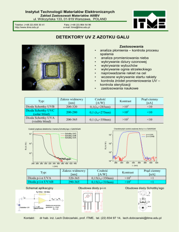 Instytut Technologii Materiałów Elektronicznych Zakład Zastosowań Materiałów AIIIBV ul. Wólczyńska 133, 01-919 Warszawa, POLAND Telefon: (+48 22) 835 30 41 http://www.itme.edu.pl Faks: (+48 22) 864 54 96 e-mail: [email protected] DETEKTORY UV Z AZOTKU GALU • • • • • • • • • Typ: Dioda Schottky UVB Dioda Schottky UVC (solar blind) Dioda Schottky UVA (visible blind) Zastosowania analiza płomienia – kontrola procesu spalania analiza promieniowania nieba wykrywanie dziury ozonowej wykrywanie wybuchów wykrywanie ognia strzeleckiego naprowadzanie rakiet na cel wczesne wykrywanie startu rakiety kontrola źródeł promieniowania UV – kontrola sterylizacji zastosowania naukowe >103 Prąd ciemny [nA] <10 0,1 (λ0=275nm) >102 <10 0,1 (λ0=350nm) >103 <10 Zakres widmowy [nm] 200-320 Czułość [A/W] 0,1(λ0=285nm) 200-280 200-365 Charakterystyki czułości prądowej diod p-i-n z GaN/AlGaN Czułość prądowa detektorów z barierą Schottky'ego z GaN/AlGaN Schottky UVC Schottky UVB Schottky UVA 10-1 R(A/ W) R(A/ W) 10-1 Kontrast 10-2 p-i-n UVA p-i-n UVAB 10-2 10-3 10-3 10-4 240 260 280 300 320 340 360 380 400 420 440 280 300 320 Typ: Dioda p-i-n UVA Dioda p-i-n UVAB Schemat aplikacyjny Kontakt: 340 360 380 400 420 λ (nm) λ (nm) Zakres widmowy [nm] 320-365 290-365 Czułość [A/W] 0,15(λ0=350nm) 0,15(λ0=310nm) Obudowa diody p-i-n Kontrast >103 >103 Prąd ciemny [nA] <1 <1 Obudowa diody Schottky’ego dr hab. inż. Lech Dobrzański, prof. ITME, tel. (22) 834 97 14, [email protected] DYFRAKCYJNE ELEMENTY OPTYCZNE PRZYKŁADY ZASTOSOWANIA ELEMENTY WYTWARZANE W ITME • • • soczewki sferyczne, cylindryczne, eliptyczne, aksikony fazowe siatki dyfrakcyjne hologramy generowane komputerowo • formowanie wiązek diod laserowych TECHNOLOGIA • • • • • • sekwencja procesów mikrolitograficznych obejmujących generację wzorów dyfrakcyjnych wiązką elektronów oraz formowanie profilu fazowego w procesach reaktywnego trawienia jonowego dowolna geometria wzorów dyfrakcyjnych liczba poziomów fazowych od 2 do 16 minimalna szerokość stopnia fazowego 0.4 µm, minimalna wysokość stopnia fazowego 0.02 µm materiały podłożowe: kwarc, krzem, GaAs, InP kształt wiązki emitowanej przez diodę laserową przykłady rozkładu natężenia wiązek formowanychj przez eliptyczne płytki fazowe - oświetlacze powodujące chwilową utratę zdolności widzenia (urządzenia olśniewajace) - oświetlacze przeszkodowe (lotnictwo) • monolityczne macierze mikrosoczewek do ogniskowania światła w aktywnym obszarze detektorów promieniowania profil 3D kwarcowej soczewki dyfrakcyjnej f/5 o 8 poziomach fazowych błędy profilu poniżej 2%, wydajność dyfrakcyjna 92% ZALETY • lekka i zwarta budowa odpowiadająca wymogom miniaturyzacji • realna możliwość wytwarzania elementów zapewniających • złożone transformacje frontu falowego = redukcja układu • optycznego, zwiększenie jego niezawodności i trwałości • wydajność dyfrakcyjna sięgająca 95% • planarne techniki wytwarzania umożliwiające jednoczesne • wykonanie wielu elementów w obrębie jednego podłoża oraz ich tanią replikację • planarna budowa ułatwiająca integrację z elementami • elektronicznymi i mechanicznymi (struktury MOEMS) fragment macierzy mikrosoczewek o prostokątnej aperturze środkowy fragment pojedynczej mikrosoczewki (fotografie SEM) - detekcja źródeł promieniowania ultrafioletowego, widzialnego i podczerwieni • optyczne analizatory sygnałów impulsowych schemat analizatora z elementami optycznymi w wersji klasyczneji dyfrakcyjnej (elementry DOE I i DOE II) – projekt INOS – systemy identyfikacji sygnałów radarowych układ zmontowany w standardowej obudowie TO3 • sensory zaburzeń wnoszonych przez turbulencje powietrza fragment wzoru dyfrakcyjnego złożony układ dyfrakcyjny do ogniskowania wiązek światłaemitowanych przez macierz diod laserowych – układy namierzania pozycji • elementy optyki adaptatywnej KONTAKT: dr inż. Andrzej Kowalik, tel. 0 22 835 30 41 w. 417, [email protected]