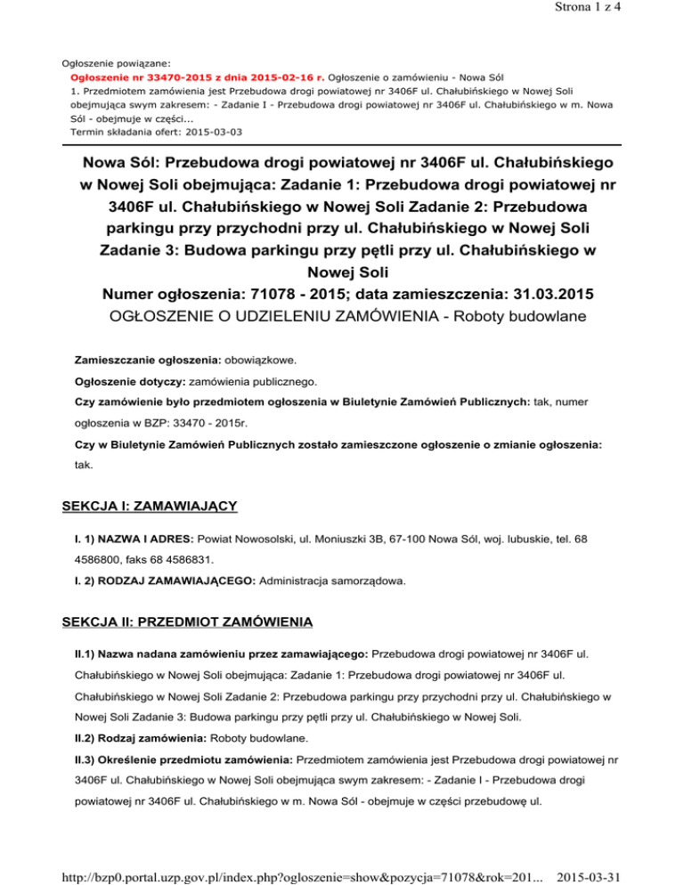 Strona 1 z 4 Ogłoszenie powiązane: Ogłoszenie nr 33470-2015 z dnia 2015-02-16 r. Ogłoszenie o zamówieniu - Nowa Sól 1. Przedmiotem zamówienia jest Przebudowa drogi powiatowej nr 3406F ul. Chałubińskiego w Nowej Soli obejmująca swym zakresem: - Zadanie I - Przebudowa drogi powiatowej nr 3406F ul. Chałubińskiego w m. Nowa Sól - obejmuje w części... Termin składania ofert: 2015-03-03 Nowa Sól: Przebudowa drogi powiatowej nr 3406F ul. Chałubińskiego w Nowej Soli obejmująca: Zadanie 1: Przebudowa drogi powiatowej nr 3406F ul. Chałubińskiego w Nowej Soli Zadanie 2: Przebudowa parkingu przy przychodni przy ul. Chałubińskiego w Nowej Soli Zadanie 3: Budowa parkingu przy pętli przy ul. Chałubińskiego w Nowej Soli Numer ogłoszenia: 71078 - 2015; data zamieszczenia: 31.03.2015 OGŁOSZENIE O UDZIELENIU ZAMÓWIENIA - Roboty budowlane Zamieszczanie ogłoszenia: obowiązkowe. Ogłoszenie dotyczy: zamówienia publicznego. Czy zamówienie było przedmiotem ogłoszenia w Biuletynie Zamówień Publicznych: tak, numer ogłoszenia w BZP: 33470 - 2015r. Czy w Biuletynie Zamówień Publicznych zostało zamieszczone ogłoszenie o zmianie ogłoszenia: tak. SEKCJA I: ZAMAWIAJĄCY I. 1) NAZWA I ADRES: Powiat Nowosolski, ul. Moniuszki 3B, 67-100 Nowa Sól, woj. lubuskie, tel. 68 4586800, faks 68 4586831. I. 2) RODZAJ ZAMAWIAJĄCEGO: Administracja samorządowa. SEKCJA II: PRZEDMIOT ZAMÓWIENIA II.1) Nazwa nadana zamówieniu przez zamawiającego: Przebudowa drogi powiatowej nr 3406F ul. Chałubińskiego w Nowej Soli obejmująca: Zadanie 1: Przebudowa drogi powiatowej nr 3406F ul. Chałubińskiego w Nowej Soli Zadanie 2: Przebudowa parkingu przy przychodni przy ul. Chałubińskiego w Nowej Soli Zadanie 3: Budowa parkingu przy pętli przy ul. Chałubińskiego w Nowej Soli. II.2) Rodzaj zamówienia: Roboty budowlane. II.3) Określenie przedmiotu zamówienia: Przedmiotem zamówienia jest Przebudowa drogi powiatowej nr 3406F ul. Chałubińskiego w Nowej Soli obejmująca swym zakresem: - Zadanie I - Przebudowa drogi powiatowej nr 3406F ul. Chałubińskiego w m. Nowa Sól - obejmuje w części przebudowę ul. http://bzp0.portal.uzp.gov.pl/index.php?ogloszenie=show&pozycja=71078&rok=201... 2015-03-31 Strona 2 z 4 Chałubińskiego na odcinku od mostu nad rzeką Czarna Struga do skrzyżowania dr. powiatową nr 3465F ul. Północnej; - Zadanie II - Przebudowa parkingu przy przychodni przy ul. Chałubińskiego w m. Nowa Sól obejmuje w całości przebudowę parkingu przy przychodni, - Zadanie III - Budowa parkingu przy pętli przy ul. Chałubińskiego w m. Nowa Sól - obejmuje budowę parkingu przy pętli autobusowe; i polegać będzie w szczególności na następujących działaniach: 1) wykonaniu robót przygotowawczych: - usunięciu drzew wraz z wywozem; - mechaniczne karczowanie pni drzew z wywozem na składowisko; - karczowanie krzewów i podszycia z wywozem na składowisko; 2) wykonaniu rozbiórek elementów ulicy, miedzy innymi: - cięcie nawierzchni bitumicznej; - rozbiórka nawierzchni z betonowych płyt chodnikowych 30x30 gr. 5cm; rozebranie nawierzchni z betonowej kostki brukowej gr. 8cm (materiał do ponownego wbudowania); rozebranie nawierzchni z betonu asfaltowego gr. 5-7cm; - podbudowy z kruszywa łamanego gr. 20cm (materiał częściowo do ponownego wbudowania); - rozebranie nawierzchni z betonowych płyt -trylinki gr. 15cm; - rozebranie krawężników z ławami betonowymi i obrzeży chodnikowych; - rozebranie podbudowy z betonu gr. 20cm; - demontaż odbojnic wraz z transportem; - rozebranie metalowych ogrodzeń siatkowych wys. 150cm wraz z transportem i składowaniem; - demontaż baneru reklamowego wraz z transportem oraz składowaniem; - ścieku z betonowych prefabrykatów szer. 60 cm: - frezowaniu istniejącej nawierzchni bitumicznej - bariery łańcuchowej U-12b - rozbiórka kanału deszczowego wraz z robotami ziemnymi i wywozem na składowisko i utylizacją; - demontaż wpustów ulicznych w miejsce wskazane przez inwestora - studzienek ściekowych i rewizyjnych wraz z robotami ziemnymi i wywozem na składowisko i utylizacją; 3) wykonaniu robot ziemnych: - wykonanie wykopów mechanicznych i ręcznych z wywozem i utylizacją urobku; - wykonanie wykopów mechanicznie z transportem urobku na terenie budowy, - wykonanie robót ziemnych pod odwodnienie - formowanie i zagęszczanie nasypu; 4) wykonaniu warstw podbudowy: profilowanie i zagęszczanie podłoża w wykopie; - oczyszczenie i skroplenie warstw konstrukcyjnych; - pod nawierzchnię jezdnię i parkingów podbudowa pomocnicza z kruszywa łamanego stabilizowanego mechanicznie grubości 20 cm (materiał w części z rozbiórki); - podbudowa zasadnicza z betonu cementowego C16/20 (B20) grubości do 25 cm z wykonaniem szczelin dylatacyjnych; - pod nawierzchnię jezdni podbudowa zasadnicza z betonu asfaltowego grubości 7 cm; - warstwa wyrównawczo-profilująca z betonu asfaltowego; - warstwa wyrównawczo-profilująca z kruszywa stabilizowanego mechanicznie; warstwa kruszywa stabilizowanego cementem o Rm=2,5MPa gr. 10 cm; 5) wykonaniu nawierzchni i ich elementów: - nawierzchnia jezdni warstwa ścieralna z betonu asfaltowego grubości 5 cm; - warstwa wiążąca z betonu asfaltowego grubości 5 cm; - frezowanie nawierzchnia bitumicznej gr. 6cm wraz z wywozem ścinki na składowisko inwestora; - nawierzchnia parkingu przy przychodni i chodników z betonowej kostki brukowej, bez fazy, szarej gr. 8 cm na podsypce cementowo - piaskowej gr. 5 cm (materiał w części z rozbiórki); - nawierzchnia parkingu przy pętli z ekologicznej betonowej kostki brukowej, bez fazy, szarej gr. 8 cm na podsypce cementowo - piaskowej gr. 5 cm; - nawierzchnia zjazdów i ścieżki rowerowej z betonowej kostki brukowej, bez fazy, kolorowej gr. 8 cm na podsypce cementowo - piaskowej gr. 5 cm; - wbudowanie krawężników betonowych 15 x 30 na ławie betonowej z oporem z betonu C8/10 http://bzp0.portal.uzp.gov.pl/index.php?ogloszenie=show&pozycja=71078&rok=201... 