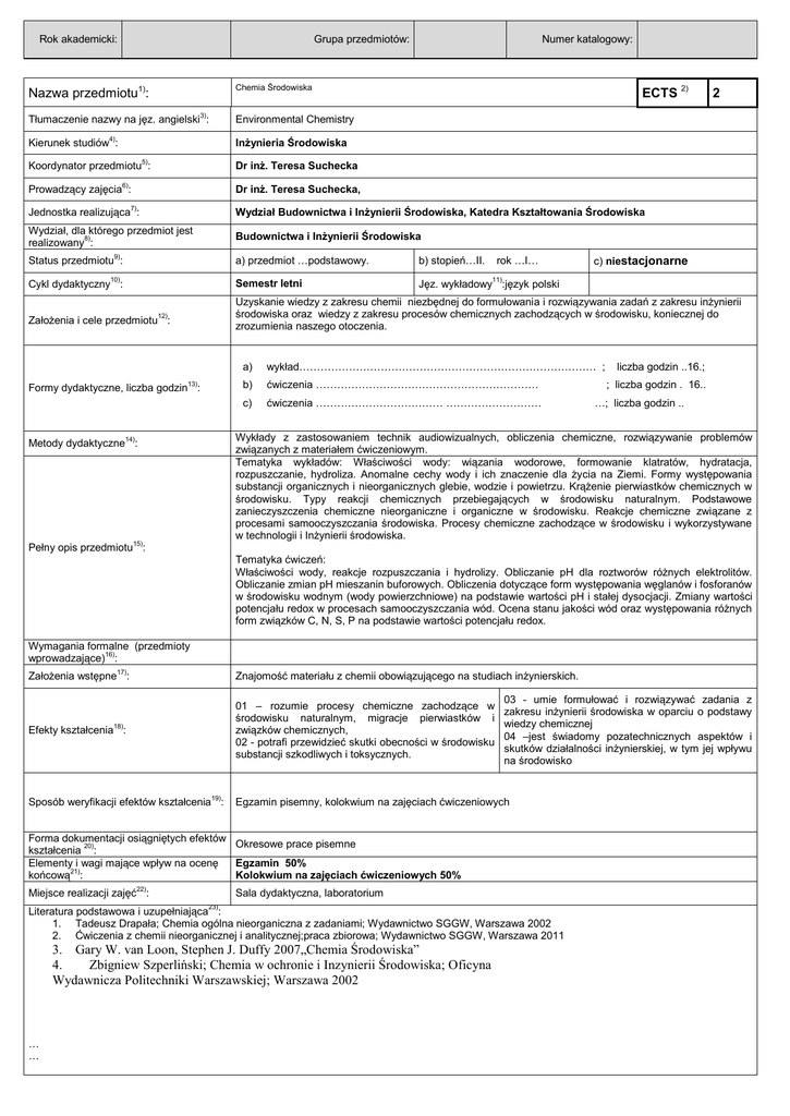 Grupa przedmiotów: Rok akademicki: Nazwa przedmiotu1): Chemia Środowiska Tłumaczenie nazwy na jęz. angielski3): Environmental Chemistry 4) Kierunek studiów : Inżynieria Środowiska Koordynator przedmiotu5): Dr inż. Teresa Suchecka Prowadzący zajęcia6): Dr inż. Teresa Suchecka, 7) Numer katalogowy: ECTS 2) Jednostka realizująca : Wydział Budownictwa i Inżynierii Środowiska, Katedra Kształtowania Środowiska Wydział, dla którego przedmiot jest realizowany8): Budownictwa i Inżynierii Środowiska 9) Status przedmiotu : a) przedmiot …podstawowy. b) stopień…II. rok …I… Cykl dydaktyczny10): Semestr letni Jęz. wykładowy11):język polski 2 c) niestacjonarne Uzyskanie wiedzy z zakresu chemii niezbędnej do formułowania i rozwiązywania zadań z zakresu inżynierii środowiska oraz wiedzy z zakresu procesów chemicznych zachodzących w środowisku, koniecznej do zrozumienia naszego otoczenia. 12) Założenia i cele przedmiotu : 13) Formy dydaktyczne, liczba godzin : Metody dydaktyczne14): Pełny opis przedmiotu15): a) wykład………………………………………………………………………… ; b) ćwiczenia ……………………………………………………… c) ćwiczenia ……………………………… ……………………… liczba godzin ..16.; ; liczba godzin . 16.. …; liczba godzin .. Wykłady z zastosowaniem technik audiowizualnych, obliczenia chemiczne, rozwiązywanie problemów związanych z materiałem ćwiczeniowym. Tematyka wykładów: Właściwości wody: wiązania wodorowe, formowanie klatratów, hydratacja, rozpuszczanie, hydroliza. Anomalne cechy wody i ich znaczenie dla życia na Ziemi. Formy występowania substancji organicznych i nieorganicznych glebie, wodzie i powietrzu. Krążenie pierwiastków chemicznych w środowisku. Typy reakcji chemicznych przebiegających w środowisku naturalnym. Podstawowe zanieczyszczenia chemiczne nieorganiczne i organiczne w środowisku. Reakcje chemiczne związane z procesami samooczyszczania środowiska. Procesy chemiczne zachodzące w środowisku i wykorzystywane w technologii i Inżynierii środowiska. Tematyka ćwiczeń: Właściwości wody, reakcje rozpuszczania i hydrolizy. Obliczanie pH dla roztworów różnych elektrolitów. Obliczanie zmian pH mieszanin buforowych. Obliczenia dotyczące form występowania węglanów i fosforanów w środowisku wodnym (wody powierzchniowe) na podstawie wartości pH i stałej dysocjacji. Zmiany wartości potencjału redox w procesach samooczyszczania wód. Ocena stanu jakości wód oraz występowania różnych form związków C, N, S, P na podstawie wartości potencjału redox. Wymagania formalne (przedmioty wprowadzające)16): Założenia wstępne17): Znajomość materiału z chemii obowiązującego na studiach inżynierskich. Efekty kształcenia18): 01 – rozumie procesy chemiczne zachodzące w środowisku naturalnym, migracje pierwiastków i związków chemicznych, 02 - potrafi przewidzieć skutki obecności w środowisku substancji szkodliwych i toksycznych. Sposób weryfikacji efektów kształcenia19): Egzamin pisemny, kolokwium na zajęciach ćwiczeniowych 03 - umie formułować i rozwiązywać zadania z zakresu inżynierii środowiska w oparciu o podstawy wiedzy chemicznej 04 –jest świadomy pozatechnicznych aspektów i skutków działalności inżynierskiej, w tym jej wpływu na środowisko Forma dokumentacji osiągniętych efektów Okresowe prace pisemne kształcenia 20): Egzamin 50% Elementy i wagi mające wpływ na ocenę Kolokwium na zajęciach ćwiczeniowych 50% końcową21): Miejsce realizacji zajęć22): Sala dydaktyczna, laboratorium Literatura podstawowa i uzupełniająca23): 1. Tadeusz Drapała; Chemia ogólna nieorganiczna z zadaniami; Wydawnictwo SGGW, Warszawa 2002 2. Ćwiczenia z chemii nieorganicznej i analitycznej;praca zbiorowa; Wydawnictwo SGGW, Warszawa 2011 3. Gary W. van Loon, Stephen J. Duffy 2007„Chemia Środowiska” 4. Zbigniew Szperliński; Chemia w ochronie i Inzynierii Środowiska; Oficyna Wydawnicza Politechniki Warszawskiej; Warszawa 2002 … … UWAGI24): Wskaźniki ilościowe charakteryzujące moduł/przedmiot 25) : Szacunkowa sumaryczna liczba godzin pracy studenta (kontaktowych i pracy własnej) niezbędna dla osiągnięcia zakładanych efektów kształcenia18) - na tej podstawie należy wypełnić pole ECTS2: …55 h Łączna liczba punktów ECTS, którą student uzyskuje na zajęciach wymagających bezpośredniego udziału nauczycieli akademickich: …2. ECTS Łączna liczba punktów ECTS, którą student uzyskuje w ramach zajęć o charakterze praktycznym, takich jak zajęcia laboratoryjne, projektowe, itp.: ……1 ECTS Tabela zgodności kierunkowych efektów kształcenia efektami przedmiotu Nr /symbol efektu 01 26) Wymienione w wierszu efekty kształcenia: rozumie procesy chemiczne zachodzące w środowisku naturalnym, migracje pierwiastków Odniesienie do efektów dla programu kształcenia na kierunku K_W01+ i związków chemicznych, 02 potrafi przewidzieć skutki obecności w środowisku substancji szkodliwych i toksycznych. K_W01+; K_W05+ 03 umie formułować i rozwiązywać zadania z zakresu inżynierii środowiska w oparciu o podstawy wiedzy chemicznej K_U01+; K_U02+;K_U05+; K_K02++; 04 Jest świadomy pozatechnicznych aspektów i skutków działalności inżynierskiej, w tym jej wpływu na środowisko K_K04++; K_K10+++ 05 K_K03+; K_K10+++