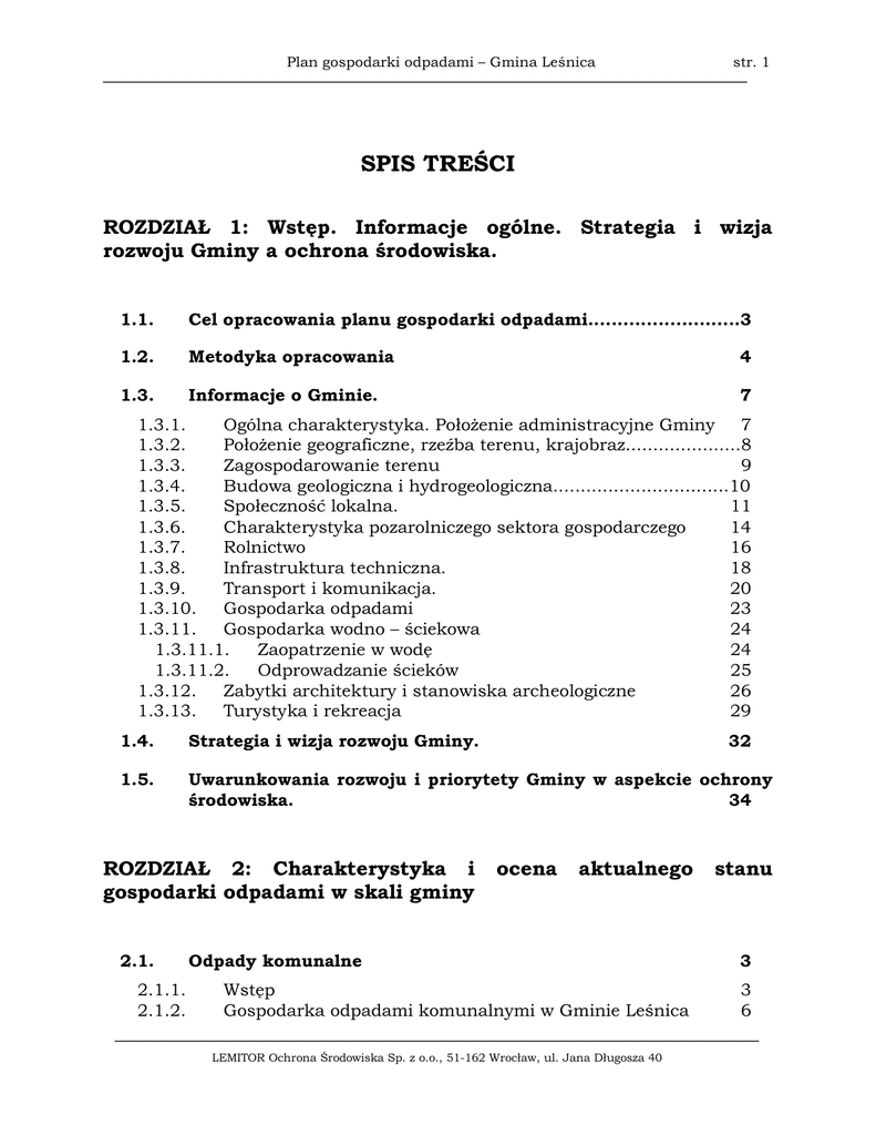 Plan gospodarki odpadami – Gmina Leśnica str. 1 ––––––––––––––––––––––––––––––––––––––––––––––––––––––––––––––––––––––––––– SPIS TREŚCI ROZDZIAŁ 1: Wstęp. Informacje ogólne. Strategia i wizja rozwoju Gminy a ochrona środowiska. 1.1. Cel opracowania planu gospodarki odpadami..........................3 1.2. Metodyka opracowania 4 1.3. Informacje o Gminie. 7 1.3.1. Ogólna charakterystyka. Położenie administracyjne Gminy 7 1.3.2. Położenie geograficzne, rzeźba terenu, krajobraz.....................8 1.3.3. Zagospodarowanie terenu 9 1.3.4. Budowa geologiczna i hydrogeologiczna................................10 1.3.5. Społeczność lokalna. 11 1.3.6. Charakterystyka pozarolniczego sektora gospodarczego 14 1.3.7. Rolnictwo 16 1.3.8. Infrastruktura techniczna. 18 1.3.9. Transport i komunikacja. 20 1.3.10. Gospodarka odpadami 23 1.3.11. Gospodarka wodno – ściekowa 24 1.3.11.1. Zaopatrzenie w wodę 24 1.3.11.2. Odprowadzanie ścieków 25 1.3.12. Zabytki architektury i stanowiska archeologiczne 26 1.3.13. Turystyka i rekreacja 29 1.4. Strategia i wizja rozwoju Gminy. 1.5. Uwarunkowania rozwoju i priorytety Gminy w aspekcie ochrony środowiska. 34 ROZDZIAŁ 2: Charakterystyka i gospodarki odpadami w skali gminy 2.1. 2.1.1. 2.1.2. 32 ocena aktualnego Odpady komunalne Wstęp Gospodarka odpadami komunalnymi w Gminie Leśnica stanu 3 3 6 ––––––––––––––––––––––––––––––––––––––––––––––––––––––––––––––––––––––––––– LEMITOR Ochrona Środowiska Sp. z o.o., 51-162 Wrocław, ul. Jana Długosza 40 Plan gospodarki odpadami – Gmina Leśnica str. 2 ––––––––––––––––––––––––––––––––––––––––––––––––––––––––––––––––––––––––––– 2.1.2.1. 2.1.2.2. 2.1.2.3. 2.1.2.4. 2.2. Składowiska odpadów komunalnych 9 „Dzikie wysypiska” odpadów 14 Selektywna zbiórka odpadów 14 Gospodarka odpadami komunalnymi – podsumowanie. 15 Gospodarka odpadami przemysłowymi 16 2.2.1. 2.2.2. Wstęp 16 Podstawa prawna gospodarowania odpadami przemysłowymi – prawo polskie 19 2.2.3. Podstawa prawna gospodarowania odpadami przemysłowymi – prawo UE 21 2.2.4. Gospodarowanie odpadami przemysłowymi w Gminie Leśnica22 2.2.4.1. Bilans odpadów przemysłowych wytwarzanych przez przedsiębiorstwa w Gminie Leśnica 24 2.2.4.2. Charakterystyka obiektów gospodarki odpadami przemysłowymi. 28 2.2.4.2.1. Podmioty prowadzące działalność w zakresie transportu i zbierania odpadów na terenie Gminy. 28 2.2.4.2.2. Podmioty prowadzące działalność w zakresie odzysku i unieszkodliwiania odpadów na terenie Gminy Leśnica 29 2.2.4.2.3. Składowiska odpadów przemysłowych 29 ROZDZIAŁ 3: Plan gospodarki odpadami w perspektywie strategicznej do 2015r., średniookresowej do 2011r. i krótkoterminowej do 2007r. 3.1. Prognozowane zmiany w zakresie gospodarki odpadami i plan gospodarki odpadami 3 3.1.1. Odpady komunalne. 3 3.1.1.1. Odpady biodegradowalne w strumieniu odpadów komunalnych. 4 3.1.1.2. Odpady wielkogabarytowe 11 3.1.1.3. Odpady budowlane w strumieniu odpadów komunalnych14 3.1.1.4. Odpady niebezpieczne w strumieniu odpadów komunalnych 16 3.1.1.5. Składowanie odpadów komunalnych 25 3.1.2. Odpady pochodzące z sektora gospodarczego. 26 3.1.2.1. Odpady z sektora remontowo – budowlanego 27 3.1.2.2. Odpady opakowaniowe 29 3.1.2.3. Odpady zużytych opon 43 3.1.3. Odpady niebezpieczne 45 ––––––––––––––––––––––––––––––––––––––––––––––––––––––––––––––––––––––––––– LEMITOR Ochrona Środowiska Sp. z o.o., 51-162 Wrocław, ul. Jana Długosza 40 Plan gospodarki odpadami – Gmina Leśnica str. 3 ––––––––––––––––––––––––––––––––––––––––––––––––––––––––––––––––––––––––––– 3.1.3.1. 3.1.3.2. 3.1.3.3. 3.1.3.4. 3.1.3.5. 3.1.3.6. 3.1.3.7. 3.1.3.8. Odpady zawierające azbest 45 Odpady zawierające PCB 46 Oleje odpadowe 47 Baterie i akumulatory 49 Zużyte urządzenia elektryczne i elektroniczne 51 Odpady medyczne i weterynaryjne 52 Wyeksploatowane pojazdy 54 Odpady powstałe w wyniku wypadków i zdarzeń losowych55 3.2. Podsumowanie 3.3. Systemy gospodarowania odpadami na terenie Gminy Leśnica63 3.3.1. 3.3.2. 3.3.3. 55 Założenia 65 System gospodarowania odpadami na terenie Gminy 67 PZGO - Centrum Unieszkodliwiania, Przetwarzania i Czasowego Magazynowania Odpadów Innych Niż Niebezpieczne i Niebezpiecznych. 73 3.4. System monitoringu i oceny realizacji zamierzonych celów 76 3.5. Analiza oddziaływania środowisko 3.6. Streszczenie w języku niespecjalistycznym Planu Gospodarki Odpadami 79 Planu Gospodarki Odpadami na 78 ROZDZIAŁ 4: Kompetencje i obowiązki Gminy. Finansowanie gospodarki odpadami w Gminie. Harmonogram wrażania i koszty zadań własnych Gminy. 4.1. 4.1.1. 4.1.2. 4.1.3. 4.1.4. 4.1.4. 4.1.5. Kompetencje odpadami. i obowiązki Gminy w zakresie gospodarki 3 Zasady ogólne wynikające z ustawy POŚ. Zagospodarowanie przestrzenne. Utrzymywanie czystości i porządku. Gospodarka odpadami. Opakowania i odpady opakowaniowe. Inspekcja Ochrony Środowiska. 3 6 10 12 12 13 4.2. Finansowanie gospodarki odpadami w Gminie 13 4.3. Potencjalne źródła finansowania inwestycji proekologicznych16 4.3.1. Rynki finansowe 17 –––––––––––––––––––––––––––––––––––––––––––––––––––––––––––