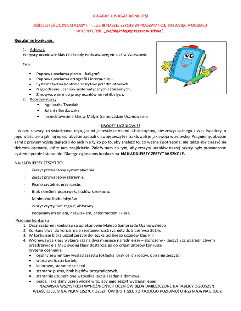 UWAGA! UWAGA! KONKURS! JEŚLI JESTEŚ UCZNIEM KLASY I, II LUB III NASZEJ SZKOŁY ZAPRASZAMY CIĘ DO WZIĘCIA UDZIAŁU W KONKURSIE „Najpiękniejszy zeszyt w szkole”. Regulamin konkursu: 1. Adresat: Wszyscy uczniowie klas I-III Szkoły Podstawowej Nr 112 w Warszawie Cele: Poprawa poziomu pisma – kaligrafii Poprawa poziomu ortografii i interpunkcji. Systematyczna kontrola zeszytów przedmiotowych. Nagrodzenie uczniów systematycznych i starannych. Zmotywowanie do pracy uczniów mniej dbałych. 2. Koordynatorzy Agnieszka Trzeciak Jolanta Bartkowska przedstawiciele klas w Małym Samorządzie Uczniowskim DRODZY UCZNIOWIE! Wasze zeszyty to świadectwo tego, jakimi jesteście uczniami. Chcielibyśmy, aby zeszyt każdego z Was świadczył o jego właścicielu jak najlepiej, abyście zadbali o swoje zeszyty i traktowali je jak swoja wizytówkę. Pragniemy, abyście sami z przyjemnością zaglądali do nich nie tylko po to, aby znaleźć to, co ważne i potrzebne, ale także aby cieszyć sie dobrymi ocenami, które tam znajdziecie. Zależy nam na tym, aby zeszyty uczniów naszej szkoły były prowadzone systematycznie i starannie. Dlatego ogłaszamy konkurs na NAJŁADNIEJSZY ZESZYT W SZKOLE. NAJŁADNIEJSZY ZESZYT TO: · Zeszyt prowadzony systematycznie. · Zeszyt prowadzony starannie. · Pismo czytelne, przejrzyste. · Brak skreśleń, poprawek, śladów korektora. · Minimalna liczba błędów · Zeszyt czysty, bez zagięć, obłożony · Podpisany imieniem, nazwiskiem, przedmiotem i klasą. Przebieg konkursu 1. Organizatorem konkursu są opiekunowie Małego Samorządu Uczniowskiego 2. Konkurs trwa do końca maja i zostanie rozstrzygnięty do 5 czerwca 2014r. 3. W konkursie biorą udział zeszyty do języka polskiego uczniów klas I-III 4. Wychowawca klasy wybiera raz na dwa miesiące najładniejszy – skończony - zeszyt i za pośrednictwem przedstawiciela MSU swojej klasy dostarcza go do organizatorów konkursu. Kryteria oceniania: ogólny zewnętrzny wygląd zeszytu (okładka, brak oślich rogów, opisanie zeszytu) właściwa liczba kartek, kolorowe, staranne szlaczki staranne pismo, brak błędów ortograficznych, starannie uzupełnione wszystkie lekcje i zadania domowe, praca, jaką dany uczeń włożył w to, aby jego zeszyt wyglądał lepiej. NAZWISKA WSZYSTKICH WYRÓŻNIONYCH UCZNIÓW BĘDĄ UMIESZCZONE NA TABLICY OGŁOSZEŃ. WŁAŚCICIELE 9 NAJPIĘKNIEJSZYCH ZESZYTÓW (PO TRZECH Z KAŻDEGO POZIOMU) OTRZYMAJĄ NAGRODY.