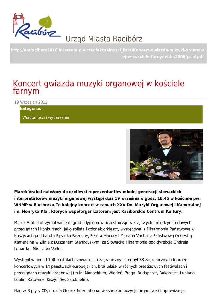 Urząd Miasta Racibórz http://umraciborz2016.intracom.pl/urzad/aktualnosci_lista/Koncert-gwiazda-muzyki-organow ej-w-kosciele-farnym/idn:2508/printpdf Koncert gwiazda muzyki organowej w kościele farnym 19 Wrzesień 2012 kategoria: Wiadomości i wydarzenia Marek Vrabel należący do czołówki reprezentantów młodej generacji słowackich interpretatorów muzyki organowej wystąpi dziś 19 września o godz. 18.45 w kościele pw. WNMP w Raciborzu.To kolejny koncert w ramach XXV Dni Muzyki Organowej i Kameralnej im. Henryka Klai, których współorganizatorem jest Raciborskie Centrum Kultury. Marek Vrabel otrzymał wiele nagród i dyplomów uczestnicząc w krajowych i międzynarodowych przeglądach i konkursach. Jako solista i członek orkiestry występował z Filharmonią Państwową w Koszycach pod batutą Bystrika Rezuchy, Petera Macury i Mariana Vacha, z Państwową Orkiestrą Kameralną w Zlinie z Duszanem Stankovskym, ze Słowacką Filharmonią pod dyrekcją Ondreja Lenarda i Miroslava Valka. Wystąpił w ponad 100 recitalach słowackich i zagranicznych, odbył 38 zagranicznych tournée koncertowych w 14 państwach europejskich, brał udział w różnych prestiżowych festiwalach i przeglądach muzyki organowej (m.in. Monachium, Wiedeń, Praga, Budapeszt, Bukareszt, Lublana, Lublin, Katowice, Kiszyniów, Sztokholm). Nagrał 3 płyty CD, np. dla Gratex International własne kompozycje organowe i improwizacje. Niektóre dzieła autorów współczesnych zostały mu dedykowane. Nagrywa dla Telewizji Słowackiej, Telewizji Czeskiej, dla Słowackiego Radia i Czeskiego Radia. Równolegle z działalnością koncertową uczy gry na organach w Konserwatorium Muzyki Kościelnej w Bratysławie, gdzie od 2000 roku jest kierownikiem Katedry Muzyki Kościelnej i Organowej. Marek Vrabel wystąpi ze swoim recitalem dziś o godz. 18.45 w kościele farnym w Raciborzu. Z kolei za tydzień, 26 września na raciborskich Dniach wystąpią Paweł Hulisz (trąbka) i Andrzej Szadejko (organy) z Gdańska. /RCK/