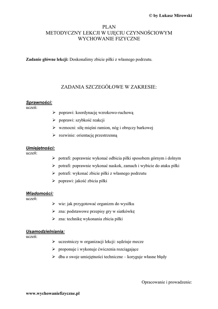 E\àXNDV]0LURZVNL 3/$1 0(72'<&=1</(.&-,:8-&,8&=<112&,2:<0 :<&+2:$1,(),=<&=1( =DGDQLHJáyZQHOHNFML 'RVNRQDOLP\]ELFLHSLáNL]ZáDVQHJRSRGU]XWX =$'$1,$6=&=(*Ïà2:(:=$.5(6,( 6SUDZQRFL XF]H ¾ SRSUDZLNRRUG\QDFM Z]URNRZRUXFKRZ ¾ SRSUDZLV]\ENRüUHDNFML ¾ Z]PRFQLVLá PL QLUDPLRQQyJLREU F]\EDUNRZHM ¾ UR]ZLQLHRULHQWDFM SU]HVWU]HQQ 8PLHM WQRFL XF]H ¾ SRWUDILSRSUDZQLHZ\NRQDüRGELFLDSLáNLVSRVREHPJyUQ\PLGROQ\P ¾ SRWUDILSRSUDZQLHZ\NRQDüQDVNRN]DPDFKLZ\ELFLHGRDWDNXSLáNL ¾ SRWUDILZ\NRQDü]ELFLHSLáNL]ZáDVQHJRSRGU]XWX ¾ SRSUDZLMDNRü]ELFLDSLáNL :LDGRPRFL XF]H ¾ ZLHMDNSU]\JRWRZDüRUJDQL]PGRZ\VLáNX ¾ ]QDSRGVWDZRZHSU]HSLV\JU\ZVLDWNyZN ¾ ]QDWHFKQLN Z\NRQDQLD]ELFLDSLáNL 8VDPRG]LHOQLDQLD XF]H ¾ XF]HVWQLF]\ZRUJDQL]DFMLOHNFMLV G]LXMHPHF]H ¾ SURSRQXMHLZ\NRQXMHüZLF]HQLDUR]FLJDMFH ¾ GEDRVZRMHXPLHM WQRFLWHFKQLF]QH± NRU\JXMHZáDVQHEá G\ 2SUDFRZDQLHLSURZDG]HQLH ZZZZ\FKRZDQLHIL]\F]QHSO E\àXNDV]0LURZVNL PJUàXNDV]0LURZVNL &] üOHNFML &] üZVW SQD &] üJáyZQD $ &]\QQRFLXF]QLD 'RFHORZH =DGDQLD (VWRLZV]HUHJX (VáXFKDLQIRUPDFML =DSR]QDQLHVL QDXF]\FLHOD ]]DGDQLDPLOHNFML (SU]\JRWRZXMHVL GR ZLDGRPHJRLDNW\ZQHJR XG]LDáXZOHNFML 3REXG]L LSU]\JRWXMH RUJDQL]PGR Z\VLáNX (XF]HVWQLF]\Z]DEDZLH R*\ZLDMFHM (Z\NRQDüZLF]HQLD UR]JU]HZDMFHPPUDPLRQ LPPQyJ (Z\NRQDZPLHMVFX ]DSURSRQRZDQHSU]H] VLHELHüZLF]HQLD UR]FLJDMFH (Z\NRQDüZLF]HQLD UR]JU]HZDMFH]SLáN ZZZZ\FKRZDQLHIL]\F]QHSO &]\QQRFLQDXF]\FLHOD 0HWRG\ (VSUDZG]DJRWRZRü XF]QLyZGR]DM ü (SRGDMHWHPDWOHNFML (]DFK FDXF]QLyZGR U]HWHOQHMSUDF\ 3RJDGDQND (SRGNUHODMDNZD*Q URO RGJU\ZDSRSUDZQH Z\NRQDQLH]ELFLDSLáNL (SROHFD]DEDZ ZEHUND Z\MDQLD]DEDZ (SROHFDZ\NRQDQLH ]DSODQRZDQ\FKSU]H] VLHELHüZLF]H (]ZUDFDXZDJ LNRQWUROXMHSRSUDZQRü Z\NRQ\ZDQ\FKüZLF]H (QDG]RUXMHüZLF]F\FK =DEDZRZD NODV\F]QD (G]LHOLüZLF]F\FKQD GZyMNL (SROHFDZ\NRQDQLH ]DSODQRZDQ\FKüZLF]H =DGDQLRZR FLVáD =DGDQLRZR FLVáD 3UREOHPRZD E\àXNDV]0LURZVNL &] üJáyZQD % 'RVNRQDOL WHFKQLN RGELFLD SLáNL 'RVNRQDOLRGELFLDSLáNL VSRVREHPJyUQ\P LGROQ\P (NRQWUROXMHSRSUDZQRü Z\NRQ\ZDQ\FKüZLF]H ûZLF]F\VWRM ZSDUDFK QDSU]HFLZNRVLHELH :\NRQXM üZLF]HQLD QD]PLDQ U N OHSV] (Z\NRQD]PLHMVFD SRGU]XWSLáNLLXGHU]\M RSDUNLHWGRSDUWQHUD (üZLF]HQLHEH]SLáHN Z\NRQDQDFDáHMV]HURNRFL VDOLQDVNRNRGELFLH L]DPDFKMDNGR]ELFLD SLáNL]Z\VNRNX (üZLF]HQLH]SLáNDPL Z\NRQDSRGU]XWSLáNL L]ELFLH]Z\VNRNX RSDUNLHWGRSDUWQHUD ûZLF]F\VWRM ZSDUDFK SRREXVWURQDFKVLDWNL (Z\NRQDSRGU]XWSLáNL L]ELFLH]Z\VNRNXSU]H] VLDWN GRSDUWQHUD (REMDQLDLGHPRQVWUXMH ND*GH]Z\NRQ\ZDQ\FK üZLF]H (NRQWUROXMHSRSUDZQRü Z\NRQ\ZDQ\FKüZLF]H (]ZUyFLXZDJ QD SUDZLGáRZHXáR*HQLHU NL LQDGJDUVWND (V\JQDáHPSU]HU\ZD üZLF]HQLDLSURSRQXMH NROHMQH 3U]\SRPQL SRGVWDZRZH SU]HSLV\JU\ ZVLDWNyZN (SRGDZ\PLDU\ ERLVNDLZ\VRNRüVLDWNL (]QD]DVDG\DWDNXSLáNL ]DZRGQLND]SLHUZV]HM LGUXJLHMOLQLL (VáXFKDLQIRUPDFML QDXF]\FLHOD (X]XSHáQLDZLHG] XF]QLD 3UREOHPRZD 'RVNRQDOL SR]QDQHHOHPHQW\ WHFKQLF]QHZJU]H V]NROQHM (UR]HJUDPLQLJU ZVLDWNyZN ]ZUDFDMF XZDJ QDSUDZLGáRZH Z\NRQDQLHSR]QDQ\FK HOHPHQWyZWHFKQLF]Q\FK (VDPRG]LHOQLHV G]LXMH VZRMHPHF]H ZVSyáSUDFXMH]JUDMF\PL SDUWQHUDPL (XVWDOD]DVDG\JU\± SXQNW]GRE\W\SR]ELFLX SLáNL]Z\VNRNXOLF]RQ\ SRGZyMQLH (F]XZDQDGGRNáDGQRFL Z\NRQ\ZDQ\FKüZLF]H (SRSUDZLDEá G\SRZVWDáH ZF]DVLHJU\ (]ZUDFDXZDJ QD EH]SLHF]HVWZRXF]QLyZ 'RVNRQDOL WHFKQLN ]ELFLD SLáNL]ZáDVQHJR SRGU]XWX ZZZZ\FKRZDQLHIL]\F]QHSO =DGDQLRZR FLVáD &] üNRFRZD 8VSRNRL RUJDQL]PSR Z\VLáNX 2FHQLSR]LRP XPLHM WQRFL ZZZZ\FKRZDQLHIL]\F]QHSO (Z\NRQXMHüZLF]HQLD XVSDNDMDMFH LUR]OX(QLDMFH ]DSURSRQRZDQHSU]H] QDXF]\FLHOD (SU]HDQDOL]XMHZáDVQH EUDNLWHFKQLF]QH (Z\FLJQLHZQLRVNL ]RFHQ\QDXF]\FLHOD E\àXNDV]0LURZVNL (SURSRQXMHüZLF]HQLD NRUHNF\MQHLXVSDNDMDMFH (SU]\SRPLQDHOHPHQW\ WHFKQLF]QHSR]QDQHQD OHNFML (Z\Uy*QLDLRFHQLD QDMOHSLHMüZLF]F\FK (]DFK FDXF]QLDGR VDPRG]LHOQHMSUDF\QDG ZáDVQ VSUDZQRFL IL]\F]Q =DGDQLRZR FLVáD 3RJDGDQND