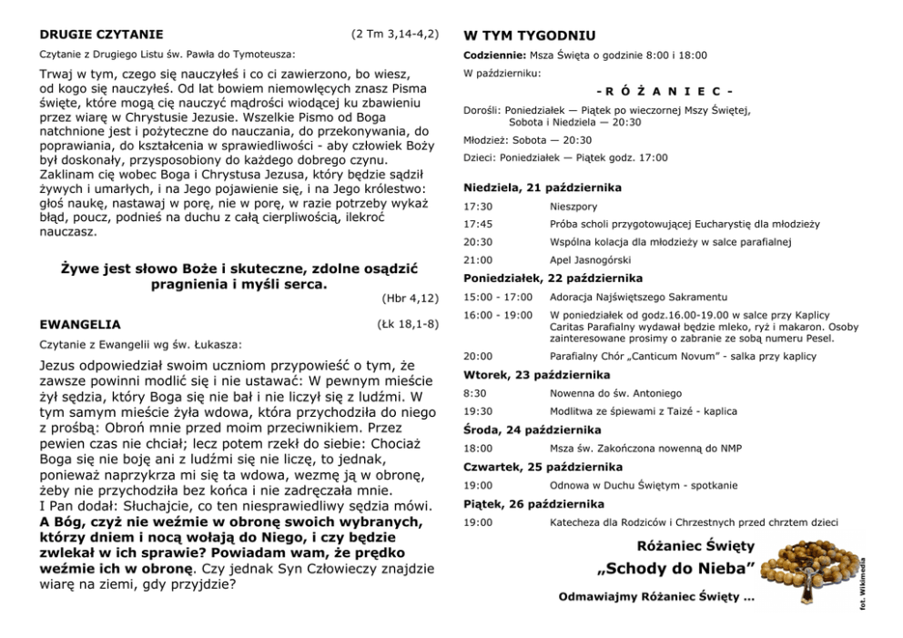 (2 Tm 3,14-4,2) W TYM TYGODNIU Czytanie z Drugiego Listu św. Pawła do Tymoteusza: Codziennie: Msza Święta o godzinie 8:00 i 18:00 Trwaj w tym, czego się nauczyłeś i co ci zawierzono, bo wiesz, od kogo się nauczyłeś. Od lat bowiem niemowlęcych znasz Pisma święte, które mogą cię nauczyć mądrości wiodącej ku zbawieniu przez wiarę w Chrystusie Jezusie. Wszelkie Pismo od Boga natchnione jest i poŜyteczne do nauczania, do przekonywania, do poprawiania, do kształcenia w sprawiedliwości - aby człowiek BoŜy był doskonały, przysposobiony do kaŜdego dobrego czynu. Zaklinam cię wobec Boga i Chrystusa Jezusa, który będzie sądził Ŝywych i umarłych, i na Jego pojawienie się, i na Jego królestwo: głoś naukę, nastawaj w porę, nie w porę, w razie potrzeby wykaŜ błąd, poucz, podnieś na duchu z całą cierpliwością, ilekroć nauczasz. W październiku: śywe jest słowo BoŜe i skuteczne, zdolne osądzić pragnienia i myśli serca. (Hbr 4,12) EWANGELIA (Łk 18,1-8) -R Ó ś A N I E C Dorośli: Poniedziałek — Piątek po wieczornej Mszy Świętej, Sobota i Niedziela — 20:30 MłodzieŜ: Sobota — 20:30 Dzieci: Poniedziałek — Piątek godz. 17:00 Niedziela, 21 października 17:30 Nieszpory 17:45 Próba scholi przygotowującej Eucharystię dla młodzieŜy 20:30 Wspólna kolacja dla młodzieŜy w salce parafialnej 21:00 Apel Jasnogórski Poniedziałek, 22 października 15:00 - 17:00 Adoracja Najświętszego Sakramentu 16:00 - 19:00 W poniedziałek od godz.16.00-19.00 w salce przy Kaplicy Caritas Parafialny wydawał będzie mleko, ryŜ i makaron. Osoby zainteresowane prosimy o zabranie ze sobą numeru Pesel. 20:00 Parafialny Chór „Canticum Novum” - salka przy kaplicy Czytanie z Ewangelii wg św. Łukasza: Jezus odpowiedział swoim uczniom przypowieść o tym, Ŝe zawsze powinni modlić się i nie ustawać: W pewnym mieście Ŝył sędzia, który Boga się nie bał i nie liczył się z ludźmi. W tym samym mieście Ŝyła wdowa, która przychodziła do niego z prośbą: Obroń mnie przed moim przeciwnikiem. Przez pewien czas nie chciał; lecz potem rzekł do siebie: ChociaŜ Boga się nie boję ani z ludźmi się nie liczę, to jednak, poniewaŜ naprzykrza mi się ta wdowa, wezmę ją w obronę, Ŝeby nie przychodziła bez końca i nie zadręczała mnie. I Pan dodał: Słuchajcie, co ten niesprawiedliwy sędzia mówi. A Bóg, czyŜ nie weźmie w obronę swoich wybranych, którzy dniem i nocą wołają do Niego, i czy będzie zwlekał w ich sprawie? Powiadam wam, Ŝe prędko weźmie ich w obronę. Czy jednak Syn Człowieczy znajdzie wiarę na ziemi, gdy przyjdzie? Wtorek, 23 października 8:30 Nowenna do św. Antoniego 19:30 Modlitwa ze śpiewami z Taizé - kaplica Środa, 24 października 18:00 Msza św. Zakończona nowenną do NMP Czwartek, 25 października 19:00 Odnowa w Duchu Świętym - spotkanie Piątek, 26 października 19:00 Katecheza dla Rodziców i Chrzestnych przed chrztem dzieci RóŜaniec Święty „Schody do Nieba” Odmawiajmy RóŜaniec Święty ... fot. Wikimedia DRUGIE CZYTANIE Sobota, 27 października 10:00 Eucharystyczny Ruch Młodych - spotkanie 17:00 - 18:00 W listopadzie będziemy przeŜywać Misje Parafialne. Chcemy przygotować się do nich przez modlitwę, adorację Najświętszego Sakramentu. XXIX Niedziela Zwykła 21 października 2007 Niedziela, 28 października Po Mszy Św. młodzieŜ zbierać będzie ofiary do puszek na Papieską Fundację Stypendialną. Czytanie z Księgi Wyjścia: 17:30 Nieszpory 17:45 Próba scholi przygotowującej Eucharystię dla młodzieŜy o 19:30 (w salce koło kaplicy) 21:00 Apel Jasnogórski Wszystkich Świętych 2007 „AKCJA ZNICZ” - serdecznie zapraszamy do zakupu zniczy po kaŜdej niedzielnej Mszy aŜ do uroczystości Wszystkich Świętych Zapraszamy ! www.ministranci.bloog.pl (Wj 17,8-13) PIERWCZE CZYTANIE Amalekici przybyli, aby walczyć z Izraelitami w Refidim. MojŜesz powiedział wtedy do Jozuego: Wybierz sobie męŜów i wyruszysz z nimi na walkę z Amalekitami. Ja jutro stanę na szczycie góry z laską Boga w ręku. Jozue spełnił polecenie MojŜesza i wyruszył do walki z Amalekitami. MojŜesz, Aaron i Chur wyszli na szczyt góry. Jak długo MojŜesz trzymał ręce podniesione do góry, Izrael miał przewagę. Gdy zaś ręce opuszczał, miał przewagę Amalekita. Gdy ręce MojŜesza zdrętwiały, wzięli kamień i połoŜyli pod niego, i usiadł na nim. Aaron zaś i Chur podparli jego ręce, jeden z tej, a drugi z tamtej strony. W ten sposób aŜ do zachodu słońca były ręce jego stale wzniesione wysoko. I tak zdołał Jozue pokonać Amalekitów i ich lud ostrzem miecza. ma juŜ 1 rok :) (Ps 121,1-8) PSALM Od listopada 2006 roku ministranci naszej parafii mają własną stronę internetową. Znajdziecie na niej wiele ciekawych artykułów poświęconych słuŜbie Panu Bogu, terminy zbiórek, plany słuŜeń, zdjęcie kaŜdego ministranta z naszej parafii, słownik liturgiczny, Magnificat, przewodnik po mszy św. oraz wiele, wiele więcej. Naszą stronę urozmaica galeria fotografii, w której moŜna obejrzeć ponad 2000 zdjęć. Specjalnie na 20-lecie parafii stworzyliśmy nowy album zdjęć, w którym moŜna znaleźć fotografie z Ŝycia parafii (1987-2007 r.). Zapraszamy wszystkich do zobaczenia naszej strony: www.ministranci.bloog.pl. Msze święte niedzielne: 8:00, 9:30, 11:00 (dzieci), 12:15 (suma), 18:00, 19:30 (młodzieŜ) Biuro parafialne: Pn., Śr., Pt. (poza I piątkiem m-ca): 16:30 – 17:30. Wt., Czw.: 9:00 – 9:30 Strona internetowa parafii: www.mo.archpoznan.org.pl Strona ministrantów: www.ministranci.bloog.pl Wszelkie uwagi dotyczące biuletynu prosimy kierować do ks. Proboszcza REFREN: Naszą pomocą jest nasz Pan i Stwórca Wznoszę swe oczy ku górom: skąd nadejść ma dla mnie pomoc? Pomoc moja od Pana, który stworzył niebo i ziemię. Pan ciebie strzeŜe, jest cieniem nad tobą, stoi po twojej prawicy. Nie porazi cię słońce we dnie ani księŜyc wśró