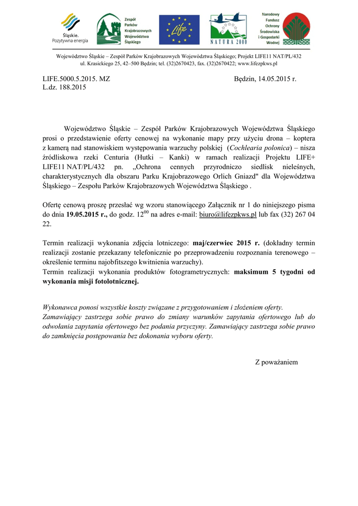Województwo Śląskie – Zespół Parków Krajobrazowych Województwa Śląskiego; Projekt LIFE11 NAT/PL/432 ul. Krasickiego 25, 42–500 Będzin; tel. (32)2670423, fax. (32)2670422; www.lifezpkws.pl LIFE.5000.5.2015. MZ L.dz. 188.2015 Będzin, 14.05.2015 r. Województwo Śląskie – Zespół Parków Krajobrazowych Województwa Śląskiego prosi o przedstawienie oferty cenowej na wykonanie mapy przy użyciu drona – koptera z kamerą nad stanowiskiem występowania warzuchy polskiej (Cochlearia polonica) – nisza źródliskowa rzeki Centuria (Hutki – Kanki) w ramach realizacji Projektu LIFE+ LIFE11 NAT/PL/432 pn. „Ochrona cennych przyrodniczo siedlisk nieleśnych, charakterystycznych dla obszaru Parku Krajobrazowego Orlich Gniazd" dla Województwa Śląskiego – Zespołu Parków Krajobrazowych Województwa Śląskiego . Ofertę cenową proszę przesłać wg wzoru stanowiącego Załącznik nr 1 do niniejszego pisma do dnia 19.05.2015 r., do godz. 1200 na adres e-mail: [email protected] lub fax (32) 267 04 22. Termin realizacji wykonania zdjęcia lotniczego: maj/czerwiec 2015 r. (dokładny termin realizacji zostanie przekazany telefonicznie po przeprowadzeniu rozpoznania terenowego – określenie terminu najobfitszego kwitnienia warzuchy). Termin realizacji wykonania produktów fotogrametrycznych: maksimum 5 tygodni od wykonania misji fotolotnicznej. Wykonawca ponosi wszystkie koszty związane z przygotowaniem i złożeniem oferty. Zamawiający zastrzega sobie prawo do zmiany warunków zapytania ofertowego lub do odwołania zapytania ofertowego bez podania przyczyny. Zamawiający zastrzega sobie prawo do zamknięcia postępowania bez dokonania wyboru oferty. Z poważaniem Województwo Śląskie – Zespół Parków Krajobrazowych Województwa Śląskiego; Projekt LIFE11 NAT/PL/432 ul. Krasickiego 25, 42–500 Będzin; tel. (32)2670423, fax. (32)2670422; www.lifezpkws.pl Załącznik nr 1 OFERTA CENOWA Wykonanie mapy przy użyciu drona – koptera z kamerą nad stanowiskiem występowania warzuchy polskiej (Cochlearia polonica) – nisza źródliskowa rzeki Centuria (Hutki – Kanki), gm. Łazy. Wykonanie ortofotomapy w barwach widzialnych o pikselu 1,5 cm wraz uwzględnieniem i określeniem wskaźników i parametrów metodyki monitoringu PMŚ GIOŚ (tabela nr 1). Dodatkowo wykonanie numerycznego modelu terenu oraz numerycznego pokrycia terenu. W ramach usługi należy wykonać 6 sztuk kompozycji mapowych oznaczonych legendą, wydrukowanych dwukrotnie w formacie A1 oraz dwie wersji elektroniczne zawierające dane: ortofotomapy w wersji plików TIF oraz wektorowe pliki SHP, które zostały wygenerowane na potrzeby analiz. W cenie wykonania usługi należy dokonać oznakowania map zawierających nazwę, numer i logotypy Projektu (załącznik nr 2). Kompozycje mapowe należy wzbogacić o wykonane fotografie naziemne rośliny oraz siedliska jej występowania, a także w miarę możliwości wzbogacić podstawowymi informacjami dot. warzuchy polskiej. Nie przewiduje się rozpatrywania ofert częściowych. Mapy z obszarem wykonania zdjęcia lotniczego do wglądu w Biurze Life+ Jura w Będzinie, po wcześniejszym kontakcie z Pracownikiem Zamawiającego. Tabela nr 1 L.p 1. 2. 3. 4. 5. 6. 7. 8. WSKAŹNIKI/PARAMETRY metodyki monitoringu PMŚ GIOŚ liczebność (liczba osobników, typ rozmieszczenia- skupiskowy, rozproszony) powierzchnia potencjalnego siedliska powierzchnia zajętego siedliska fragmentacja siedliska stopień zarośnięcia siedliska przez roślinność drzewiastą i krzewiastą ocienienie poprzez otaczające drzewa i zbocza kwitnienie zasięg występowania Nazwa oferenta: Adres oferenta: Cena netto Koszty usługi Słownie Forma płatności Termin płatności od daty wystawienia FV ……………………….….... ………………………......... ……………………….…… ………………………..…... Przelew VAT w % Cena brutto …………………..………... ……………………..……... ………………….………… …………………..………... 30 dni. ……………………………………………………… (data i podpis) Województwo Śląskie – Zespół Parków Krajobrazowych Województwa Śląskiego; Projekt LIFE11 NAT/PL/432 ul. Krasickiego 25, 42–500 Będzin; tel. (32)2670423, fax. (32)2670422; www.lifezpkws.pl Załącznik nr 2 ELEMENTY SKŁADOWE KONIECZNE DO UMIESZCZENIA NA WYKONANYCH MAPACH ORAZ OPAKOWANIU WERSJI ELEKTORNICZNEJ. Tekst: Projekt LIFE+ LIFE11 NAT/PL/432 „Ochrona cennych przyrodniczo siedlisk nieleśnych, charakterystycznych dla obszaru Parku Krajobrazowego Orlich Gniazd” Logotypy: ……………………………………………………… (data i podpis)