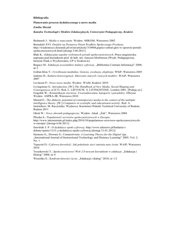 Bibliografia Planowanie procesu dydaktycznego a nowe media Emilia Musiał Katedra Technologii i Mediów Edukacyjnych, Uniwersytet Pedagogiczny, Kraków Bednarek J.: Media w nauczaniu. Wydaw. MIKOM, Warszawa 2002 Benedykt XVI. Orędzie na Światowy Dzień Środków Społecznego Przekazu. http://wiadomosci.dziennik.pl/swiat/artykuly/318968,papiez-zabral-glos-w-sprawie-portalispolecznosciowych.html [dostęp 5.06.2011] Blak K.: Edukacyjne aspekty wybranych portali społecznościowych. Praca magisterska napisana pod kierunkiem prof. dr hab. inż. Janusza Morbitzera (Wydz. Pedagogiczny, Instytut Nauk o Wychowaniu, UP w Krakowie) Bogacz M.: Edukacja uczestników kultury cyfrowej. „Biblioteka Centrum Informacji” 2008, nr 2 Goban-Klas T.: Cywilizacja medialna. Geneza, ewolucja, eksplozja. WSiP, Warszawa 2005 Jenkins H.: Kultura konwergencji. Zderzenie starych i nowych mediów. WAiP, Warszawa 2007 Levinson P.: Nowe nowe media. Wydaw. WAM, Kraków 2010 Livingstone S.: Introduction. [W:] The Handbook of New Media. Social Shaping and Consequences of ICTs. Red. L. LIEVOUW, S. LIVINGSTONE. London 2001. [Podaję za:] Gogołek W.: Komunikacja sieciowa. Uwarunkowania, kategorie i paradoksy. Oficyna Wydaw. ASPRA-JR, Warszawa 2010 Musiał E.: The didactic potential of contemporary media in the context of the multiple intelligence theory. [W:] Computers in scientific and educational activity. Red. A. Jastriebow, M. Raczyńska. Wydawca: Kazimierz Pułaski Technical University of Radom, Radom 2011 Okoń W.: Nowy słownik pedagogiczny. Wydaw. Akad. „Żak”, Warszawa 2004 Pliszka S.: Popularność serwisów społecznościowych w Europie. http://www.internetstats.pl/index.php/2010/10/popularnosc-serwisow-spolecznosciowychw-europie/ [dostęp 6.06.2011] Sawiński J. P.: O dydaktyce epoki cyfrowej. http://www.edunews.pl/badania-idebaty/opinie/1151-o-dydaktyce-epoki-cyfrowej [dostęp 31.01.2012] Siemens G., Downes S.: Connectivism: A Learning Theory for the Digital Age. „International Journal of Instructional Technology and Distance Learning” 2005, Vol. 2, No. 1 Tapscott D.: Cyfrowa dorosłość. Jak pokolenie sieci zmienia nasz świat. WAiP, Warszawa 2010 Trzaskowski T.: Społecznościowo! Web 2.0 nowym kierunkiem w edukacji. „Edukacja i Dialog” 2008, nr 4 Wasiołka S.: Syndrom łatwości życia. „Edukacja i dialog” 2010, nr 1/2