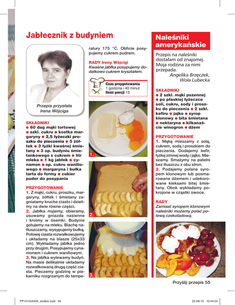 Jabłecznik z budyniem ratury 175 °C. Obficie posypujemy cukrem pudrem. RADY Ireny Wójcigi Kwaśne jabłka posypujemy dodatkowo cukrem kryształem. Czas przygotowania 1 godzina i 40 minut Ilość porcji 15 Przepis przysłała Irena Wójciga SKŁADNIKI ● 60 dag mąki tortowej ● szkl. cukru ● kostka margaryny ● 2,5 łyżeczki proszku do pieczenia ● 5 żółtek ● 3 łyżki kwaśnej śmietany ● 3 op. budyniu śmietankowego z cukrem ● litr mleka ● 1 kg jabłek ● cynamon ● op. cukru waniliowego ● margaryna i bułka tarta do formy ● cukier puder do posypania PRZYGOTOWANIE 1. Z mąki, cukru, proszku, margaryny, żółtek i śmietany zagniatamy kruche ciasto i dzielimy na dwie równe części. 2. Jabłka myjemy, obieramy, usuwamy gniazda nasienne i kroimy w ósemki. Budynie gotujemy na mleku. Blachę natłuszczamy, wysypujemy bułką. Połowę ciasta rozwałkowujemy i układamy na blasze (25x33 cm). Wykładamy jabłka jedno przy drugim. Posypujemy cynamonem i cukrem waniliowym. 3. Na jabłka wylewamy budyń. Na masie delikatnie układamy rozwałkowaną drugą część ciasta. Pieczemy godzinę w piekarniku rozgrzanym do tempe- 1. 2. Naleśniki amerykańskie Przepis na naleśniki dostałam od znajomej. Moja rodzina za nimi przepada. Angelika Brzęczek, Wola Lubecka SKŁADNIKI ● 2 szkl. mąki pszennej ● po płaskiej łyżeczce soli, cukru, sody i proszku do pieczenia ● 2 szkl. kefiru ● jajko ● syrop klonowy ● bita śmietana ● nektaryna ● kilkanaście winogron ● dżem PRZYGOTOWANIE 1. Mąkę mieszamy z solą, cukrem, sodą i proszkiem do pieczenia. Dodajemy kefir, łyżkę zimnej wody i jajko. Mieszamy. Smażymy na patelni bez tłuszczu z obu stron. 2. Podajemy polane syropem klonowym lub posmarowane dżemem i udekorowane kleksami bitej śmietany. Obok wykładamy pokrojone w cząstki owoce. RADY Zamiast syropem klonowym naleśniki możemy polać polewą czekoladową. 3. Przyślij przepis 55 PP1010s5459_slodkie.indd 55 25-08-10 10:44:54