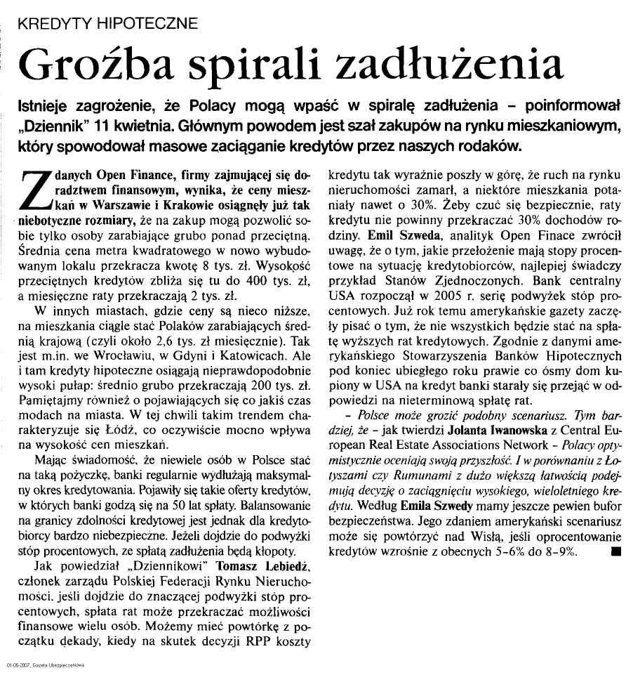 KREDYTY HIPOTECZNE Groźba spirali zadłużenia Istnieje zagrożenie, że Polacy mogą wpaść w spiralę zadłużenia - poinformował „Dziennik" 11 kwietnia. Głównym powodem jest szał zakupów na rynku mieszkaniowym, który spowodował masowe zaciąganie kredytów przez naszych rodaków. danych Open Finance, firmy zajmującej się doradztwem finansowym, wynika, że ceny mieszkań w Warszawie i Krakowie osiągnęły już tak niebotyczne rozmiary, że na zakup mogą pozwolić sobie tylko osoby zarabiające grubo ponad przeciętną. Średnia cena metra kwadratowego w nowo wybudowanym lokalu przekracza kwotę 8 tyś. zł. Wysokość przeciętnych kredytów zbliża się tu do 400 tyś. zł, a miesięczne raty przekraczają 2 tyś. zł. W innych miastach, gdzie ceny są nieco niższe, na mieszkania ciągle stać Polaków zarabiających średnią krajową (czyli około 2,6 tyś. zł miesięcznie). Tak jest m.in. we Wrocławiu, w Gdyni i Katowicach. Ale i tam kredyty hipoteczne osiągają nieprawdopodobnie wysoki pułap: średnio grubo przekraczają 200 tyś. zł. Pamiętajmy również o pojawiających się co jakiś czas modach na miasta. W tej chwili takim trendem charakteryzuje się Łódź, co oczywiście mocno wpływa na wysokość cen mieszkań. Mając świadomość, że niewiele osób w Polsce stać na taką pożyczkę, banki regularnie wydłużają maksymalny okres kredytowania. Pojawiły się takie oferty kredytów, w których banki godzą się na 50 lat spłaty. Balansowanie na granicy zdolności kredytowej jest jednak dla kredytobiorcy bardzo niebezpieczne. Jeżeli dojdzie do podwyżki stóp procentowych, ze spłatą zadłużenia będą kłopoty. Jak powiedział „Dziennikowi" Tomasz Lebiedż, członek zarządu Polskiej Federacji Rynku Nieruchomości, jeśli dojdzie do znaczącej podwyżki stóp procentowych, spłata rat może przekraczać możliwości finansowe wielu osób. Możemy mieć powtórkę z początku dekady, kiedy na skutek decyzji RPP koszty Z kredytu tak wyraźnie poszły w górę, że ruch na rynku nieruchomości zamarł, a niektóre mieszkania potaniały nawet o 30%. Żeby czuć się bezpiecznie, raty kredytu nie powinny przekraczać 30% dochodów rodziny. Emil Szweda, analityk Open Finace zwrócił uwagę, że o tym, jakie przełożenie mają stopy procentowe na sytuację kredytobiorców, najlepiej świadczy przykład Stanów Zjednoczonych. Bank centralny USA rozpoczął w 2005 r. serię podwyżek stóp procentowych. Już rok temu amerykańskie gazety zaczęły pisać o tym, że nie wszystkich będzie stać na spłatę wyższych rat kredytowych. Zgodnie z danymi amerykańskiego Stowarzyszenia Banków Hipotecznych pod koniec ubiegłego roku prawie co ósmy dom kupiony w USA na kredyt banki starały się przejąć w odpowiedzi na nieterminową spłatę rat. - Polsce może grozić podobny scenariusz. Tym bardziej, że - jak twierdzi Jolanta Iwanowska z Central European Real Estate Associations Network - Polacy optymistycznie oceniają swoją przyszłość. I w porównaniu z Łotyszami czy Rumunami z dużo większą łatwością podejmują decyzję o zaciągnięciu wysokiego, wieloletniego kredytu. Według Emila Szwedy mamy jeszcze pewien bufor bezpieczeństwa. Jego zdaniem amerykański scenariusz może się powtórzyć nad Wisłą, jeśli oprocentowanie kredytów wzrośnie z obecnych 5-6% do 8-9%. •