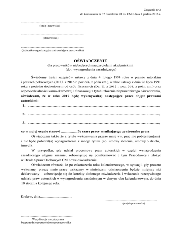 Załącznik nr 2 do komunikatu nr 37 Prorektora UJ ds. CM z dnia 1 grudnia 2016 r. …......................................................................... (imię i nazwisko) …......................................................................... (stanowisko) …......................................................................... (jednostka organizacyjna zatrudniająca pracownika) OŚWIADCZENIE dla pracowników niebędących nauczycielami akademickimi (dot. wynagrodzenia zasadniczego) Świadomy treści przepisów ustawy z dnia 4 lutego 1994 roku o prawie autorskim i prawach pokrewnych (Dz.U. z 2016 r. poz.666, z późn.zm.), a także ustawy z dnia 26 lipca 1991 roku o podatku dochodowym od osób fizycznych (Dz. U. z 2012 r. poz. 361, z późn. zm.) oraz odpowiedzialności karno-skarbowej i finansowej z tytułu złożenia nieprawdziwego oświadczenia, oświadczam, że w roku 2017 będę wykonywał(a) następujące prace objęte prawami autorskimi: 1. …………………………………………………………………………………………………, 2. …………………………………………………………………………………………………, 3. …………………………………………………………………………………………………, co w mojej ocenie stanowi ..................% czasu pracy wynikającego ze stosunku pracy. Oświadczam także, że z tytułu wykonywania przeze mnie ww. prac nie pobierałem(am) i nie będę pobierał(a) wynagrodzenia z innego tytułu (np. umowy zlecenia, umowy o dzieło, innych). W przypadku, gdy udział procentowy praw autorskich w części wynagrodzenia zasadniczego ulegnie zmianie, zobowiązuję się poinformować o tym Pracodawcę i złożyć w Dziale Spraw Osobowych CM nowe oświadczenie. Oświadczam również, że po zakończeniu roku kalendarzowego, w sytuacji, gdy procent wykonanej przeze mnie pracy wskazany w niniejszym oświadczeniu będzie mniejszy niż deklarowany – zobowiązuję się do korekty złożonego oświadczenia i wskazania rzeczywistego udziału praw autorskich w wynagrodzeniu zasadniczym w danym roku kalendarzowym, do dnia 10 stycznia kolejnego roku. Kraków, dnia.................................... ........................................................... (podpis pracownika) ........................................................... Weryfikacja merytoryczna bezpośredniego przełożonego pracownika