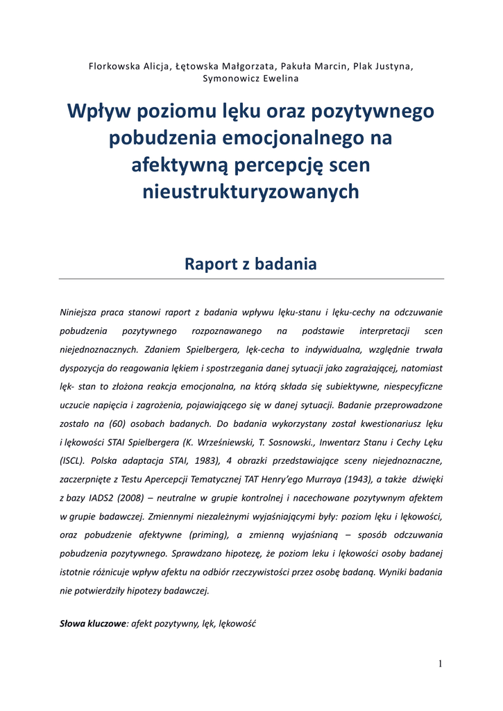 Florkowska Alicja, Łętowska Małgorzata, Pakuła Marcin, Plak Justyna, Symonowicz Ewelina Wpływ poziomu lęku oraz pozytywnego pobudzenia emocjonalnego na afektywną percepcję scen nieustrukturyzowanych Raport z badania Niniejsza praca stanowi raport z badania wpływu lęku-stanu i lęku-cechy na odczuwanie pobudzenia pozytywnego rozpoznawanego na podstawie interpretacji scen niejednoznacznych. Zdaniem Spielbergera, lęk-cecha to indywidualna, względnie trwała dyspozycja do reagowania lękiem i spostrzegania danej sytuacji jako zagrażającej, natomiast lęk- stan to złożona reakcja emocjonalna, na którą składa się subiektywne, niespecyficzne uczucie napięcia i zagrożenia, pojawiającego się w danej sytuacji. Badanie przeprowadzone zostało na (60) osobach badanych. Do badania wykorzystany został kwestionariusz lęku i lękowości STAI Spielbergera (K. Wrześniewski, T. Sosnowski., Inwentarz Stanu i Cechy Lęku (ISCL). Polska adaptacja STAI, 1983), 4 obrazki przedstawiające sceny niejednoznaczne, zaczerpnięte z Testu Apercepcji Tematycznej TAT Henry’ego Murraya (1943), a także dźwięki z bazy IADS2 (2008) – neutralne w grupie kontrolnej i nacechowane pozytywnym afektem w grupie badawczej. Zmiennymi niezależnymi wyjaśniającymi były: poziom lęku i lękowości, oraz pobudzenie afektywne (priming), a zmienną wyjaśnianą – sposób odczuwania pobudzenia pozytywnego. Sprawdzano hipotezę, że poziom leku i lękowości osoby badanej istotnie różnicuje wpływ afektu na odbiór rzeczywistości przez osobę badaną. Wyniki badania nie potwierdziły hipotezy badawczej. Słowa kluczowe: afekt pozytywny, lęk, lękowość 1 WSTĘP Nasze badania dotyczą zagadnienia lęku i afektu i ich wzajemnej relacji. Rozważania nad zagadnieniem lęku pojawiają się w wielu koncepcjach i ujmowane są przez wielu autorów, dlatego niełatwo jest przyjąć uzgodnioną definicję tego pojęcia. Pomimo tego, iż koncepcje lęku różnią się między sobą, są one zgodne co do tego, że lęk i strach to zupełnie co innego. Lęk, w odróżnieniu od strachu, charakteryzuje poczucie bezradności wobec niebezpieczeństwa, w wyniku czego uruchamiane są mechanizmy obronne. Lęk jest tak bolesnym stanem, że człowiek nie może tolerować go przez dłuższy czas. Lęk jest reakcją na poczucie zagrożenia, kiedy nieznane jest jego źródło, w odróżnieniu od strachu, kiedy to przyczyna zagrożenia jest znana. W przypadku strachu niebezpieczeństwo jest widoczne, obiektywne, dostrzegane przez wiele osób i zrozumiałe dla nich. W przypadku lęku jest ono ukryte i subiektywne, co nie oznacza, że nieadekwatne w stosunku do subiektywnie spostrzeganego zagrożenia. Duże znaczenie dla pojęcia lęku ma teoria Spielbergera, który dokonał rozróżnienia lęku na lęk-cechę i lęk-stan. Lęk-cecha został określony jako indywidualna, bardziej trwała dyspozycja do reagowania lękiem i spostrzegania danej sytuacji jako zagrażającej. Lęk-stan to złożona reakcja emocjonalna, na którą składa się subiektywne, niespecyficzne uczucie napięcia i zagrożenia, pojawiającego się w danej sytuacji, mogące trwać dłużej lub krócej. W naszym badaniu, ze względu na wykorzystanie teorii Spielbergera, posłużymy się kwestionariuszem tego autora, służącego rozróżnieniu tych dwóch rodzajów lęku. W opisie afektu, jako drugiej zmiennej badanej w tejże pracy, posłużymy się teorią Murphy i Zajonca. Zajonc podaje następującą definicję afektu: to „procesy symboliczne, wymagające pewnych form przekształceń przeszłych lub bieżących bodźców sensorycznych” (Zajonc, 1984). Ogólnie przyjmuje się, że globalne rozróżnienia afektywne mogą być dokonywane nieświadomie, podczas gdy rozróżnienia poznawcze wymagają większego dostępu do informacji dotyczących bodźca. Faktycznie, hipoteza o pierwszeństwie afektu opiera się na założeniu, że proste cechy afektywne bodźca, takie jak: dobry - zły, pozytywny negatywny, mogą być przetwarzane z większą łatwością niż jego cechy nieafektywne. Jednocześnie paradygmat ekspozycji dostarcza jedynie pośrednich dowodów przemawiających za taką tezą. Potrzebny więc był dowód bardziej bezpośredni, i takiego bezpośredniego dowodu dostarczyli Murphy i Zajonc (1993). Wykazali oni, że globalne 2 reakcje afektywne są bardziej bezpośrednie i w mniejszym stopniu podlegające kontroli wolicjonalnej. Prezentowane poza świadomością, mogą ubarwiać nasze wrażenia i osądy emocjonalnie. W eksperymencie wzięły udział 32 osoby: 16 mężczyzn oraz 16 kobiet. Ich zadaniem była ocena wyświetlanych ideogramów w skali od 1 do 5. Jako afektywne bodźce poprzedzające wybrano twarze męskie i kobiece wyrażające radość lub złość (zgromadzono fotografie pięciu twarzy męskich oraz pięciu twarzy kobiecych celem użycia ich w eksperymencie. Każda z tych dziesięciu twarzy została sfotografowana dwukrotnie – raz uśmiechnięta i raz nachmurzona, co w sumie dało 20 fotografii). Twarze te były eksponowane przed pojawieniem się każdego z 45 ideogramów, każdorazowo przez zaledwie 4ms (dzięki czemu nie były świadomie rejestrowane przez osoby badane). Wyniki badań pokazały, że choć żadna z osób badanych nie była świadoma występowania bodźców afektywnych, to znacząco wpłynęły one na ocenę ideogramów: gdy poprzedzano bodziec właściwy pozytywnymi suboptymalnymi bodźcami poprzedzającymi (radosne twarze), oceny ideogramów były istotnie wyższe niż w przypadku, gdy poprzedzano je suboptymalnymi bodźcami negatywnymi (rozgniewane twarze tych samych osób). Badanie wywołało burzliwą dyskusję, ponieważ zaczęto zastanawiać się, dlaczego identyczna afektywna informacja jest skuteczniejsza, gdy przedstawia się ją na poziomie niedostępnym świadomości. Ważnego odkrycia dokonali Seamon, Marsh i Brody (1984). Odkryli oni, że efekt czasowej przewagi rozróżniania emocjonalnego wzgl