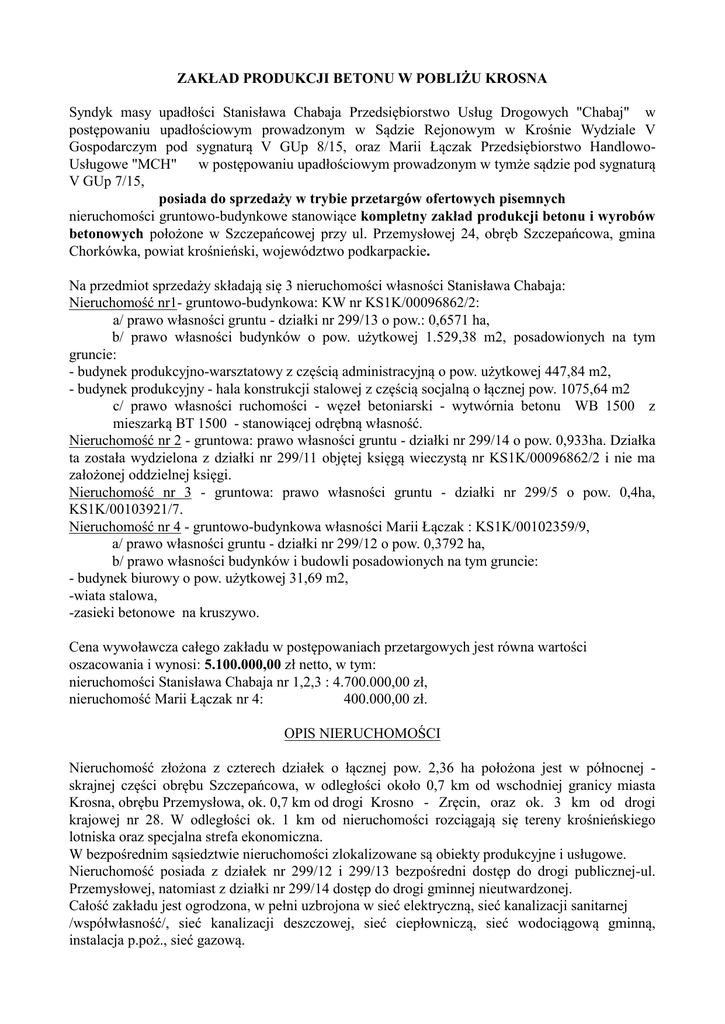 ZAKŁAD PRODUKCJI BETONU W POBLIŻU KROSNA Syndyk masy upadłości Stanisława Chabaja Przedsiębiorstwo Usług Drogowych "Chabaj" w postępowaniu upadłościowym prowadzonym w Sądzie Rejonowym w Krośnie Wydziale V Gospodarczym pod sygnaturą V GUp 8/15, oraz Marii Łączak Przedsiębiorstwo HandlowoUsługowe "MCH" w postępowaniu upadłościowym prowadzonym w tymże sądzie pod sygnaturą V GUp 7/15, posiada do sprzedaży w trybie przetargów ofertowych pisemnych nieruchomości gruntowo-budynkowe stanowiące kompletny zakład produkcji betonu i wyrobów betonowych położone w Szczepańcowej przy ul. Przemysłowej 24, obręb Szczepańcowa, gmina Chorkówka, powiat krośnieński, województwo podkarpackie. Na przedmiot sprzedaży składają się 3 nieruchomości własności Stanisława Chabaja: Nieruchomość nr1- gruntowo-budynkowa: KW nr KS1K/00096862/2: a/ prawo własności gruntu - działki nr 299/13 o pow.: 0,6571 ha, b/ prawo własności budynków o pow. użytkowej 1.529,38 m2, posadowionych na tym gruncie: - budynek produkcyjno-warsztatowy z częścią administracyjną o pow. użytkowej 447,84 m2, - budynek produkcyjny - hala konstrukcji stalowej z częścią socjalną o łącznej pow. 1075,64 m2 c/ prawo własności ruchomości - węzeł betoniarski - wytwórnia betonu WB 1500 z mieszarką BT 1500 - stanowiącej odrębną własność. Nieruchomość nr 2 - gruntowa: prawo własności gruntu - działki nr 299/14 o pow. 0,933ha. Działka ta została wydzielona z działki nr 299/11 objętej księgą wieczystą nr KS1K/00096862/2 i nie ma założonej oddzielnej księgi. Nieruchomość nr 3 - gruntowa: prawo własności gruntu - działki nr 299/5 o pow. 0,4ha, KS1K/00103921/7. Nieruchomość nr 4 - gruntowo-budynkowa własności Marii Łączak : KS1K/00102359/9, a/ prawo własności gruntu - działki nr 299/12 o pow. 0,3792 ha, b/ prawo własności budynków i budowli posadowionych na tym gruncie: - budynek biurowy o pow. użytkowej 31,69 m2, -wiata stalowa, -zasieki betonowe na kruszywo. Cena wywoławcza całego zakładu w postępowaniach przetargowych jest równa wartości oszacowania i wynosi: 5.100.000,00 zł netto, w tym: nieruchomości Stanisława Chabaja nr 1,2,3 : 4.700.000,00 zł, nieruchomość Marii Łączak nr 4: 400.000,00 zł. OPIS NIERUCHOMOŚCI Nieruchomość złożona z czterech działek o łącznej pow. 2,36 ha położona jest w północnej skrajnej części obrębu Szczepańcowa, w odległości około 0,7 km od wschodniej granicy miasta Krosna, obrębu Przemysłowa, ok. 0,7 km od drogi Krosno - Zręcin, oraz ok. 3 km od drogi krajowej nr 28. W odległości ok. 1 km od nieruchomości rozciągają się tereny krośnieńskiego lotniska oraz specjalna strefa ekonomiczna. W bezpośrednim sąsiedztwie nieruchomości zlokalizowane są obiekty produkcyjne i usługowe. Nieruchomość posiada z działek nr 299/12 i 299/13 bezpośredni dostęp do drogi publicznej-ul. Przemysłowej, natomiast z działki nr 299/14 dostęp do drogi gminnej nieutwardzonej. Całość zakładu jest ogrodzona, w pełni uzbrojona w sieć elektryczną, sieć kanalizacji sanitarnej /współwłasność/, sieć kanalizacji deszczowej, sieć ciepłowniczą, sieć wodociągową gminną, instalacja p.poż., sieć gazową. Działka nr 299/13jest częściowo ogrodzono, częściowo utwardzona asfaltem i kostką brukową, większość terenu posiada podbudowę tłuczniową. Działka jest w pełni uzbrojona. Jak wynika z dokumentacji w obrębie nieruchomości nie obowiązuje Miejscowy Plan Zagospodarowania Przestrzennego Gminy Chorkówka ani żaden inny. Zgodnie z ustaleniami obowiązującego Studium Uwarunkowań i Kierunków Zagospodarowania Przestrzennego Gminy Chorkówka nieruchomość gruntowa stanowi tereny o symbolu CU i tekście "Tereny rozwoju aktywności gospodarczej" . Działka 299/14 przylega z jednej strony do działki drogowej nr 297 stanowiącej drogę gminną, nieutwardzoną, a od strony wschodniej sąsiaduje bezpośrednio ze specjalną strefą ekonomiczną. Teren działki ogrodzony ogrodzeniem typowym z siatki stalowej, częściowo utwardzony kostką i płytami betonowymi oraz podbudową tłuczniową. Działka niezabudowana, uzbrojona. Działka 299/5 - niezabudowana, bez bezpośredniego dojazdu, o kształcie prostokąta, położona w terenie płaskim, częściowo ogrodzona cokołem betonowym i siatką stalową, uzbrojona w sieć wodociągową, pozostałe media są dostępne z działki sąsiedniej. Działka nr 299/12 zabudowana budynkiem biurowym, kształt regularny prostokątny, położona w terenie płaskim, uzbrojona, ogrodzona, utwardzona, stan zagospodarowania działki wysoki. Na działce zlokalizowano również obiekty budowlane, które nie są trwale związane z gruntem tj. wiata stalowa oraz zasieki na kruszywo. Podstawowe informacje o zabudowie nieruchomości. Parametry ogólne budynku produkcyjno-warsztatowego z częścią administracyjną i socjalną o nr ewidencyjnym 251: - rok budowy: lata 70-te XX wieku, budynek po konserwacji i remoncie w 2003r., - powierzchnia zabudowy: około 503 m2, - powierzchnia użytkowa: 487,84 m2, w tym: - część administracyjna - 105,62 m2, - część zaplecza socjalnego - 36,12 m2, - część warsztatowa, garaż i magazynu zamkniętego - 144,47 m2, - otwarta wiata - 161,63 m2. Parametry ogólne budynku produkcyjnego z częścią socjalną o nr ewidencyjnym 778: - rok budowy: 2012, - pow. zabudowy: 1125,50 m2, - część produkcyjna - 850,80 m2, - część zaplecza socjalnego - 224,84 m2. Budynek parterowy, niepodpiwniczony, składa się z hali oraz połączonego z nią budynku zaplecza socjalnego. Hala w konstrukcji stalowej dwunawowej, posadowiona na żelbetowych stopach fundamentowych połączonych żelbetowymi belkami podwalinowymi. Część socjalna w konstrukcji tradycyjnej murowanej z bloczków z betonu komórkowego. Budynek wykonany w 2010 roku na podstawie projektu w przeznaczeniem na działalność w zakresie produkcji elementów z betonu wibro
