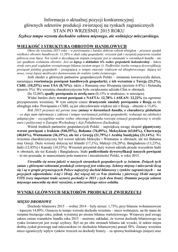 Informacja o aktualnej pozycji konkurencyjnej głównych sektorów produkcji zwierzęcej na rynkach zagranicznych STAN PO WRZEŚNIU 2015 ROKU Szybsze tempo wzrostu dochodów sektora mięsnego, ale wolniejsze mleczarskiego. WIELKOŚĆ I STRUKTURA OBROTÓW HANDLOWYCH Okres do września 2015 roku – w porównaniu z bardzo dobrym rokiem ubiegłym – przynosi spadek wielkości obrotów handlowych: 11,26% w skali całej gospodarki; wrzesień (jak i sierpień) poprawia rezultat półrocza oraz lipca. Ten wynik w decydującym stopniu związany jest ze zmianami w warunkach handlu – nie zaś spadkiem wolumenu obrotów. Jest on lepszy o dokładnie 6% wobec gospodarki holenderskiej – lidera strefy euro pod względem wewnętrznego bilansu (system target 1). Podkreślać trzeba rosnącą dywersyfikację powiązań polskiej gospodarki – postępującą w tempie znacznie większym od ubiegłorocznego; dającą też nowe, coraz lepsze możliwości dostosowania do realiów rynku światowego. Jeśli chodzi o głównych partnerów gospodarczych Polski – zmianom towarzyszyła dalsza, narastająca reorientacja powiązań handlowych gospodarki; z ich wzrostem z Turcją (23,2%), ChRL (10,25%) oraz USA (8,74%); także z Rumunią oraz Hiszpanią (poziom 6-8%) i Holandią (prawie 5%). We wrześniu charakterystyczne było zwiększenie udziału Chin w obrotach. Do 52,06% spadły powiązania ze strefą euro (0,15% w strukturze, w miesiącu). Widać bardzo duży wzrost powiązań z NAFTA: 12,78% i ASEAN: 12,22% (tu ogromne przyspieszenie września). W tym samym czasie drastycznie zmalały powiązania z Rosją na tle ubiegłego roku. Powiązania z ChRL są już zdecydowanie większe niż z Rosją – obecnie o 15,6%. Rok 2015 przynosi też pewne inne zmiany w kierunkach handlu, o charakterze globalnym – co daje nam informacje z zakresu i tempa reorientacji polskiej gospodarki; wskazuje na zdolności adaptacyjne – szczególnie ważne wobec obecnego kierunku rozwoju sytuacji gospodarczej w strefie euro i politycznej w Europie Wschodniej i Azji Południowo-Zachodniej. Wśród średnich partnerów gospodarczych Polski – największą uwagę skupiał gigantyczny wzrost powiązań z Irakiem (546,55%), Bahama (76,09%), Meksykiem (63,04%), Chorwacją (40,04%), Wietnamem (36,19%); ale też z Grecją (21,79%) i Arabią Saudyjską (21,14%). We wrześniu charakterystyczny był wzrost udziału Meksyku i Wietnamu w obrotach; ale też Bahama oraz Grecji. Duże wzrosty dotyczą też Irlandii (17,1%), Malezji (16,28%), Bangladeszu (13,23%), Indii (12,85%) i Kanady (10,53%). Wrzesień przyniósł duży wzrost udziału przede wszystkim Indii w obrotach, ale też Kanady i Bangladeszu. Stałe podkreślanie dywersyfikacji naszych powiązań – to nie przesada; to unaocznianie pola manewru i niezależności Polski, w roku 2015. Utrwaliła się nowa jakość w naszych stosunkach gospodarczych ze światem. Związek tych zmian z głównymi sektorami produkcji zwierzęcej jest widoczny. Sektory mięsny i mleczarski liczą się i są w grupie przynoszących Polsce najwyższy dochód bilansowy z rynków zagranicznych – na pozycjach odpowiednio: 4-tej i 10-tej. Już więcej niż co 9-ta złotówka z pierwszej 10-tki naszych VITS (very important trade sectors) pochodzi w 2015 z tych dwu branż. Ostatnio pozycja sektora mięsnego umocniła się dość wyraźnie, a mleczarskiego nieco osłabła. WYNIKI GŁÓWNYCH SEKTORÓW PRODUKCJI ZWIERZĘCEJ MIĘSO DROBIOWE Dochody bilansowe 2015 – wobec 2014 – były niższe: 1,73%; przy bilansie wolumenowym – lepszym 14,89%. Oznacza to tempo wzrostu dochodu września – nieco wolniejsze, na tle stanu do sierpnia bieżącego roku; jednak wyraźniej po stronie bilansu wartościowego. Wziąwszy pod uwagę zakres zmian warunków handlu roku 2015 – możemy zakładać, że wzrost dochodu bilansowego na rynku światowym jest wciąż szybszy. Był on po obu stronach bilansu tak wysoki, iż sektor mięsa drobiu zyskał przewagę nad mleczarskim (w dochodzie bilansowym) ponad 58%. Zmiany września nieco ograniczyły wpływ rynków trzecich na dochody branży – za sprawą benińskiego (mięso) oraz kilku azjatyckich odbiorców żywca. Konkurencja wyraźnie zyskała – lecz tylko unijna; praktycznie nie ma już innej. Mimo to konkurenci na polskim rynku mięsa drobiu uzyskują jedynie symboliczne dochody – na poziomie 1% naszych wpływów sektora mięsa drobiu z rynków zagranicznych. WOŁOWINA Dochód bilansowy 2015 rósł, wobec roku 2014 – pozwalając osiągnąć wynik w porównaniu z sektorem mleka: 27-28% lepszy. Po wrześniu bilans wolumenowy był o 15,06% lepszy – na tle 2014; wobec stanu po sierpniu – to też widoczna poprawa. Dochód bilansowy – na tle 2014 – rośnie o połowę wolniej (poziom 7-8%). Rola rynków trzecich w tworzeniu dochodów branży na rynkach zagranicznych pozostała na umiarkowana (10-11%), ale ich udział w tworzeniu dochodu wyraźnie wzrósł we wrześniu; za sprawą zdywersyfikowanych postępów na rynkach arabskich, ale też dzięki rynkom uzbeckiemu, izraelskiemu oraz Hongkongu. Konkurenci na polskim rynku mięsa wołowiny uzyskiwali 1,87% dochodu naszego sektora wołowiny na rynkach zagranicznych. Ich pozycja (i we wrześniu i w sierpniu) znacząco słabła. MLEKO O wysokim poziomie dodatniego bilansu wolumenowego – o 21,11% lepszego niż w 2014 – trzeba wspomnieć na początku; zdając sobie sprawę z niższego (na tle 2014) dochodu bilansowego, o 37,83%. Taka sytuacja ma związek z wpływem krajowego rynku i końcem limitowania produkcji, ale wobec dużych zmian warunków handlu – nie jest wcale jednoznaczna, przy tak dobrym wyniku wolumenowym branży. Istotnym szczegółem obrazu wyników (2015) branży mleczarskiej na rynku światowym – jest (praktycznie) eliminacja konkurencji pozaunijnej na naszym rynku mleka. Z kolei konkurencja UE w wrześniu wzmocniła się, ale niewiele (i głównie fińska) – uzyskując obecnie na naszym rynku 16