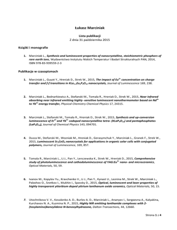 Łukasz Marciniak Lista publikacji Z dnia 31 października 2015 Książki i monografie 1. Marciniak L., Synthesis and luminescent properties of nanocrystalline, stoichiometric phosphors of rare earth ions, Wydawnictwo Instytutu Niskich Temperatur I Badań Strukturalnych PAN, 2014, ISBN 978-83-939559-2-3 Publikacje w czasopismach 1. Marciniak L., Guyot Y., Hreniak D., Strek W., 2015, The impact of Eu3+ concentration on charge transfer and f-f transitions in KLa1-xEuxP4O12 nanocrystals, Journal of Luminescence 169, 238. 2. Marciniak L., Bednarkiewicz A., Stefanski M., Tomala R., Hreniak D., Strek W., 2015, Near infrared absorbing near infrared emitting highly -sensitive luminescent nanothermometer based on Nd3+ to Yb3+ energy transfer, Physical Chemistry Chemical Physics 17, 24315. 3. Marciniak L., Stefanski M., Tomala R., Hreniak D., Strek W., 2015, Synthesis and up-conversion luminescence of Er3+ and Yb3+ codoped nanocrystalline tetra- (KLaP4O12) and pentaphosphates (LaP5O14), Journal of Chemical Physics 143, 094701. 4. Dusza M., Stefanski M., Wozniak M., Hreniak D., Gerasymchuk Y., Marciniak L., Granek F., Strek W., 2015, Luminescent Sr2CeO4 nanocrystals for applications in organic solar cells with conjugated polymers, Journal of Luminescence, 169, 857. 5. Tomala R., Marciniak L., Li J., Pan Y., Lenczewska K., Strek W., Hreniak D., 2015, Comprehensive study of photoluminescence and cathodoluminescence of YAG:Eu3+ nano- and microceramics, Optical Materials, 50, 59. 6. Ivanov M., Kopylov Yu., Kravchenko V., Li J., Pan Y., Kynast U., Leznina M., Strek W., Marciniak L., Palashov O., Snetkov I., Mukhin I., Spassky D., 2015, Optical, luminescent and laser properties of highly transparent ytterbium doped yttrium lanthanum oxide ceramics, Optical Materials, 50, 15. 7. Utochnikova V. V., Kovalenko A. D., Burlov A. D., Marciniak L., Ananyev I., Sergeevna A., Kalyakina, Kurchavov N. A., Kuzmina N. P., 2015, Highly NIR emitting lanthanide complexes with 2(tosylamino)benzylidene-N-benzoylhydrazone, Dalton Transactions, 44, 12660. Strona 1 z 4 8. Stefanski M., Marciniak L., Hreniak D., Strek W., 2015, Influence of grain size on optical properties of Sr2CeO4 nanocrystals, Journal of Chemical Physics, 142 184701. 9. Pazik R., Maczka M., Malecka M., Marciniak L., Ekner-Grzyb A., Mrówczyńska L., Wiglusz R. J., 2015, Functional up-converting SrTiO3:Er3+/Yb3+ nanoparticles, structural features, particle size colour tuning and in vitro RBC cytotoxicity, Dalton Transactions 44, 10267. 10. Marciniak L., Hreniak D., Strek W., Piccinelli F., Speghini A., Bettinelli M., Miritello M., Savio R. Lo, Cardile P., Priolo F., 2015, Spectroscopic and structural Properties of polycrystalline Y2Si2O7 doped with Er3+, Journal of Luminescence, 170, 614. 11. Marciniak L., Strek W., Guyot Y., Hreniak D., Boulon G., 2015, Synthesis and Nd3+ Luminescence Properties of ALa1-xNdxP4O12 (A=Li, Na, K, Rb) Tetraphosphate Nanocrystals, Journal of Physical Chemistry C 119, 5160-5167. 12. Strek W., Cichy B., Radosinski L., Gluchowski P., Marciniak L., Lukaszewicz M., Hreniak D., 2015, Laser induced white-light emission from graphene ceramics – opening bandgap in graphene, Light: Science and Applications, 4, e237. 13. Marciniak L., Strek W., Hreniak D., Guyot Y., 2014, Temperature of anti-Stokes white emission in LiYbP4O12:Er nanocrystals, Applied Physics Letters 105, 173113. 14. Marciniak L., Stefanski M., Tomala R., Hreniak D., Strek W., 2015, Size effect in luminescent properties of LiNdP4O12 nanocrystals, Optical Materials 41, 17. 15. Wiglusz R., Marciniak L., Pazik R., Strek W., 2014, Structural and spectroscopic characterization of Nd3+-doped YVO4 yttrium orthovanadate nanocrystalline, Crystal Growth and Design 14, 5512. 16. Cichos J., Marciniak L., Hreniak D., Stręk W., Karbowiak M., 2014, The effect of surface ligand, solvent and Yb3+ co-doping on luminescence properties of Er3+ in colloidal NaGdF4 nanocrystals, Journal of Material Chemistry C 2, 8244. 17. Marciniak L., Strek W., Guyot Y., Hreniak D., 2014, Synthesis and luminescent properties of La1−x NdxP5O14 nanocrystals, Physical Chemistry Chemical Physics 16, 18004. Strona 2 z 4 18. Giang L. T. K., Marciniak L., Anh T. K., Binh N. T., Lojkowski W., Minh L. Q., 2015, Fabrication, characterization and upconversion emission properties of nanoparticles NaYF4 doped with rare earth ions Er3+ and Tm3+, International Journal of Nanotechnology, 12, 538. 19. Saladino M. L., Chillura Martino D. F., Floriano M. A., Hreniak D., Marciniak Ł., Strek W., Caponetti E., 2014, Ce: Y3Al5O12-polymethylmethacrylate Composite for White Light Emitting Diode, Journal of Physical Chemistry C, 118, 9107. 20. Marciniak L., Hreniak D., Strek W., 2014, Controlling luminescence colour through concentration of Dy3+ ions in LiLa1-xDyxP4O12 nanocrystals, Journal of Material Chemistry C 2 5704. 21. Shuvaev S., Utochnikova V., Marciniak L., Freidzon A., Sinev I., Van Deun R., Freire R. O., Zubavichus Y., Grunert W., Kuzmina N., 2014, Lanthanide complexes with aromatic o-phosphorylated ligands: synthesis, structure elucidation and photophysical properties, Dalton Transactions 43, 3121. 22. Marciniak L., Strek W., Hreniak D., 2014, Cooperative absorption transitions in LiLa1-xNdxP4O12 nanocrystals, Journal of Luminescence 148, 214. 23. Marciniak L., Strek W., Hreniak D., 2013, Subresonantly excited Nd3+ fluorescence in LiLa1−xNdxP4O12 nanocrystals, Chemical Physics Letters, 583, 151. 24. Mendoza-Mendoza E., Montemayor S. M., Maczka M., Marciniak L., Fuentes A. F., 2013, A facile and „green-chemistry” method to synthesize pure and Nd-doped Y3Al5O12 nanopowders at lowtemperatures, Ceramics International, 39, 9405. 25. Strek W., Marciniak L., Gluchowski P., Hreniak D., 2013, Infrared laser stimulated broadband white emission of Yb3+:YAG nanoceramics, Optical Materials, 35, 2013. 26. Gaft M., Strek W., Nagli L., Panczer G., Rossman G.R., Marciniak L., 2012, Laser-induced timeresolved luminescence of na