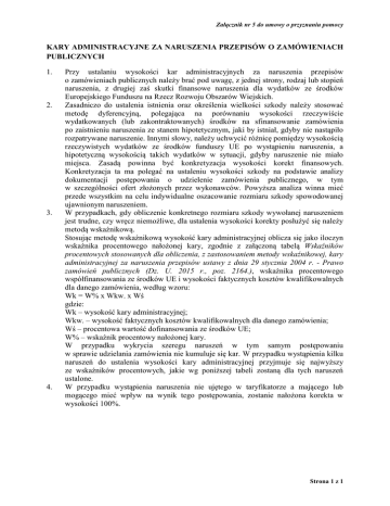 Załącznik nr 5 do umowy o przyznaniu pomocy KARY ADMINISTRACYJNE ZA NARUSZENIA PRZEPISÓW O ZAMÓWIENIACH PUBLICZNYCH 1. 2. 3. 4. Przy ustalaniu wysokości kar administracyjnych za naruszenia przepisów o zamówieniach publicznych należy brać pod uwagę, z jednej strony, rodzaj lub stopień naruszenia, z drugiej zaś skutki finansowe naruszenia dla wydatków ze środków Europejskiego Funduszu na Rzecz Rozwoju Obszarów Wiejskich. Zasadniczo do ustalenia istnienia oraz określenia wielkości szkody należy stosować metodę dyferencyjną, polegająca na porównaniu wysokości rzeczywiście wydatkowanych (lub zakontraktowanych) środków na sfinansowanie zamówienia po zaistnieniu naruszenia ze stanem hipotetycznym, jaki by istniał, gdyby nie nastąpiło rozpatrywane naruszenie. Innymi słowy, należy uchwycić różnicę pomiędzy wysokością rzeczywistych wydatków ze środków funduszy UE po wystąpieniu naruszenia, a hipotetyczną wysokością takich wydatków w sytuacji, gdyby naruszenie nie miało miejsca. Zasadą powinna być konkretyzacja wysokości korekt finansowych. Konkretyzacja ta ma polegać na ustaleniu wysokości szkody na podstawie analizy dokumentacji postępowania o udzielenie zamówienia publicznego, w tym w szczególności ofert złożonych przez wykonawców. Powyższa analiza winna mieć przede wszystkim na celu indywidualne oszacowanie rozmiaru szkody spowodowanej ujawnionym naruszeniem. W przypadkach, gdy obliczenie konkretnego rozmiaru szkody wywołanej naruszeniem jest trudne, czy wręcz niemożliwe, dla ustalenia wysokości korekty posłużyć się należy metodą wskaźnikową. Stosując metodę wskaźnikową wysokość kary administracyjnej oblicza się jako iloczyn wskaźnika procentowego nałożonej kary, zgodnie z załączoną tabelą Wskaźników procentowych stosowanych dla obliczenia, z zastosowaniem metody wskaźnikowej, kary administracyjnej za naruszenia przepisów ustawy z dnia 29 stycznia 2004 r. - Prawo zamówień publicznych (Dz. U. 2015 r., poz. 2164.), wskaźnika procentowego współfinansowania ze środków UE i wysokości faktycznych kosztów kwalifikowalnych dla danego zamówienia, według wzoru: Wk = W% x Wkw. x Wś gdzie: Wk – wysokość kary administracyjnej; Wkw. – wysokość faktycznych kosztów kwalifikowalnych dla danego zamówienia; Wś – procentowa wartość dofinansowania ze środków UE; W% – wskaźnik procentowy nałożonej kary. W przypadku wykrycia szeregu naruszeń w tym samym postępowaniu w sprawie udzielania zamówienia nie kumuluje się kar. W przypadku wystąpienia kilku naruszeń do ustalenia wysokości kary administracyjnej przyjmuje się najwyższy ze wskaźników procentowych, jakie wg poniższej tabeli zostaną dla tych naruszeń ustalone. W przypadku wystąpienia naruszenia nie ujętego w taryfikatorze a mającego lub mogącego mieć wpływ na wynik tego postępowania, zostanie nałożona korekta w wysokości 100%. Strona 1 z 1 Załącznik nr 5 do umowy o przyznaniu pomocy Wskaźniki procentowe stosowane dla obliczenia, z zastosowaniem metody wskaźnikowej, kary administracyjnej za naruszenia przepisów ustawy z dnia 29 stycznia 2004 r. - Prawo zamówień publicznych (Dz. U. z 2015 r. poz. 2164), zwanej dalej Pzp Rodzaj nieprawidłowości Lp. Stawka procentowa 1 Niedopełnienie obowiązku odpowiedniego ogłoszenia1) 100% Wysokość stawki może zostać obniżona do 25%2) 2 Niedopełnienie obowiązku 100% 1) 2) Opis nieprawidłowości związanych ze stosowaniem Pzp 1. Przetarg nieograniczony – naruszenie art. 40 ust. 3 Pzp. 2. Przetarg ograniczony – naruszenie art. 40 ust. 3 w związku z art. 48 ust.1 Pzp. 3. Negocjacje z ogłoszeniem – naruszenie art. 40 ust. 3 w związku z art. 56 ust. 1 Pzp. 4. Dialog konkurencyjny – naruszenie art. 40 ust. 3 w związku z art. 60c ust. 1 Pzp. 5. Konkurs – naruszenie art. 115 ust. 4 Pzp - poprzez niedopełnienie obowiązku przekazania ogłoszenia o zamówieniu UPUE, przy jednoczesnym niezamieszczeniu ogłoszenia o zamówieniu w BZP i niezapewnieniu odpowiedniego poziomu upublicznienia, które umożliwiałoby oferentom z innych państw członkowskich UE zapoznanie się z ogłoszeniem w szczególności: - na stronie internetowej zamawiającego, - na ogólnodostępnym portalu przeznaczonym do publikacji ogłoszeń o zamówieniach, - w dzienniku lub czasopiśmie o zasięgu ogólnopolskim. 6. Punkty 1–5 stosuje się odpowiednio do wymienionych w tych punktach przypadków naruszeń przywołanych przepisów w powiązaniu z naruszeniem art. 32 ust. 2 i 4 Pzp, tj. poprzez podział zamówienia na części lub zaniżenie jego wartości, które powodują, że wartość zamówienia jest mniejsza niż kwoty określone w przepisach wydanych na podstawie art. 11 ust. 8 Pzp. 1. Przetarg nieograniczony – naruszenie art. 40 ust. 2 Pzp. 2. Przetarg ograniczony – naruszenie art. 40 ust. 2 w związku z art. 48 ust. 1Pzp. Zamówienia o wartościach równych lub wyższych niż określone w przepisach wydanych na podstawie w art. 11 ust. 8 Pzp. W odniesieniu do umów zawieranych na podstawie Pzp wysokość wskaźnika może zostać obniżona do 25% w przypadku niedopełnienia obowiązku przekazania ogłoszenia o zamówieniu Urzędowi Publikacji Unii Europejskiej, zwanemu dalej „UPUE”, przy jednoczesnym zamieszczeniu ogłoszenia o zamówieniu w Biuletynie Zamówień Publicznych, zwanym dalej „BZP”, lub zapewnieniu odpowiedniego poziomu upublicznienia, które umożliwiałoby oferentom z innych państw członkowskich Unii Europejskiej zapoznanie się z ogłoszeniem, tj. przykładowo przynajmniej na jeden z następujących sposobów: na stronie internetowej zamawiającego, na ogólnodostępnym portalu przeznaczonym do publikacji ogłoszeń o zamówieniach, w dzienniku lub czasopiśmie o zasięgu ogólnopolskim Strona 2 z 9 Załącznik nr 5 do umowy o przyznaniu pomocy 3 4 5 odpowiedniego ogłoszenia3) Wysokość stawki może zostać obniżona do 25%4). Bezprawne udzielenie z