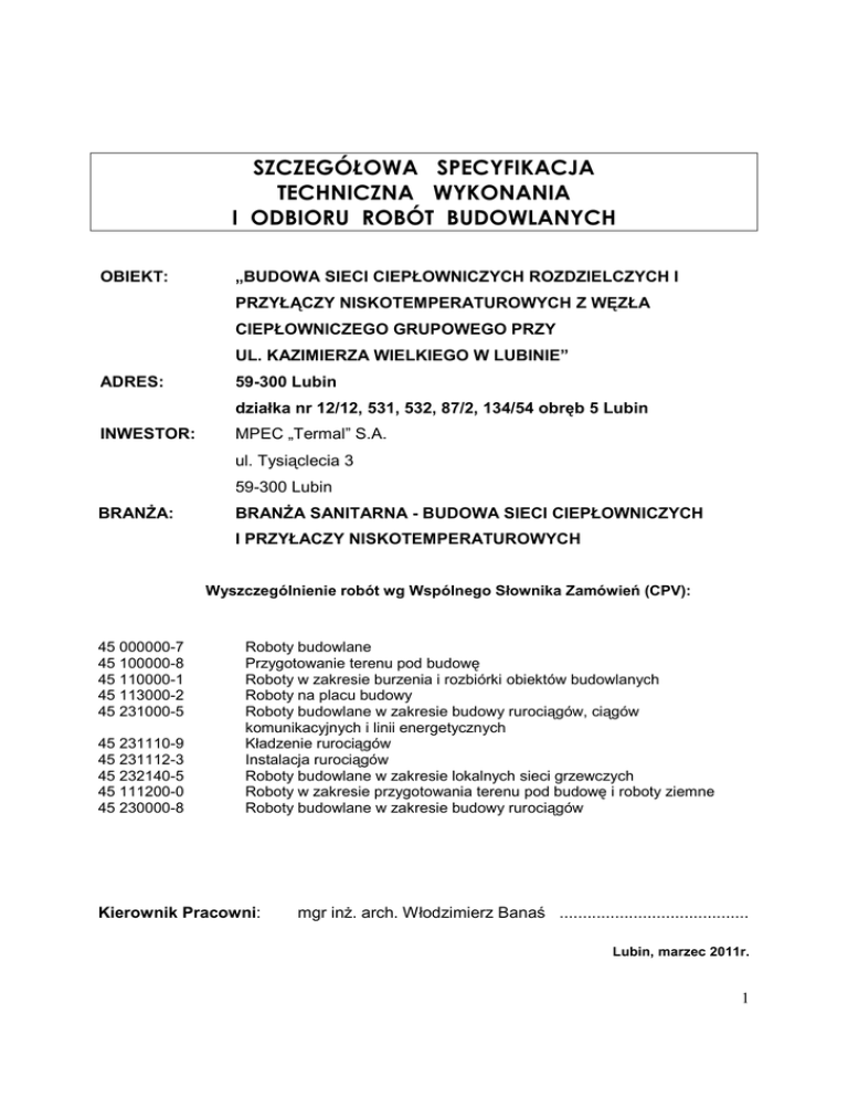 SZCZEGÓŁOWA SPECYFIKACJA TECHNICZNA WYKONANIA I ODBIORU ROBÓT BUDOWLANYCH OBIEKT: „BUDOWA SIECI CIEPŁOWNICZYCH ROZDZIELCZYCH I PRZYŁĄCZY NISKOTEMPERATUROWYCH Z WĘZŁA CIEPŁOWNICZEGO GRUPOWEGO PRZY UL. KAZIMIERZA WIELKIEGO W LUBINIE” ADRES: 59-300 Lubin działka nr 12/12, 531, 532, 87/2, 134/54 obręb 5 Lubin INWESTOR: MPEC „Termal” S.A. ul. Tysiąclecia 3 59-300 Lubin BRANśA: BRANśA SANITARNA - BUDOWA SIECI CIEPŁOWNICZYCH I PRZYŁACZY NISKOTEMPERATUROWYCH Wyszczególnienie robót wg Wspólnego Słownika Zamówień (CPV): 45 000000-7 45 100000-8 45 110000-1 45 113000-2 45 231000-5 45 231110-9 45 231112-3 45 232140-5 45 111200-0 45 230000-8 Roboty budowlane Przygotowanie terenu pod budowę Roboty w zakresie burzenia i rozbiórki obiektów budowlanych Roboty na placu budowy Roboty budowlane w zakresie budowy rurociągów, ciągów komunikacyjnych i linii energetycznych Kładzenie rurociągów Instalacja rurociągów Roboty budowlane w zakresie lokalnych sieci grzewczych Roboty w zakresie przygotowania terenu pod budowę i roboty ziemne Roboty budowlane w zakresie budowy rurociągów Kierownik Pracowni: mgr inŜ. arch. Włodzimierz Banaś ......................................... Lubin, marzec 2011r. 1 Zawartość opracowania SIECI I PRZYŁĄCZA CIEPŁOWNICZE Rozdział I WYZNACZANIE TRASY I PUNKTOW WYSOKOŚCIOWYCH Rozdział II WYKOPY W GRUNCIE NIESPOISTYM Rozdział III ZASYPANIE WYKOPÓW WRAZ Z ZAGĘSZCZENIEM Rozdział IV MONTAś RUROCIĄGÓW PREIZOLOWANYCH 2 Rozdział I WYZNACZANIE TRASY I PUNKTÓW WYSOKOŚCIOWYCH Przedmiot Specyfikacji Technicznej (ST) Zakres stosowania ST Zakres robót objętych ST Określenia podstawowe Ogólne wymagania dotyczące robót Materiały Transport Wykonanie robót Ogólne warunki wykonania robót Wyznaczenie punktów na osi Robocze punkty wysokościowe Wyznaczenie punktów wysokościowych i konturów wykopów Kontrola jakości robót Ogólne zasady kontroli jakości robót Sprawdzenie robót pomiarowych Obmiar robót Odbiór robót Przepisy związane 3 Rozdział I WYZNACZANIE TRASY I PUNKTOW WYSOKOŚCIOWYCH Przedmiot Szczegółowej Specyfikacji Technicznej (SST) Przedmiotem niniejszej specyfikacji technicznej są wymagania dotyczące wykonania i odbioru robót związanych z wykonaniem wyznaczenia osi trasy sieci i przyłączy ciepłowniczych, oraz punktów wysokościowych punktów charakterystycznych. Zakres stosowania SST Specyfikacja techniczna jest stosowana jako dokument przetargowy przy zlecaniu i realizacji robót wymienionych w punkcie 1.1. Zakres robót objętych ST Ustalenia zawarte w niniejszej specyfikacji obejmują wyznaczenie osi trasy sieci wraz punktami wysokościowymi dla sieci ciepłowniczej. Określenia podstawowe Określenia podane w niniejszej ST są zgodne z obowiązującymi polskimi normami Ogólne wymagania dotyczące robót Wykonawca robót jest odpowiedzialny za jakość ich wykonania oraz za zgodność z Dokumentacją Projektową, ST i poleceniami InŜyniera. Materiały Rodzaje materiałów Materiałami stosowanymi do wykonania wyznaczenia osi trasy i punktów wysokościowych są: tyczki, łaty, taśmy i inny sprzęt akceptowany przez InŜyniera. Sprzęt stosowany do wyznaczenia trasy i punktów wysokościowych powinien gwarantować uzyskanie wymaganej dokładności pomiaru. Transport Nie dotyczy. Wykonanie robót Ogólne warunki wykonania robót Prace pomiarowe powinny być wykonane zgodnie z obowiązującymi Instrukcjami Głównego Urzędu Geodezji i Kartografii (GUGiK). InŜynier dostarczy Wykonawcy materiały geodezyjne do wytyczenia w terenie punktów głównych osi trasy, skrzyŜowań oraz punkty wysokościowe (repery robocze). W oparciu o materiały dostarczone przez InŜyniera Wykonawca powinien przeprowadzić obliczenia i pomiary geodezyjne niezbędne do szczegółowego wytyczenia robót. Wyznaczenie punktów na osi Tyczenie osi trasy drogowej naleŜy wykonać w oparciu o Dokumentację Projektową przy wykorzystaniu sieci poligonizacji państwowej. Wyznaczone punkty na osi budowli nie powinny być przesunięte więcej niŜ o 3cm w stosunku do projektowanych, a rzędne punktów na osi naleŜy wyznaczyć z dokładnością do 1cm w stosunku do rzędnych projektu. 4 Robocze punkty wysokościowe NaleŜy wyznaczyć dwa robocze punkty wysokościowe. Punkty wysokościowe naleŜy wykonać poza granicami projektowanej budowli, a rzędne ich wyznaczyć z dokładnością do 0,5cm. Wyznaczenie punktów wysokościowych i konturów wykopów Wyznaczenie punktów wysokościowych i konturów wykopów polega na oznaczeniu połoŜenia w terenie krawędzi przecięcia powierzchni zewnętrznych skarp wykopów z terenem oraz określenie wysokościowych rzędnych punktów charakterystycznych sieci. Do wyznaczenia konturów wykopów naleŜy stosować dobrze widoczne paliki. Odległość między palikami naleŜy dostosować do ukształtowania terenu oraz geometrii trasy sieci. Odległość ta powinna odpowiadać odstępowi kolejnych przekrojów poprzecznych podanych w Dokumentacji Projektowej. Kontrola jakości robót Ogólne zasady kontroli jakości robót Kontrolę jakości prac pomiarowych związanych z odtworzeniem (wyznaczeniem) trasy i punktów wysokościowych naleŜy prowadzić wg ogólnych zasad określonych w instrukcjach i wytycznych GUGiK. Sprawdzenie robót pomiarowych Sprawdzenie robót pomiarowych powinno być przeprowadzone wg następujących zasad: oś drogi naleŜy sprawdzić na wszystkich załamaniach pionowych i krzywiznach w poziomie oraz na początku i końcu budowanego odcinka, robocze punkty wysokościowe naleŜy sprawdzić niwelatorem na całej długości budowanego odcinka, wyznaczenie nasypów i wykopów naleŜy sprawdzać taśmą i szablonem z poziomicą, co najmniej w 5 miejscach na kaŜdym kilometrze oraz w miejscach budzących wątpliwość. Obmiar robót Jednostką obmiarową robót związanych z odtworzeniem (wyznaczeniem) trasy w terenie jest 1km trasy sieci. Odbiór robót Odbiór Robót związanych