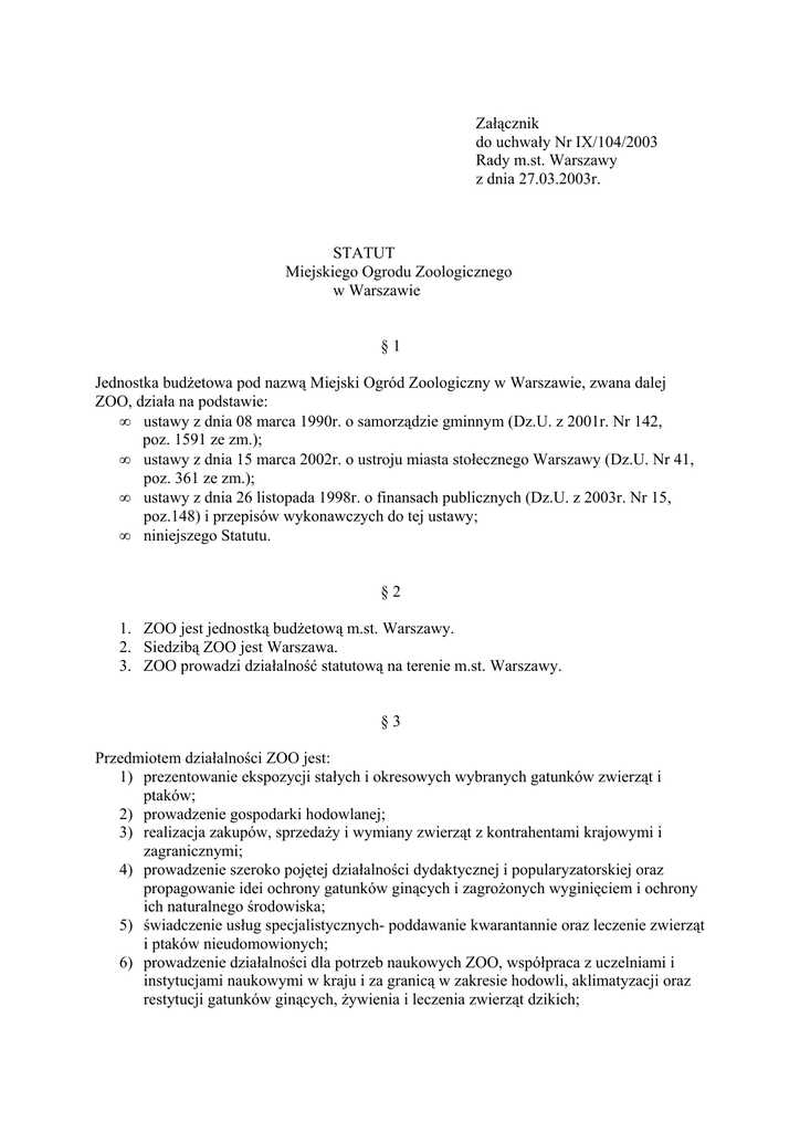 Załącznik do uchwały Nr IX/104/2003 Rady m.st. Warszawy z dnia 27.03.2003r. STATUT Miejskiego Ogrodu Zoologicznego w Warszawie §1 Jednostka budżetowa pod nazwą Miejski Ogród Zoologiczny w Warszawie, zwana dalej ZOO, działa na podstawie: • ustawy z dnia 08 marca 1990r. o samorządzie gminnym (Dz.U. z 2001r. Nr 142, poz. 1591 ze zm.); • ustawy z dnia 15 marca 2002r. o ustroju miasta stołecznego Warszawy (Dz.U. Nr 41, poz. 361 ze zm.); • ustawy z dnia 26 listopada 1998r. o finansach publicznych (Dz.U. z 2003r. Nr 15, poz.148) i przepisów wykonawczych do tej ustawy; • niniejszego Statutu. §2 1. ZOO jest jednostką budżetową m.st. Warszawy. 2. Siedzibą ZOO jest Warszawa. 3. ZOO prowadzi działalność statutową na terenie m.st. Warszawy. §3 Przedmiotem działalności ZOO jest: 1) prezentowanie ekspozycji stałych i okresowych wybranych gatunków zwierząt i ptaków; 2) prowadzenie gospodarki hodowlanej; 3) realizacja zakupów, sprzedaży i wymiany zwierząt z kontrahentami krajowymi i zagranicznymi; 4) prowadzenie szeroko pojętej działalności dydaktycznej i popularyzatorskiej oraz propagowanie idei ochrony gatunków ginących i zagrożonych wyginięciem i ochrony ich naturalnego środowiska; 5) świadczenie usług specjalistycznych- poddawanie kwarantannie oraz leczenie zwierząt i ptaków nieudomowionych; 6) prowadzenie działalności dla potrzeb naukowych ZOO, współpraca z uczelniami i instytucjami naukowymi w kraju i za granicą w zakresie hodowli, aklimatyzacji oraz restytucji gatunków ginących, żywienia i leczenia zwierząt dzikich; 7) tworzenie warunków organizacyjno-technicznych w celu rozwoju i utrzymania we właściwym stanie technicznych obiektów ZOO; 8) planowanie budowy i rozbudowy obiektów i urządzeń dla potrzeb działalności ZOO oraz nadzór nad projektowaniem i realizacją inwestycji; 9) prowadzenie innej odpłatnej działalności, w tym sprzedaży pamiątek i folderów, wynajmowanie i udostępnianie terenów i obiektów ZOO. §4 1. Działalnością ZOO kieruje jednoosobowo Dyrektor, Dyrektora zatrudnia i zwalnia Prezydent m.st. Warszawy. 2. W imieniu ZOO, który jest pracodawcą w rozumieniu prawa pracy, czynności z zakresu prawa pracy, wobec pracowników ZOO, dokonuje Dyrektor. 3. Dyrektor ustala szczegółową strukturę organizacyjną ZOO oraz zakres działania wewnętrznych komórek organizacyjnych. §5 1. Pracownicy ZOO wynagradzani są zgodnie z obowiązującym w ZOO regulaminem wynagradzania. 2. Regulamin wynagradzania ZOO ustala Dyrektor. Zasady wynagradzania określone regulaminem wynagradzania, nie mogą stanowić podstawy do przekroczenia limitu środków na wynagrodzenia przewidzianych w rocznych planach finansowych ZOO. §6 Do zakresu działania Dyrektora ZOO należy w szczególności: 1) kierowanie działalnością ZOO i zapewnienie jego prawidłowego funkcjonowania; 2) reprezentowanie ZOO wobec władz, dzielnic m.st. Warszawy, instytucji, organizacji oraz osób trzecich w granicach udzielonego upoważnienia przez Prezydenta m.st. Warszawy; 3) składanie w imieniu m.st. Warszawy oświadczeń woli w zakresie praw i obowiązków majątkowych do wysokości kwot określonych w planach finansowych ZOO, w granicach udzielonego przez Prezydenta m.st. Warszawy pełnomocnictwa. §7 1. Dyrektor kieruje ZOO przy pomocy zastępcy i głównego księgowego. 2. Zastępcę dyrektora i głównego księgowego zatrudnia i zwalnia Dyrektor. §8 1. Przy ZOO funkcjonuje Rada Naukowa jako organ opiniodawczo-doradczy. 2. Przewodniczącego Rady i członków Rady powołuje i odwołuje Prezydent m.st. Warszawy. §9 1. ZOO prowadzi gospodarkę finansową według zasad określonych dla jednostek budżetowych. 2. Podstawą gospodarki finansowej ZOO jest roczny plan finansowy obejmujący dochody i wydatki. 3. ZOO prowadzi rachunkowość i sprawozdawczość zgodnie z obowiązującymi przepisami. § 10 Zasady prowadzenia kontroli oraz obieg dokumentów finansowo-księgowych, na wniosek głównego księgowego ustala Dyrektor, stosownie do obowiązujących przepisów. § 11 Zmiany w statucie ZOO dokonuje Rada m.st. Warszawy na wniosek Prezydenta m.st. Warszawy.