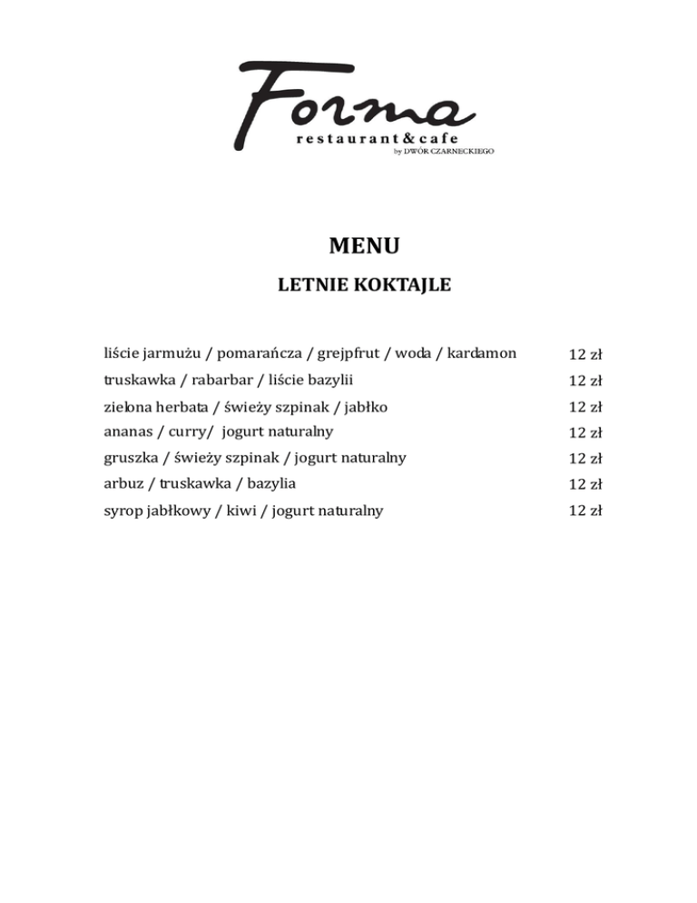 MENU LETNIE KOKTAJLE liście jarmużu / pomarańcza / grejpfrut / woda / kardamon 12 zł truskawka / rabarbar / liście bazylii 12 zł zielona herbata / świeży szpinak / jabłko 12 zł ananas / curry/ jogurt naturalny 12 zł gruszka / świeży szpinak / jogurt naturalny 12 zł arbuz / truskawka / bazylia 12 zł syrop jabłkowy / kiwi / jogurt naturalny 12 zł MENU SUMMER COCKTAILS kale leaves / orange / grapefruit / water / cardamom 12 zł strawberry / rhubarb / basil leaves 12 zł green tea / fresh spinach / apple 12 zł pineapple / curry/ natural yoghurt 12 zł pear / fresh spinach/ natural yoghurt 12 zł watermelon / strawberry / basil 12 zł apple syrup / kiwi / natural yoghurt 12 zł