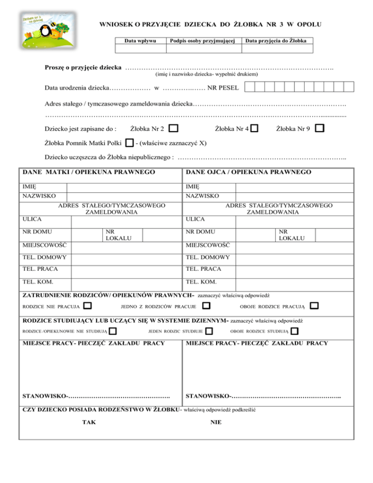 WNIOSEK O PRZYJĘCIE DZIECKA DO ŻŁOBKA NR 3 W OPOLU