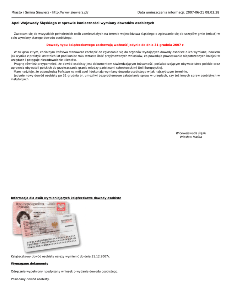 Miasto i Gmina Siewierz - http://www.siewierz.pl/ Data umieszczenia informacji: 2007-06-21 08:03:38 Apel Wojewody Śląskiego w sprawie konieczności wymiany dowodów osobistych Zwracam się do wszystkich pełnoletnich osób zamieszkałych na terenie województwa śląskiego o zgłaszanie się do urzędów gmin (miast) w celu wymiany starego dowodu osobistego. Dowody typu książeczkowego zachowują ważność jedynie do dnia 31 grudnia 2007 r. W związku z tym, chciałbym Państwa stanowczo zachęcić do zgłaszania się do organów wydających dowody osobiste o ich wymianę, bowiem jak wynika z praktyki ostatnich lat pod koniec roku wzrasta ilość przyjmowanych wniosków, co powoduje powstawanie niepotrzebnych kolejek w urzędach i potęguje niezadowolenie klientów. Pragnę również przypomnieć, że dowód osobisty jest dokumentem stwierdzającym tożsamość, poświadczającym obywatelstwo polskie oraz uprawnia obywateli polskich do przekraczania granic między państwami członkowskimi Unii Europejskiej. Mam nadzieję, że odpowiedzą Państwo na mój apel i dokonają wymiany dowodu osobistego w jak najszybszym terminie. Jedynie nowy dowód osobisty po 31 grudnia br. umożliwi bezproblemowe załatwianie spraw w urzędach, czy też innych spraw osobistych w instytucjach. Wicewojewoda śląski Wiesław Maśka Informacja dla osób wymieniających książeczkowe dowody osobiste Książeczkowy dowód osobisty należy wymienić do dnia 31.12.2007r. Wymagane dokumenty Odręcznie wypełniony i podpisany wniosek o wydanie dowodu osobistego. Posiadany dowód osobisty. Załączniki: - 2 aktualne, wyraźne i jednakowe fotografie o wymiarach 35 x 45 mm, przedstawiające osobę bez nakrycia głowy i okularów z ciemnymi szkłami w taki sposób, aby ukazywały głowę w pozycji lewego półprofilu i z widocznym lewym uchem, z zachowaniem równomiernego oświetlenia twarzy. Osoba z wrodzonymi lub nabytymi wadami narządu wzroku może załączyć do wniosku fotografie przedstawiające osobę w okularach z ciemnymi szkłami, a osoba nosząca nakrycie głowy zgodnie z zasadami swojego wyznania – fotografie przedstawiające osobę z nakryciem głowy. Dokumentem poświadczającym uprawnienie do załączenia fotografii przedstawiającej osobę w okularach z ciemnymi szkłami jest orzeczenie o niepełnosprawności natomiast przedstawiającej osobę w nakryciu głowy jest zaświadczenia o przynależności do wspólnoty wyznaniowej, ■ ■ ■ ■ odpis skrócony aktu urodzenia – w przypadku osób, które nie wstąpiły w związek małżeński ( z wyjątkiem osób urodzonych w gminie załatwiającej wniosek), odpis skrócony aktu małżeństwa wraz z adnotacją o aktualnie używanym nazwisku ( z wyjątkiem osób, które zawarły związek małżeński w gminie, gdzie załatwiany jest wniosek). dowód wniesienia opłaty za wydanie dowodu osobistego, na żądanie organu – poświadczenie obywatelstwa polskiego lub inny dokument poświadczający obywatelstwo polskie. Poświadczenie obywatelstwa wydaje właściwy wojewoda – według miejsca zamieszkania (obecnego bądź w przypadku jego braku – ostatniego). Miejsce złożenia dokumentów Wniosek należy złożyć osobiście w urzędzie gminy właściwej ze względu na miejsce zameldowania stałego a w razie jego braku, według ostatniego miejsca pobytu stałego. W przypadku gdy nie można ustalić miejsca ostatniego pobytu stałego, dowód osobisty wydaje organ gminy właściwy dla obszaru dzielnicy Śródmieście w m. st. Warszawie. Wniosek można składać za pośrednictwem organu gminy właściwego ze względu na miejsce pobytu czasowego wnioskodawcy, jeżeli jego złożenie we właściwym organie gminy nie jest możliwe. Opłaty Opłata za wydanie dowodu osobistego wynosi 30,- zł.(trzydzieści złotych) – płatne na konto wystawcy dowodu osobistego. Podstawa prawna Ustawa z dnia 10 kwietnia 1974 r. o ewidencji ludności i dowodach osobistych ( Dz. U. z 2006r., Nr 139, poz. 993 z późn. zm.), rozporządzenie Rady Ministrów z dnia 21 listopada 2000 r. w sprawie wzoru dowodu osobistego oraz trybu postępowania w sprawach wydawania dowodów osobistych, ich wymiany, zwrotu lub utraty (Dz. U. z 2000r., Nr 112, poz. 1182 z późn. zm.), rozporządzenie Rady Ministrów z dnia 30 listopada 2000 r. w sprawie opłaty za wydanie dowodu osobistego (Dz. U. z 2000r., Nr 105, poz. 1110 z późn. zm.). Źródło: Śląski Urząd Wojewódzki (http://www.katowice.uw.gov.pl) Urząd Miasta i Gminy Siewierz, 42-470 Siewierz, ul. Żwirki i WIgury 16, tel. 32 64 99 400, e-mail: [email protected] Burmistrz Miasta i Gminy Siewierz mgr Zdzisław Banaś