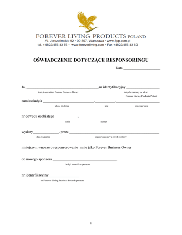 OŚWIADCZENIE DOTYCZĄCE RESPONSORINGU Data ____________________ Ja, _______________________________________,nr identyfikacyjny __________________ imię i nazwisko Forever Business Owner dotychczasowy nr ident. Forever Living Products Poland zamieszkały/a ______________________________,____________,__________________________ kod ulica, nr domu miejscowość nr dowodu osobistego ____________, _______________________ seria numer wydany______________, przez _________________________________________________ data wydania organ wydający dowód osobisty niniejszym wnoszę o responsorowanie mnie jako Forever Business Owner do nowego sponsora ______________________________________, imię i nazwisko sponsora nr identyfikacyjny __________________ nr Forever Living Products Poland sponsora 1 Jednocześnie oświadczam i potwierdzam co następuje: 1. Obecnie moim sponsorem jest _____________________________________, imię i nazwisko sponsora nr identyfikacyjny _________________ nr Forever Living Products Poland sponsora 2. W ciągu ostatnich dwudziestu czterech (24) miesięcy nie zakupiłem/am, bezpośrednio lub pośrednio, żadnych produktów Forever Living Products z żadnego źródła w kraju ani za granicą. 3. W ciągu ostatnich dwudziestu czterech (24) miesięcy nie sprzedałem/am żadnych produktów Forever Living Products w kraju ani za granicą. 4. W ciągu ostatnich dwudziestu czterech (24) miesięcy nie zasponsorowałem/am żadnych osób do Forever Living Products w kraju ani za granicą. 5. W ciągu ostatnich dwudziestu czterech (24) miesięcy nie składałem/am wniosku o jakiekolwiek zmiany w moim statusie Forever Business Owner . 6. Nigdy nie otrzymałem/am od nikogo wynagrodzenia w jakiejkolwiek formie za powstrzymanie się od działalności jako Forever Business Owner . 7. Przyjmuję do wiadomości, że po responsoringu nie zachowam grupy swoich Forever Business Owners i uprzednio uzyskanej pozycji w Planie Marketingowym oraz , że utracę wszystkie dotychczas uzyskane prawa wynikające z Planu Marketingowego Forever Living Products , zarówno w kraju jak i za granicą. Niniejsze przerejestrowanie oznacza, że działalność rozpocznę na stanowisku Nowego Dystrybutora w Planie Marketingowym Forever Living Products we wszystkich krajach, gdzie Forever Living Products prowadzi działalność operacyjną. ____________________ podpis Forever Business Owner Potwierdzenie notarialne : 2