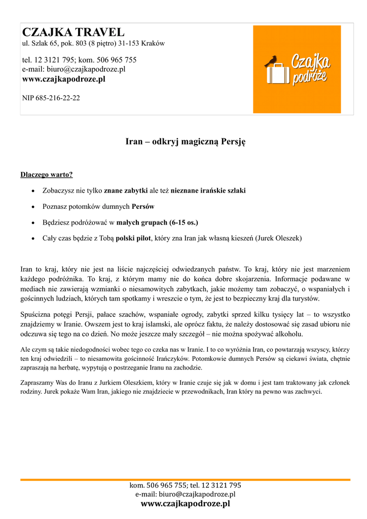 CZAJKA TRAVEL ul. Szlak 65, pok. 803 (8 piętro) 31-153 Kraków tel. 12 3121 795; kom. 506 965 755 e-mail: [email protected] www.czajkapodroze.pl NIP 685-216-22-22 Iran – odkryj magiczną Persję Dlaczego warto? Zobaczysz nie tylko znane zabytki ale też nieznane irańskie szlaki Poznasz potomków dumnych Persów Będziesz podróżować w małych grupach (6-15 os.) Cały czas będzie z Tobą polski pilot, który zna Iran jak własną kieszeń (Jurek Oleszek) Iran to kraj, który nie jest na liście najczęściej odwiedzanych państw. To kraj, który nie jest marzeniem każdego podróżnika. To kraj, z którym mamy nie do końca dobre skojarzenia. Informacje podawane w mediach nie zawierają wzmianki o niesamowitych zabytkach, jakie możemy tam zobaczyć, o wspaniałych i gościnnych ludziach, których tam spotkamy i wreszcie o tym, że jest to bezpieczny kraj dla turystów. Spuścizna potęgi Persji, pałace szachów, wspaniałe ogrody, zabytki sprzed kilku tysięcy lat – to wszystko znajdziemy w Iranie. Owszem jest to kraj islamski, ale oprócz faktu, że należy dostosować się zasad ubioru nie odczuwa się tego na co dzień. No może jeszcze mały szczegół – nie można spożywać alkoholu. Ale czym są takie niedogodności wobec tego co czeka nas w Iranie. I to co wyróżnia Iran, co powtarzają wszyscy, którzy ten kraj odwiedzili – to niesamowita gościnność Irańczyków. Potomkowie dumnych Persów są ciekawi świata, chętnie zapraszają na herbatę, wypytują o postrzeganie Iranu na zachodzie. Zapraszamy Was do Iranu z Jurkiem Oleszkiem, który w Iranie czuje się jak w domu i jest tam traktowany jak członek rodziny. Jurek pokaże Wam Iran, jakiego nie znajdziecie w przewodnikach, Iran który na pewno was zachwyci. kom. 506 965 755; tel. 12 3121 795 e-mail: [email protected] www.czajkapodroze.pl PROGRAM 1 dzień: Wylot z Polski do Teheranu (z przesiadką w jednym z europejskich lub azjatyckich portów lotniczych) 2 dzień: TEHERAN – KOM - KASZAN Po przylocie do Teheranu nad ranem, przejazd do Kaszanu przez Kom, jedno z najświętszych miast Iranu z mauzoleum Fatimy Masuleh, najważniejszej świętej szyickiej. W Kaszan zobaczymy stare miasto z krętymi uliczkami, domami bogatych kupców, pięknym bazarem i tradycyjnym ogrodem Fin. 3 dzień: KASZAN - ISFAHAN Przejazd do Isfahanu, po drodze odwiedzimy Abianeh, malowniczą wioskę w górach z uroczymi zaułkami, słynąca z tego że panie noszą się tam bardzo kolorowo. 4 dzień: ISFAHAN Isfahan, dawna stolica z jednym z największych placów świata Naqsz-e Dżahan (czyli wzór świata). Piękne, pokryte mozaikami meczety, pałace, średniowieczne mosty, ormiańska dzielnica Dżolfa z malowanymi kościołami a przede wszystkim jeden z najwspanialszych w Iranie bazarów. To wszystko i o wiele więcej zobaczymy podczas naszego pobytu w tym niesamowitym mieście. 5 dzień: ISFAHAN – NAIN - GARMEH Przez Nain gdzie zobaczymy jeden z najstarszych meczetów w Iranie a być może i podziemny młyn, jedziemy do Garmeh, oazy na pustyni Daszt e Kawir, gdzie zamieszkamy w czarującym tradycyjnym domu. 6 dzień: GARMEH Spacer po oazie i okolicach, wycieczka jeepem na piaszczyste wydmy pustyni. 7 dzień: GARMEH - JAZD Dziś wyruszymy do Jazd. Po drodzę odwiedzimy Czak Czak, najważniejszą w Iranie świątynię zaratusztriańską, oraz niesamowitą opuszczoną wioskę Charanak. 8 dzień: JAZD Jazd, najpiękniejsze z miast na pustyni z krętymi zaułkami, badgirami czyli wieżami wiatrowymi zapewniającymi od setek lat dopływ chłodnego powietrza do domów oraz kanatami czyli podziemnymi kanałami sprowadzającymi wodę do miasta z odległych o kilkadziesiąt kilometrów gór. Odwiedzimy też zurchane, czyli tradycyjną perską siłownię. 9 dzień: JAZD - MEJMAND Po drodze do Mejmand odwiedzimy stary XVII-wieczny karawaseraj zamieniony na hotel. Mejmand wioska troglodytów, gdzie do dziś wielu ludzi ciągle mieszka w jaskiniach. Zamieszkamy w oryginalnym hotelu w mieszkalnych jaskiniach. 10 dzień: MEJMAND - BAWANAT Przejazd do Bawanat gdzie zamieszkamy u tradycyjnej rodziny i, jeśli akurat będą w okolicy, odwiedzimy nomadów zamieszkujących pobliskie góry. kom. 506 965 755; tel. 12 3121 795 e-mail: [email protected] www.czajkapodroze.pl 11 dzień: BAWANAT – PERSEPOLIS - SZIRAZ Po drodze do Szirazu zwiedzimy najważniejsze starożytne ruiny w Iranie: Persepolis, Pasargady i Naqsz-e Rostam, zwane perską doliną królów. Wśród starożytnych ruin będziemy się starali wyobrazić sobie stolicę pierwszego w historii świata imperium z którego władali Cyrrus, Dariusz i Kserkses. 12 dzień: SZIRAZ Sziraz, miasto poetów z pięknymi ogrodami gdzie pochowani są najwięksi z nich Hafez i Saadi. Olśniewające mauzoleum Szach Czarach, jedno z najświętszych miejsc pielgrzymkowych. A ponadto oczywiście piękny stary bazar i meczet Nasir al Molk z przepięknymi mozaikami i witrażami z zaczarowaną grą światła. Przejazd do Teheranu nocnym pociągiem. 13 dzień: TEHERAN Teheran, 15-sto milionowa stolica Iranu przytłacza rozległością ale też nie jest to miasto zachwycające, zwłaszcza w porównaniu z innymi. Zobaczymy olśniewający pałac szachów Golestan, Muzeum Klejnotów, bazar a przede wszystkim po raz pierwszy zapoznamy się na teherańskich ulicach z irańską rzeczywistością. 14 dzień: TEHERAN Za pomocą kolejki linowej zdobędziemy wysoką na ponad 3900m górę Toczal w królujących nad Teheranem górach Alborz. Zwiedzimy piękny park i pałac szachów Saadabad oraz odwiedzimy polski cmentarz. 15 dzień: TEHERAN Czas wolny w Teheranie, ostatnie zakupy i pożegnanie z Iranem. 16 dzień: POŻEGNANIE Wylot z Teheranu do Polski. (Większość lotów z Teheranu jest w godzinach wczesnoporannych.) Kolejność zwiedzania może ulec zmianie. CENA OBEJMUJE: 14 noclegów zgodnie z programem ( 13 w hotelach, 1 w nocnym pociągu) 13 śniadań Transport w Iranie zgodnie z programem: klimatyzowany bus, nocny poc