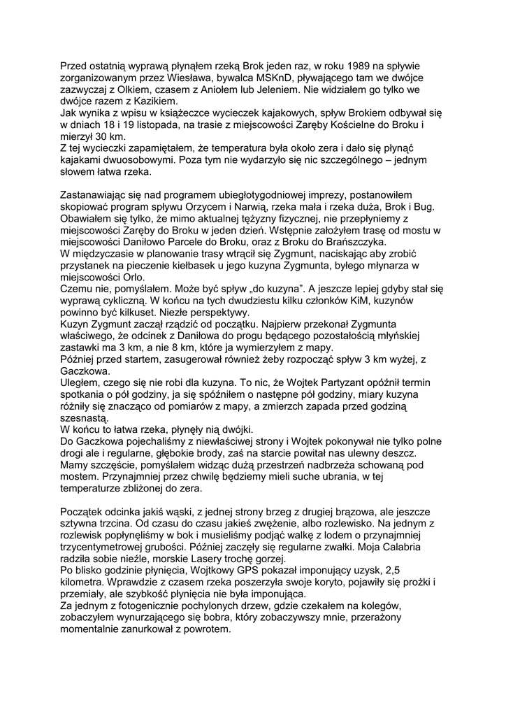 Przed ostatnią wyprawą płynąłem rzeką Brok jeden raz, w roku 1989 na spływie zorganizowanym przez Wiesława, bywalca MSKnD, pływającego tam we dwójce zazwyczaj z Olkiem, czasem z Aniołem lub Jeleniem. Nie widziałem go tylko we dwójce razem z Kazikiem. Jak wynika z wpisu w ksiąŜeczce wycieczek kajakowych, spływ Brokiem odbywał się w dniach 18 i 19 listopada, na trasie z miejscowości Zaręby Kościelne do Broku i mierzył 30 km. Z tej wycieczki zapamiętałem, Ŝe temperatura była około zera i dało się płynąć kajakami dwuosobowymi. Poza tym nie wydarzyło się nic szczególnego – jednym słowem łatwa rzeka. Zastanawiając się nad programem ubiegłotygodniowej imprezy, postanowiłem skopiować program spływu Orzycem i Narwią, rzeka mała i rzeka duŜa, Brok i Bug. Obawiałem się tylko, Ŝe mimo aktualnej tęŜyzny fizycznej, nie przepłyniemy z miejscowości Zaręby do Broku w jeden dzień. Wstępnie załoŜyłem trasę od mostu w miejscowości Daniłowo Parcele do Broku, oraz z Broku do Brańszczyka. W międzyczasie w planowanie trasy wtrącił się Zygmunt, naciskając aby zrobić przystanek na pieczenie kiełbasek u jego kuzyna Zygmunta, byłego młynarza w miejscowości Orlo. Czemu nie, pomyślałem. MoŜe być spływ „do kuzyna”. A jeszcze lepiej gdyby stał się wyprawą cykliczną. W końcu na tych dwudziestu kilku członków KiM, kuzynów powinno być kilkuset. Niezłe perspektywy. Kuzyn Zygmunt zaczął rządzić od początku. Najpierw przekonał Zygmunta właściwego, Ŝe odcinek z Daniłowa do progu będącego pozostałością młyńskiej zastawki ma 3 km, a nie 8 km, które ja wymierzyłem z mapy. Później przed startem, zasugerował równieŜ Ŝeby rozpocząć spływ 3 km wyŜej, z Gaczkowa. Uległem, czego się nie robi dla kuzyna. To nic, Ŝe Wojtek Partyzant opóźnił termin spotkania o pół godziny, ja się spóźniłem o następne pół godziny, miary kuzyna róŜniły się znacząco od pomiarów z mapy, a zmierzch zapada przed godziną szesnastą. W końcu to łatwa rzeka, płynęły nią dwójki. Do Gaczkowa pojechaliśmy z niewłaściwej strony i Wojtek pokonywał nie tylko polne drogi ale i regularne, głębokie brody, zaś na starcie powitał nas ulewny deszcz. Mamy szczęście, pomyślałem widząc duŜą przestrzeń nadbrzeŜa schowaną pod mostem. Przynajmniej przez chwilę będziemy mieli suche ubrania, w tej temperaturze zbliŜonej do zera. Początek odcinka jakiś wąski, z jednej strony brzeg z drugiej brązowa, ale jeszcze sztywna trzcina. Od czasu do czasu jakieś zwęŜenie, albo rozlewisko. Na jednym z rozlewisk popłynęliśmy w bok i musieliśmy podjąć walkę z lodem o przynajmniej trzycentymetrowej grubości. Później zaczęły się regularne zwałki. Moja Calabria radziła sobie nieźle, morskie Lasery trochę gorzej. Po blisko godzinie płynięcia, Wojtkowy GPS pokazał imponujący uzysk, 2,5 kilometra. Wprawdzie z czasem rzeka poszerzyła swoje koryto, pojawiły się proŜki i przemiały, ale szybkość płynięcia nie była imponująca. Za jednym z fotogenicznie pochylonych drzew, gdzie czekałem na kolegów, zobaczyłem wynurzającego się bobra, który zobaczywszy mnie, przeraŜony momentalnie zanurkował z powrotem. Od mostu w Daniłowie moŜna juŜ płynąć znacznie szybciej, wyraźny spadek, trasa praktycznie bez przeszkód, co chwilę odnoszę wraŜenie, Ŝe niedaleko musi być zastawka, po czym, widzę naturalne zwęŜenie rzeki z kępą traw pośrodku, bądź przemiałem albo kamienistym proŜkiem. I tak kilkanaście razy. Przed Orlo wysoki brzeg, linia kolejowa, most drogowy i wspomniany próg. Wojtkowy GPS pokazuje 12 km, które płynęliśmy od godziny 11.00 do 14.20. Obok progu gościnne gospodarstwo kuzyna. Wprawdzie tli się ognisko, ale kuzyn zdecydowanie zaprasza na zupę. Zupa, kiełbasa i inne dodatki. Później bułki nadziewane serem, prosto z pieca. Pychota. W międzyczasie opowieści z czasów PRL. Upaństwowienie młyna, oddanie młyna, poleceniu rozebrania młyna na własny koszt. Rozleniwiło nas to wszystko, ze juŜ nawet nikomu nie przyszło do głowy jakieś pływanie. Postanawiamy w przyszłym roku odwiedzić innego kuzyna. Nocleg w Broku i rano witamy Kamyka, szóstego uczestnika naszej imprezy. Z terenu Domu Wczasowego „Nadrzecze” schodzimy prosto do Bugu. Niebo jaśniejsze, nie ma deszczu ale na tej otwartej przestrzeni zimno odczuwamy bardziej niŜ na Broku. Długie, prawie proste odcinki rzeki, lekko podcięte brzegi, dopiero blisko połowy niedzielnej trasy brzeg obniŜa się, dochodzą do Bugu rozlewiska starorzecza i widać wędkarzy. W trakcie postoju pojawia się słońce. Ale i zaczyna wiać. Szybko kończymy postój i, za chwilę, nurt porywa nas w boczne koryto, chyba w kierunku Wywłoki. Dalej rzeka juŜ kręci, wiatr się wzmaga tak, Ŝe przed Brańszczykiem zaczynamy walczyć z falami. Spływ kończymy w lokalnym porcie. Na metę dopłynęliśmy nadzwyczaj szybko. Wojtkowy GPS odkrywa prawdę. Odcinek z Broku do Brańszczyka mierzy 31 km, a nie 37, które podaje przewodnik Jastrzębskiego. Stąd i tak szybkie przepłynięcie, 3 godz. 50 minut. Później dowiaduję się, Ŝe ta róŜnica to efekt ”prostowania” Bugu w latach siedemdziesiątych. Letman