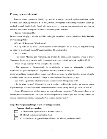Przeczytaj uważnie tekst. Poranne słońce zajrzało do dziecięcego pokoju, w którym smacznie spało rodzeństwo: mała, 5-letnia Kasia oraz jej starszy o 6 lat brat, Bartek. Promykiem delikatnie połaskotało dzieci po noskach, uszach i policzkach. Bartek pierwszy otworzył oczy, po czym przeciągnął się, ziewnął szeroko, spojrzał na wiszący na ścianie kalendarz i głośno zawołał: - Kaśka, wstawaj szybko! Dziewczynka półśpiąco usiadła na łóżku, odłożyła na poduszkę swoją ukochaną lalkę Dorotkę i wreszcie zapytała” - Czemu tak krzyczysz? Co się stało? - Co się stało, co się stało – przedrzeźniał siostrę chłopiec. To się stało, że zapomnieliśmy na śmierć o urodzinach mamy! Przecież dziś jest 28 października! - No i co teraz? - Nie wiem! Musimy coś wymyślić, ale prędko, bo mama dziś wcześniej wraca z pracy. Słyszałem, jak wczoraj mówiła tacie, że zamknie aptekę wcześniej, a nie jak zwykle o 17.00. - Może coś jej kupimy? Nowe kolczyki albo książkę? - Nie możemy….. Zapomniałaś, że w niedzielę w wesołym miasteczku wydaliśmy większość naszych oszczędności? W portfelu zostało kilkanaście złotych! Zmartwiona Kasia podparła głowę ręką i zamyślona spojrzała na lalkę Dorotkę, której sukienkę ozdabiały małe czerwone truskawki. Nagle podskoczyła radośnie i wykrzyknęła: - Już wiem! Upieczemy dla mamy ciasto truskawkowe! Albo pyszny tort! - To świetny pomysł! Ucieszył się brat i prędko podbiegł do regału, na którym mama trzymała swoje książki kucharskie. Przewertował kilka stron jednej z nich, po czym stwierdził: - Mam. Coś prostego, niedrogiego, a na pewno bardzo pysznego. Tylko muszę skoczyć do sklepu po kilka składników. Po czym triumfalnie podsunął siostrze pod nos książkę otwartą na stronie z przepisem zatytułowanym „Szybki torcik z truskawkami”. Na podstawie przeczytanego tekstu wykonaj polecenia. 1. Zaznacz zdanie prawdziwe. A. Bohaterami opowiadania są Kasia i Dorotka. B. Bartek jest starszym bratem Kasi. C. Rodzeństwo przypomniało sobie rano, że właśnie jest Dzień Matki. 1 2. Gdzie pracuje mama dzieci? A. w aptece B. w pobliskim sklepie C. w wesołym miasteczku 3. Jaką niespodziankę zaplanowały dzieci dla mamy? A. Postanowiły, że kupią jej książkę. B. Postanowiły upiec dla niej truskawkowy tort. C. Postanowiły zaprosić ją do wesołego miasteczka. 4. Co oznacza zwrot „zapomnieć o czymś na śmierć”? A. Pożegnać się z życiem. B. Śmiertelnie się wystraszyć. C. Zupełnie o czymś zapomnieć. 5. Co robił Bartek? Zaznacz właściwy zestaw wyrazów. A. przeciągnął się, ziewnął, zawołał B. podskoczyła, podparła, ozdabiały C. wydaliśmy, zapomnieliśmy, upiekliśmy 6. Nie jesteś pewien, czy dobrze rozumiesz, co oznaczają słowa: „przedrzeźniać” i „przewertować”. Gdzie możesz to sprawdzić? A. w encyklopedii szkolnej pt. „Świat przyrody” B. w „Słowniku języka polskiego” C. w „Słowniku polsko – angielskim” 7. Które wyrazy należą do tej samej rodziny co wyraz „książka”? A. kucharska, telefoniczna, przygodowa B. książę, księżniczka, księgowy C. książeczka, księga, księgarnia 2 8. Wyszukaj w tekście cztery przykłady rzeczowników w liczbie pojedynczej i napisz je w liczbie mnogiej. Liczba pojedyncza Liczba mnoga 9. Ułóż i napisz najpiękniejsze urodzinowe życzenia dla swojej mamy. 3