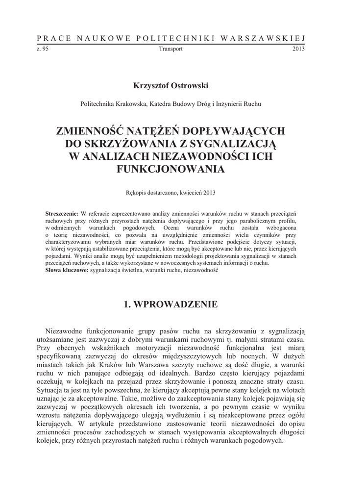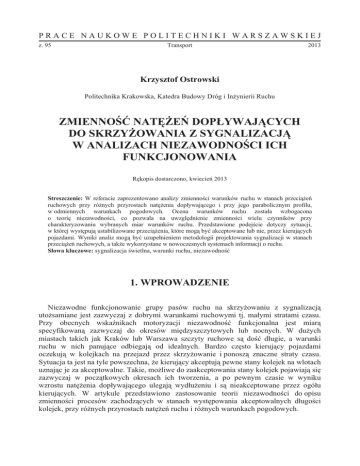 PRACE NAUKOWE POLITECHNIKI WARSZAWSKIEJ z. 95 Transport 2013 Krzysztof Ostrowski Politechnika Krakowska, Katedra Budowy Dróg i Inynierii Ruchu ZMIENNO NATE DOPYWAJCYCH DO SKRZYOWANIA Z SYGNALIZACJ W ANALIZACH NIEZAWODNOCI ICH FUNKCJONOWANIA Rkopis dostarczono, kwiecie 2013 Streszczenie: W referacie zaprezentowano analizy zmiennoci warunków ruchu w stanach przecie ruchowych przy rónych przyrostach natenia dopywajcego i przy jego parabolicznym profilu, w odmiennych warunkach pogodowych. Ocena warunków ruchu zostaa wzbogacona o teori niezawodnoci, co pozwala na uwzgldnienie zmiennoci wielu czynników przy charakteryzowaniu wybranych miar warunków ruchu. Przedstawione podejcie dotyczy sytuacji, w której wystpuj ustabilizowane przecienia, które mog by akceptowane lub nie, przez kierujcych pojazdami. Wyniki analiz mog by uzupenieniem metodologii projektowania sygnalizacji w stanach przecie ruchowych, a take wykorzystane w nowoczesnych systemach informacji o ruchu. Sowa kluczowe: sygnalizacja wietlna, warunki ruchu, niezawodno 1. WPROWADZENIE Niezawodne funkcjonowanie grupy pasów ruchu na skrzyowaniu z sygnalizacj utosamiane jest zazwyczaj z dobrymi warunkami ruchowymi tj. maymi stratami czasu. Przy obecnych wskanikach motoryzacji niezawodno funkcjonalna jest miar specyfikowan zazwyczaj do okresów midzyszczytowych lub nocnych. W duych miastach takich jak Kraków lub Warszawa szczyty ruchowe s do dugie, a warunki ruchu w nich panujce odbiegaj od idealnych. Bardzo czsto kierujcy pojazdami oczekuj w kolejkach na przejazd przez skrzyowanie i ponosz znaczne straty czasu. Sytuacja ta jest na tyle powszechna, e kierujcy akceptuj pewne stany kolejek na wlotach uznajc je za akceptowalne. Takie, moliwe do zaakceptowania stany kolejek pojawiaj si zazwyczaj w pocztkowych okresach ich tworzenia, a po pewnym czasie w wyniku wzrostu natenia dopywajcego ulegaj wydueniu i s nieakceptowane przez ogóu kierujcych. W artykule przedstawiono zastosowanie teorii niezawodnoci do opisu zmiennoci procesów zachodzcych w stanach wystpowania akceptowalnych dugoci kolejek, przy rónych przyrostach nate ruchu i rónych warunkach pogodowych. 392 Krzysztof Ostrowski 2. SKRZYOWANIA Z SYGNALIZACJ W WIETLE NIEZAWODNOCI OBIEKTÓW Pojcie niezawodnoci obiektów odnosi si zarówno do obiektów nieodnawialnych, jak i odnawialnych w czasie [9, 12]. Niezawodno obiektu jest to prawdopodobiestwo, e obiekt bdzie zdatny (sprawny) w zaoonym przedziale czasu (ti, ti+1). W rzeczywistoci mamy do czynienia zarówno z obiektami o skoczonej trwaoci (np. arówka, bateria), jak i z obiektami, których prawidowe funkcjonowanie w czasie poczone jest z okresami kolejnych odnów, tj. naprawy (np. samochód, pralka) a do czasu osignicia granicznej trwaoci i zniszczenia [7]. Na rys. 1. przedstawiono przykady teoretycznych, prostych procesów odnowy. Rys. 1. Przykady procesów odnowy [8]: a) proces odnowy natychmiastowej (z zerowym czasem odnowy), b) proces odnowy rzeczywistej (z niezerowym czasem odnowy) Specyfika funkcjonowania obiektów takich jak skrzyowania w stanach przecienia odbiega istotnie od pracy np. konstrukcji stalowych czy elbetowych pod wzgldem skutków przecie (rys. 2a), poniewa po rozadowaniu kolejki, skrzyowanie w okresie mniejszego ruchu znowu dziaa sprawnie. Pojcie odnowy obiektu moe odnosi si do odnowy teoretycznej, kiedy odnowiony obiekt ma niezawodno tak, jak mia bezporednio przed uszkodzeniem, i odnowy praktycznej, kiedy po utracie zdatnoci obiekt moe ponownie pracowa [7]. W odniesieniu do skrzyowa z sygnalizacj wietln i jakoci obsugi jest podobnie. Prawidowe funkcjonowanie sygnalizacji wietlnej wystpuje w okresach, gdy natenie dopywajce jest mniejsze od przepustowoci (Q<C). Okresy te (rys. 2b) dotycz zwykle godzin midzyszczytowych lub szczytów ruchowych na skrzyowaniach nieprzecionych ruchem (tj. od t1 do t2 itd.). Czasy odnowy utosamia mona z okresami wystpowania nieakceptowanych przecie wystpujcych najczciej w szczytach ruchowych (gdy Q>C, tj. od t0 do t1, od t2 do t3 itd.), jednak w tym przypadku „naprawa”, czyli odnowa funkcjonowania nastpowa bdzie w chwili, gdy zmniejsz si dugoci kolejek lub straty czasu do poziomu akceptowanego np. przez kierujcych pojazdami (momenty t1, t3, itd.). Jako warunków ruchu po okresie odnowy powróci wic do stanu przed okresem odnowy, co stanowi proces odnawialny z niezerowym czasem odnowy (rys. 1b). Funkcjonowania pasa ruchu mona zatem potraktowa jako proces odnawialny, rozumiany jako nastpujce po sobie przedziay czasu opisujce na przemian akceptowalne (T1, T2) i nieakceptowalne (U1, U2) stany warunków ruchu, czyli jako cig wielkoci T1, U1, T2, U2,..., Tn, Un. W takim ujciu odnow jest przywrócenie warunków moliwych do zaakceptowania. W oparciu o rys. 1b naszkicowano krzywe intensywnoci odnowy funkcjonalnej grupy pasów ruchu na skrzyowaniu z sygnalizacj wietln w dobie (rys. 2b). Zmienno nate dopywajcych do skrzyowania z sygnalizacj w analizach niezawodnoci … 393 Rys. 2. Przebieg intensywnoci uszkodze w obiekcie nieodnawialnym (a) oraz intensywnoci odnowy funkcjonalnej grupy pasów ruchu na skrzyowaniu z sygnalizacj w dobie (b) Z rys. 2b wynika e istnieje pewien teoretyczny moment, w którym nastpuje zmiana jakoci warunków ruchu i niezawodnoci funkcjonowania grupy pasów ruchu (momenty t0, t2, itd.). Moment ten moe by opisywany przez szereg miar uywanych w opisie warunków ruchu [13, 14], w tym poprzez graniczne wartoci strat czasu dgr, kolejek pozostajcych Kp,gr, maksymalnych Km,gr oraz inne miary zwizane z odczuciami kierujcych pojazdami tj. graniczn liczb cykli oczekiwania LTgr do momentu zjazdu ze skrzyowania lub graniczn wartoci czasu oczekiwania w kolejce na zjazd to,gr. Wybór miernika warunków ruchu uzaleniony bdzie od przeznaczenia analizy. W odmienny sposób funkcjonowanie grupy pasów ruchu ocenia bd zarzdzajcy ulicami i skrzyowaniami w miecie (eksperci) oraz kierujcy pojazdami z subiektywn ocen sytuacji. Najtrudniejszym problemem badawczym jest ocena czasu trwani