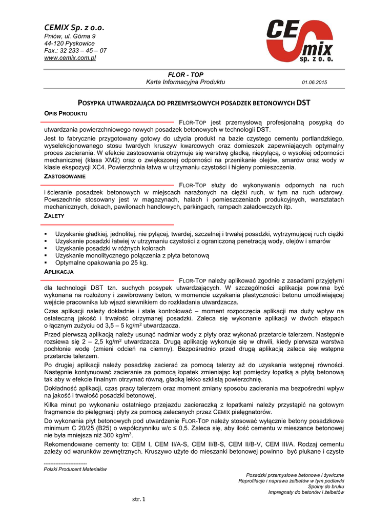 CEMIX Sp. z o.o. Pniów, ul. Górna 9 44-120 Pyskowice Fax.: 32 233 – 45 – 07 www.cemix.com.pl FLOR - TOP Karta Informacyjna Produktu 01.06.2015 POSYPKA UTWARDZAJĄCA DO PRZEMYSŁOWYCH POSADZEK BETONOWYCH DST OPIS PRODUKTU FLOR-TOP jest przemysłową profesjonalną posypką do utwardzania powierzchniowego nowych posadzek betonowych w technologii DST. Jest to fabrycznie przygotowany gotowy do użycia produkt na bazie czystego cementu portlandzkiego, wyselekcjonowanego stosu twardych kruszyw kwarcowych oraz domieszek zapewniających optymalny proces zacierania. W efekcie zastosowania otrzymuje się warstwę gładką, niepylącą, o wysokiej odporności mechanicznej (klasa XM2) oraz o zwiększonej odporności na przenikanie olejów, smarów oraz wody w klasie ekspozycji XC4. Powierzchnia łatwa w utrzymaniu czystości i higieny pomieszczenia. ZASTOSOWANIE FLOR-TOP służy do wykonywania odpornych na ruch i ścieranie posadzek betonowych w miejscach narażonych na ciężki ruch, w tym na ruch udarowy. Powszechnie stosowany jest w magazynach, halach i pomieszczeniach produkcyjnych, warsztatach mechanicznych, dokach, pawilonach handlowych, parkingach, rampach załadowczych itp. ZALETY Uzyskanie gładkiej, jednolitej, nie pylącej, twardej, szczelnej i trwałej posadzki, wytrzymującej ruch ciężki Uzyskanie posadzki łatwiej w utrzymaniu czystości z ograniczoną penetracją wody, olejów i smarów Uzyskanie posadzki w różnych kolorach Uzyskanie monolitycznego połączenia z płyta betonową Optymalne opakowania po 25 kg. APLIKACJA FLOR-TOP należy aplikować zgodnie z zasadami przyjętymi dla technologii DST tzn. suchych posypek utwardzających. W szczególności aplikacja powinna być wykonana na rozłożony i zawibrowany beton, w momencie uzyskania plastyczności betonu umożliwiającej wejście pracownika lub wjazd siewnikiem do rozkładania utwardzacza. Czas aplikacji należy dokładnie i stale kontrolować – moment rozpoczęcia aplikacji ma duży wpływ na ostateczną jakość i trwałość otrzymanej posadzki. Zaleca się wykonanie aplikacji w dwóch etapach o łącznym zużyciu od 3,5 – 5 kg/m2 utwardzacza. Przed pierwszą aplikacją należy usunąć nadmiar wody z płyty oraz wykonać przetarcie talerzem. Następnie rozsiewa się 2 – 2,5 kg/m2 utwardzacza. Drugą aplikację wykonuje się w chwili, kiedy pierwsza warstwa pochłonie wodę (zmieni odcień na ciemny). Bezpośrednio przed drugą aplikacją zaleca się wstępne przetarcie talerzem. Po drugiej aplikacji należy posadzkę zacierać za pomocą talerzy aż do uzyskania wstępnej równości. Następnie kontynuować zacieranie za pomocą łopatek zmieniając kąt pomiędzy łopatką a płytą betonową tak aby w efekcie finalnym otrzymać równą, gładką lekko szklistą powierzchnię. Dokładność aplikacji, czas pracy talerzem oraz moment zmiany sposobu zacierania ma bezpośredni wpływ na jakość i trwałość posadzki betonowej. Kilka minut po wykonaniu ostatniego przejazdu zacieraczką z łopatkami należy przystąpić na gotowym fragmencie do pielęgnacji płyty za pomocą zalecanych przez CEMIX pielęgnatorów. Do wykonania płyt betonowych pod utwardzenie FLOR-TOP należy stosować wyłącznie betony posadzkowe minimum C 20/25 (B25) o współczynniku w/c ≤ 0,5. Zaleca się, aby ilość cementu w mieszance betonowej nie była mniejsza niż 300 kg/m3. Rekomendowane cementy to: CEM I, CEM II/A-S, CEM II/B-S, CEM II/B-V, CEM III/A. Rodzaj cementu zależy od warunków zewnętrznych. Kruszywo użyte do mieszanki betonowej powinno być płukane i czyste -------------------------Polski Producent Materiałów Posadzki przemysłowe betonowe i żywiczne Reprofilacje i naprawa żelbetów w tym podlewki Spoiny do bruku Impregnaty do betonów i żelbetów str. 1 CEMIX Sp. z o.o. Pniów, ul. Górna 9 44-120 Pyskowice Fax.: 32 233 – 45 – 07 www.cemix.com.pl FLOR - TOP Karta Informacyjna Produktu 01.06.2015 o uziarnieniu do 16mm lub 32mm. Bezwzględnie nie należy stosować jako dodatków pyłów lotnych, mączek i cementów wapiennych oraz betonów napowietrzonych do wykonywania posadzek utwardzanych powierzchniowo. PARAMETRY TECHNICZNE 3,5 – 5 KG/M2 ZUŻYCIE WYTRZYMAŁOŚĆ NA ŚCISKANIE PO 28 DNIACH 90 MPA WYTRZYMAŁOŚĆ NA ZGINANIE PO 28 DNIACH 8 MPA WYTRZYMAŁOŚĆ NA ŚCIERANIE WEDŁUG TARCZY BOEHMEGO KLASA A6 ODPORNOŚĆ NA RUCH KÓŁ WÓZKÓW WIDŁOWYCH I „PALECIAKÓW” – RS1 METODA ITB BN-86/6781-02 PRZESIĄKLIWOŚĆ OLEJU PO 28 DNIACH METODA ITB 6 CM SŁUPA OLEJU ODPORNY PRZESIĄKLIWOŚĆ WODY PO 28 DNIACH <0,5 MM 0 MM WOREK 25 KG, PALETA 1000 KG OPAKOWANIE OD 5 DO 30OC ZAKRES STOSOWANIA DO 12 MIESIĘCY W SUCHYCH I CHŁODNYCH WARUNKACH SKŁADOWANIE PLATYNA, SZARY, GRAFIT, ZIELONY, CZERWONY ŻÓŁTY KOLORY POZOSTAŁE NA ZAMÓWIENIE PO WYKONANIU PRÓB MYCIE I KONSERWACJA ZGODNIE Z INSTRUKCJĄ PRODUCENTA Wyrób zgodny z PN-EN-13813, badanie w warunkach laboratoryjnych PIELĘGNACJA I EKSPLOATACJA Pielęgnację wykonuje się niezwłoczne po odczekaniu kilku minut po ostatnim przejechaniu zacieraczką z łopatkami. Pielęgnacji wykonuje się poprzez spryskanie całej posadzki jednym z zalecanych przez producenta preparatów pielęgnujących: FLOSIL, FLOSIL H, FLOSIL W lub FLOSIL C. Doboru pielęgnatora należy dokonać na podstawie warunków zewnętrznych oraz ogólnych uwarunkowań placu budowy. W szczególnych przypadkach na posadzce mogą pojawić się tzw. pęknięcia włoskowate. Nie obniżają one parametrów wytrzymałościowych posadzki i są typowym zjawiskiem dla posadzek betonowych. W początkowym okresie posadzka wykazuje silne przebarwienia, które w czasie dojrzewania płyty betonowej zanikają ujednolicając kolor. ŚRODKI OSTROŻNOŚCI FLOR-TOP zawiera cement portlandzki, który w kontakcie z wodą powoduje powstanie czynników silnie zasadowych, mogących powodować oparzenia, podrażnienia i wysypkę. Należy nosić odpowiednie ubranie, rękawice i okulary ochronne. W przypadku kontaktu 